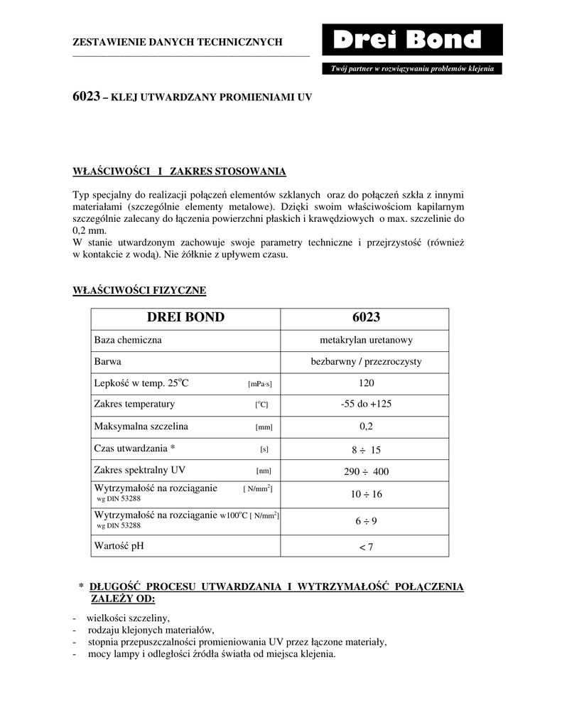Drei Bond ZESTAWIENIE DANYCH TECHNICZNYCH _______________________________________________________ Twój partner w rozwiązywaniu problemów klejenia 6023 – KLEJ UTWARDZANY PROMIENIAMI UV WŁAŚCIWOŚCI I ZAKRES STOSOWANIA Typ specjalny do realizacji połączeń elementów szklanych oraz do połączeń szkła z innymi materiałami (szczególnie elementy metalowe). Dzięki swoim właściwościom kapilarnym szczególnie zalecany do łączenia powierzchni płaskich i krawędziowych o max. szczelinie do 0,2 mm. W stanie utwardzonym zachowuje swoje parametry techniczne i przejrzystość (również w kontakcie z wodą). Nie żółknie z upływem czasu. WŁAŚCIWOŚCI FIZYCZNE DREI BOND 6023 Baza chemiczna metakrylan uretanowy Barwa Lepkość w temp. 25oC bezbarwny / przezroczysty [mPa·s] 120 Zakres temperatury [oC] -55 do +125 Maksymalna szczelina [mm] 0,2 [s] 8 ÷ 15 [nm] 290 ÷ 400 Czas utwardzania * Zakres spektralny UV Wytrzymałość na rozciąganie 2 [ N/mm ] wg DIN 53288 Wytrzymałość na rozciąganie w100oC [ N/mm2] 10 ÷ 16 wg DIN 53288 6÷9 Wartość pH <7 * DŁUGOŚĆ PROCESU UTWARDZANIA I WYTRZYMAŁOŚĆ POŁĄCZENIA ZALEŻY OD: - wielkości szczeliny, rodzaju klejonych materiałów, stopnia przepuszczalności promieniowania UV przez łączone materiały, mocy lampy i odległości źródła światła od miejsca klejenia. ZESTAWIENIE DANYCH TECHNICZNYCH Drei Bond _______________________________________________________ Twój partner w rozwiązywaniu problemów klejenia -strona 2- 6023 – KLEJ UTWARDZANY PROMIENIAMI UV SPOSÓB UŻYCIA • • • Powierzchnie klejone muszą być czyste, odtłuszczone i suche. Części należy łączyć bez docisku – do rozprowadzenia kleju między łączonymi częściami wystarczający jest ich ciężar. Po skorygowaniu pozycji łączonych elementów należy naświetlić miejsce klejenia źródłem światła UV o odpowiednim natężeniu i długości fali. Szczegółowe informacje o procesie klejenia zawarte są w „Instrukcji klejenia metodą UV” OKRES SKŁADOWANIA • • 6 miesięcy w temperaturze pokojowej. 12 miesięcy w chłodnym i suchym pomieszczeniu. ŚRODKI OSTROŻNOŚCI • Zawiera metakrylan. Może wywoływać podrażnienia błon śluzowych i skóry. Stosować w miejscach przewiewnych przez ekipy zawodowe wyposażone w odzież ochronną. W przypadku kontaktu z oczami należy przemyć je obficie wodą i zasięgnąć porady lekarza. Chronić przed dostępem dzieci. OPAKOWANIA • Butelki robocze • Opakowania przemysłowe 10 ml, 50 ml, 250ml 1ltr, 2ltr Firma DREI BOND oferuje urządzenia do kontrolowanej aplikacji klejów oraz promienniki światła UV. Wszystkie podane zalecenia i informacje są oparte na naszych własnych badaniach i jesteśmy przekonani, że są one wiarygodne. Nie możemy ręczyć za efekty zastosowania naszych produktów; produkty są sprzedawane, a próbki udostępniane bez gwarancji wyrażonej wprost czy też sugerującej, iż są przeznaczone do jakiegoś konkretnego zastosowania. Użytkownik powinien sam przeprowadzić testy potwierdzające przydatność produktu do własnych zastosowań. Żaden agent, przedstawiciel lub pracownik naszej firmy nie ma upoważnienia do zmiany tej klauzuli. Zapewniamy sobie możliwość zmiany treści wynikające z postępu technicznego. (05/2003)