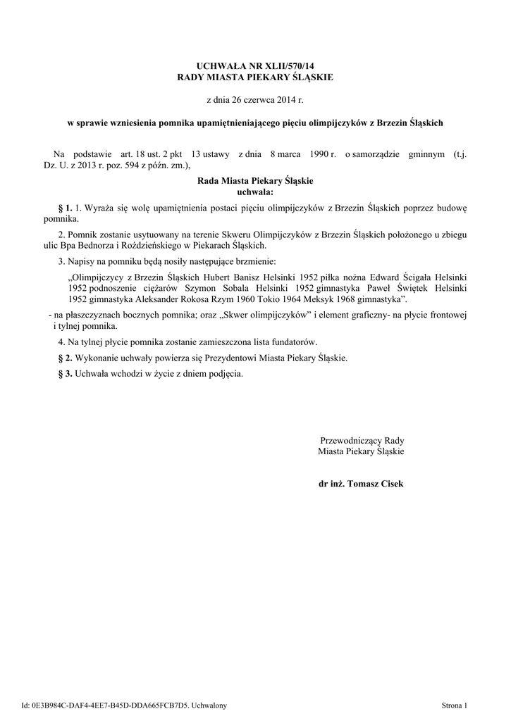 UCHWAŁA NR XLII/570/14 RADY MIASTA PIEKARY ŚLĄSKIE z dnia 26 czerwca 2014 r. w sprawie wzniesienia pomnika upamiętnieniającego pięciu olimpijczyków z Brzezin Śląskich Na podstawie art. 18 ust. 2 pkt 13 ustawy z dnia 8 marca 1990 r. o samorządzie gminnym (t.j. Dz. U. z 2013 r. poz. 594 z późn. zm.), Rada Miasta Piekary Śląskie uchwala: § 1. 1. Wyraża się wolę upamiętnienia postaci pięciu olimpijczyków z Brzezin Śląskich poprzez budowę pomnika. 2. Pomnik zostanie usytuowany na terenie Skweru Olimpijczyków z Brzezin Śląskich położonego u zbiegu ulic Bpa Bednorza i Roździeńskiego w Piekarach Śląskich. 3. Napisy na pomniku będą nosiły następujące brzmienie: „Olimpijczycy z Brzezin Śląskich Hubert Banisz Helsinki 1952 piłka nożna Edward Ścigała Helsinki 1952 podnoszenie ciężarów Szymon Sobala Helsinki 1952 gimnastyka Paweł Świętek Helsinki 1952 gimnastyka Aleksander Rokosa Rzym 1960 Tokio 1964 Meksyk 1968 gimnastyka”. - na płaszczyznach bocznych pomnika; oraz „Skwer olimpijczyków” i element graficzny- na płycie frontowej i tylnej pomnika. 4. Na tylnej płycie pomnika zostanie zamieszczona lista fundatorów. § 2. Wykonanie uchwały powierza się Prezydentowi Miasta Piekary Śląskie. § 3. Uchwała wchodzi w życie z dniem podjęcia. Przewodniczący Rady Miasta Piekary Śląskie dr inż. Tomasz Cisek Id: 0E3B984C-DAF4-4EE7-B45D-DDA665FCB7D5. Uchwalony Strona 1 Uzasadnienie Z postulatem budowy pomnika upamiętniającego pięciu olimpijczyków z Brzezin Śląskich zwrócił się Radny Rady Miasta Piekary Śląskie Tadeusz Wieczorek. Pomnik ma upamiętniać pięciu wybitnych sportowców, których nazwiska powinny być znane społeczeństwu: 1. Hubert Banisz (1928 - 1983) – piłkarz, reprezentant Polski, trener, olimpijczyk z Helsinek (1952), 2. Edward Ścigała (1926 – 1990) – ciężarowiec, reprezentant Polski, olimpijczyk z Helsinek (1952), 3. Szymon Sobala (1919 – 2009) – gimnastyk, trener , olimpijczyk z Helsinek (1952), 4. Paweł Świętek (1924 – 1989) – gimnastyk, trener, olimpijczyk z Helsinek (1952), 5. Aleksander Rokosa (1936 – 2000) – gimnastyk, trener, olimpijczyk z Rzymu (1960), Tokio (1964), Uchwałą nr XL/559/14 Rady Miasta Piekary Śląskie z dnia 8 maja 2014 r. nadano nazwę „Skwer Olimpijczyków z Brzezin Śląskich” placowi położonemu w Piekarach Śląskich u zbiegu ulic Roździeńskiego i Bpa Bednorza na działce nr 430/76, na którym planowane jest usytuowanie pomnika. Podjecie uchwały przez Radę Miasta w sprawie wzniesienia pomnika znajduje swoje umocowanie w przepisie art. 18 ust.2 pkt 13 ustawy z dnia 8 marca 1990 r. o samorządzie gminnym. Id: 0E3B984C-DAF4-4EE7-B45D-DDA665FCB7D5. Uchwalony Strona 1