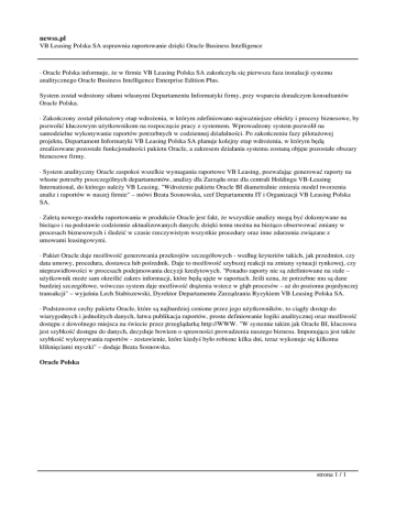 newss.pl VB Leasing Polska SA usprawnia raportowanie dzięki Oracle Business Intelligence · Oracle Polska informuje, że w firmie VB Leasing Polska SA zakończyła się pierwsza faza instalacji systemu analitycznego Oracle Business Intelligence Enterprise Edition Plus. System został wdrożony siłami własnymi Departamentu Informatyki firmy, przy wsparciu doradczym konsultantów Oracle Polska. · Zakończony został pilotażowy etap wdrożenia, w którym zdefiniowano najważniejsze obiekty i procesy biznesowe, by pozwolić kluczowym użytkownikom na rozpoczęcie pracy z systemem. Wprowadzony system pozwolił na samodzielne wykonywanie raportów potrzebnych w codziennej działalności. Po zakończeniu fazy pilotażowej projektu, Departament Informatyki VB Leasing Polska SA planuje kolejny etap wdrożenia, w którym będą zrealizowane pozostałe funkcjonalności pakietu Oracle, a zakresem działania systemu zostaną objęte pozostałe obszary biznesowe firmy. · System analityczny Oracle zaspokoi wszelkie wymagania raportowe VB Leasing, pozwalając generować raporty na własne potrzeby poszczególnych departamentów, analizy dla Zarządu oraz dla centrali Holdingu VB-Leasing International, do którego należy VB Leasing. "Wdrożenie pakietu Oracle BI diametralnie zmienia model tworzenia analiz i raportów w naszej firmie" – mówi Beata Sosnowska, szef Departamentu IT i Organizacji VB Leasing Polska SA. · Zaletą nowego modelu raportowania w produkcie Oracle jest fakt, że wszystkie analizy mogą być dokonywane na bieżąco i na podstawie codziennie aktualizowanych danych; dzięki temu można na bieżąco obserwować zmiany w procesach biznesowych i śledzić w czasie rzeczywistym wszystkie procedury oraz inne zdarzenia związane z umowami leasingowymi. · Pakiet Oracle daje możliwość generowania przekrojów szczegółowych - według kryteriów takich, jak przedmiot, czy data umowy, procedura, dostawca lub pośrednik. Daje to możliwość szybszej reakcji na zmiany sytuacji rynkowej, czy nieprawidłowości w procesach podejmowania decyzji kredytowych. "Ponadto raporty nie są zdefiniowane na stałe – użytkownik może sam określić zakres informacji, które będą ujęte w raportach. Jeśli uzna, że potrzebne mu są dane bardziej szczegółowe, wówczas system daje możliwość drążenia wstecz w głąb procesów – aż do poziomu pojedynczej transakcji" – wyjaśnia Lech Stabiszewski, Dyrektor Departamentu Zarządzania Ryzykiem VB Leasing Polska SA. · Podstawowe cechy pakietu Oracle, które są najbardziej cenione przez jego użytkowników, to ciągły dostęp do wiarygodnych i jednolitych danych, łatwa publikacja raportów, proste definiowanie logiki analitycznej oraz możliwość dostępu z dowolnego miejsca na świecie przez przeglądarkę http://WWW. "W systemie takim jak Oracle BI, kluczowa jest szybkość dostępu do danych, decyduje bowiem o sprawności prowadzenia naszego biznesu. Imponująca jest także szybkość wykonywania raportów - zestawienie, które kiedyś było robione kilka dni, teraz wykonuje się kilkoma kliknięciami myszki" – dodaje Beata Sosnowska. Oracle Polska strona 1 / 1