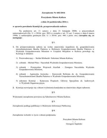 Zarządzenie Nr 602/2016 Prezydenta Miasta Kalisza z dnia 24 października 2016 r. w sprawie powołania Komisji ds. przeprowadzenia naboru Na podstawie art. 11 ustawy z dnia 21 listopada 2008r. o pracownikach samorządowych (Dz. U. z 2016r. poz. 902) w związku z art. 33 ust. 3 ustawy z dnia 8 marca 1990r. o samorządzie gminnym (Dz. U. z 2016r. poz. 446 z późn. zm.) zarządza się, co następuje: § 1. 1. Do przeprowadzenia naboru na wolne stanowisko inspektora ds. gospodarowania nieruchomościami Skarbu Państwa w Referacie Gospodarowania Skarbu Państwa w Wydziale Gospodarowania Mieniem w Urzędzie Miejskim w Kaliszu powołuje się Komisję w składzie: 1) Przewodniczący - Stefan Kłobucki- Sekretarz Miasta Kalisza, 2) członek – Michał Pilas - Naczelnik Wydziału Gospodarowania Mieniem, 3) członek – Przemysław Wojciech Józefiak – Zastępca Naczelnika Wydziału Gospodarowania Mieniem, 4) członek – Agnieszka Jeziorska – Kierownik Referatu ds. ds. Gospodarowania Nieruchomościami Skarbu Państwa w Wydziale Gospodarowania Mieniem, 5) sekretarz Komisji - Katarzyna Pospiech- Główny Specjalista ds. kadrowych w Wydziale Organizacyjnym. 2. Komisja rozwiązuje się z dniem wyłonienia kandydata na stanowisko objęte naborem. § 2. Wykonanie zarządzenia powierza się Sekretarzowi Miasta Kalisza. § 3. Zarządzenie podlega publikacji w Biuletynie Informacji Publicznej. § 4. Zarządzenie wchodzi w życie z dniem podpisania. Prezydent Miasta Kalisza /…/ Grzegorz Sapiński