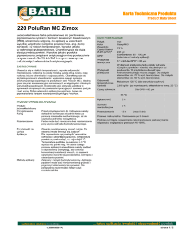 G GGGGGGGGGGGGGGGGG Karta Techniczna Produktu Product Data Sheet G G 220 PoluRan MC Zimox Jednoskadnikowa farba poliuretanowa do gruntowania, pigmentowana cynkiem i tlenkiem elazowym blaszkowatym (MIO), utwardzana wilgoci, do aplikacji w warunkach wysokiej wilgotnoci (wilgotne powierzchnie, ang. dump surfaces) i w niskich temperaturach. Wysoka jako w technologii grubopowokowe. Charakteryzuje si du elastycznoci powoki. Wysokiej jakoci powoka pigmentowana zwizkami antykorozyjnymi na powierzchnie oczyszczone do Sa 2½ lub St-2 i oczyszczanie rczne o doskonaych wasnociach antykorozyjnych. DANE PODSTAWOWE Poysk Kolor Zawarto Czci Staych ZLZO (VOC)* GPS* 73 % 250 g/l Standardowo: 60 - 100 m (zalenie od metody aplikacji) Wydajno teoretyczna 9,1 m2/l dla GPS* = 80 m Wydajno praktyczna Wydajno praktyczna farby zaley od wielu rónych czynników - równie niezalenych od producenta. W przyblieniu dla natrysku hydrodynamicznego mona przyj: Dla duych elementów: ok. 70 % wyd. teoretycznej. Dla maych elementów: ok. 50 % wyd. teoretycznej. ZASTOSOWANIE Utwardza si w niskich temperaturach, wysoka odporno mechaniczna. Odporna na wod morsk, wod pitn, cieki, rop naftow i róne chemikalia i rozpuszczalniki. Charakteryzuje si szybkim procesem utwardzania i wykonania caego systemu antykorozyjnego (opartego na produktach serii Poluran MC). Idealny grunt do prac konserwacyjno remontowych w wilgotnych i chodnych warunkach pogodowych. Doskonaa jako pierwsza warstwa w systemach okrtowych do powierzchni pracujcych zarówno pod jak i nad wod. Dobre wasnoci aplikacyjne pdzlem. atwa do przemalowania farbami nawierzchniowymi typu PoluRan. mat Szary/MIO Odporno temperaturowa Gsto Maksimum 120 °C (dla warunków suchych) 2,85 kg/litr (po wymieszaniu skadników w temp. 20 °C) Czasy schnicia: Dla GPS = 60 m 20 °C Pyosucho 2h Sucho manipulacyjna 7h Przemalowanie 12 h PRZYGOTOWANIE DO APLIKACJI Produkt jednoskadnikowy Przygotowanie Farby Rozcieczanie Przydatno do uycia Aplikacja Metody aplikacji Przed przystpieniem do malowania naley dokadnie wymiesza skadniki farby za pomoc mieszada mechanicznego, a do uzyskana jednolitej konsystencji. Farba moe by nanoszona bez rozcieczania przy uyciu natrysku hydrodynamicznego. (max 5 dni) Przerwa maksymalna: Piaskowanie po 5 dniach Podczas schnicia i utwardzania rekomendowane jest utrzymanie wilgotnoci wzgldnej w granicach 40-100%. Otwarte puszki powinny zosta zuyte. Po otwarciu moe tworzy si „kouch” Dla zapewnienia optymalnych* warunków schnicia i utwardzania powoki, temperatura powietrza powinna by, co najmniej 0 °C. Temperatura podoa, co najmniej o 3 °C wysza ni punkt rosy. W czasie caego procesu aplikacji i utwardzania naley zadba o odpowiedni wentylacj, aby unikn koncentracji substancji lotnych, co zapewni optymalne warunki bezpieczestwa, schnicia i utwardzania powoki. Zalecany: natrysk hydrodynamiczny. Aplikacja pdzlem moe da nierównomiern grubo i pogorszy efekt estetyczny powoki. Dla polepszenia rozlewnoci naley uy rozcieczalnika Sustainable solutions in coatings v.2009030001PL ... atwa aplikacja, trwao i niezawodno powok strona 1 / 2 GGG GGGGGGGGGGGGGGGGG Karta Techniczna Produktu Product Data Sheet G G220 PoluRan MC Zimox ZALECENIA APLIKACYJNE INFROMACJE DOTYCZCE BEZPIECZESTWA Oznaczenia Hydrodynamicznie Airmix Rozcieczalnik Zalecana ilo Rozmiar dyszy Cinienie robocze GPS* PU5801 5 % obj. 0,017 cala min 140 bar 60-100 μm PU5801 5 % obj. 0,017 cala min 70 bar 60-100 μm Natrysk Powietrzny Pdzel/Waek Rozcieczalnik Zalecana ilo Rozmiar dyszy Cinienie robocze GPS* PU5801 10 % obj. min 2-3 mm min 3-4 bar 60-100 μm S 5102 0-5 % obj. Szkodliwy i dranicy w kontakcie ze skór, oczami i drogami oddechowymi. W przypadku kontaktu z oczami, natychmiast przemy du iloci czystej wody i skontaktowa si z lekarzem. Nie je, nie pi oraz nie pali tytoniu podczas aplikacji. UN 1263 DANE UZUPENIAJCE Opakowania Puszki 5 litrowe . Rozcieczalnik w kanistrach 25 litrów lub beczkach 200 litrowych. Okres przechowywania W szczelnych oryginalnych opakowaniach 12 miesicy, przechowywane w temperaturach pomidzy 5 °C i 30 °C. Dodatkowe informacje dotyczce bezpieczestwa zawarte s w Karcie Charakterystyki Niebezpiecznego Preparatu Chemicznego: PoluRan MC Zimox [220] Uwagi * GPS = Grubo Powoki na Sucho * ZLZO (VOC) = Zawarto Lotnych Zwizków Organicznych (VOC) * Optymalne warunki schnicia = brak lub minimalna ilo rozcienczalnika do mieszaniny, najwysza moliwe do aplikacji GSP, najlepsze waciwoci tiksotropowe, brak czasu indukcji dla mieszaniny itp. 60 μm Pdzel/Waek Czyszczenie narzdzi: Niezwocznie po aplikacji z uyciem rozcieczalnika PU 5801 Zgodnie z wytycznymi EU nr 67/548/EEG O szczegóowe / indywidualne rekomendacje dotyczce szczególnych zastosowa oraz przygotowania powierzchni prosimy skontaktowa si z konsultantem Baril Coatings. GWARANCJA I OGRANICZENIA ODPOWIEDZIALNOCI Dane techniczne oraz inne publikowane informacje przedstawione przez producenta s prawdziwe i odpowiadaj naszej najlepszej wiedzy o produkcie. Dla produktu deklarujemy udzielenie gwarancji w myl gwarancji o ograniczonej odpowiedzialnoci. Odpowiedzialno, jeeli zaistnieje jej wymagalno ogranicza si do wymiany lub dostarczenia wadliwego materiau w myl ograniczenia odpowiedzialnoci producenta za dostarczony materia. Wzór umowy gwarancyjnej moe przedstawi tylko Baril Coatings. Umowa Gwarancyjna okrela warunki i zakres odpowiedzialnoci za produkt. Modyfikacja jakiegokolwiek punktu umowy gwarancyjnej powoduje uniewanienie gwarancji chyba, e zostaa uzgodniona w formie pisemnej z Baril Coatings. adne inne formy czy wzory umowy gwarancyjnej nie bd stosowane i respektowane. Produkty i informacje techniczne zostay opracowane dla uytkowników profesjonalnych o odpowiednim poziomie technicznym i kwalifikacjach. W zwizku z powyszym za ostateczne okrelenie przydatnoci produktu dla konkretnego zastosowania odpowiada uytkownik kocowy. Baril Coatings nie odpowiada za stan przygotowania powierzchni przygotowanej do aplikacji ani za inne powizane c