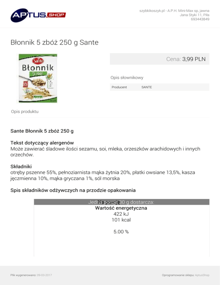 szybkikoszyk.pl - A.P.H. Mini-Max sp, jawna Jana Styki 11, Piła 693443849 Błonnik 5 zbóż 250 g Sante Cena: 3,99 PLN Opis słownikowy Producent SANTE Opis produktu Sante Błonnik 5 zbóż 250 g Tekst dotyczący alergenów Może zawierać śladowe ilości sezamu, soi, mleka, orzeszków arachidowych i innych orzechów. Składniki otręby pszenne 55%, pełnoziarnista mąka żytnia 20%, płatki owsiane 13,5%, kasza jęczmienna 10%, mąka gryczana 1%, sól morska Spis składników odżywczych na przodzie opakowania Jedna Naporcja porcję30 g dostarcza: Wartość energetyczna 422 kJ 101 kcal 5.00 % Plik wygenerowano: 09-03-2017 Oprogramowanie sklepu: AptusShop szybkikoszyk.pl - A.P.H. Mini-Max sp, jawna Jana Styki 11, Piła 693443849 w 100 g - 1406 kJ/336 kcal Referencyjna Wartość Spożycia dla przeciętnej osoby dorosłej (8400 kJ/2000 kcal) Wartości odżywcze w 100 g w porcji (30 g) Wartość energetyczna % RWS* w porcji (3 Tłuszcz w tym kwasy tłuszczowe nasycone w tym kwasy tłuszczowe jednonienasycone w tym kwasy tłuszczowe wielonienasycone Węglowodany w tym cukry Błonnik Plik wygenerowano: 09-03-2017 Oprogramowanie sklepu: AptusShop szybkikoszyk.pl - A.P.H. Mini-Max sp, jawna Jana Styki 11, Piła 693443849 Białko Sól Kwas foliowy Witamina B6 Tiamina Niacyna Witamina E Fosfor Magnez Plik wygenerowano: 09-03-2017 Oprogramowanie sklepu: AptusShop szybkikoszyk.pl - A.P.H. Mini-Max sp, jawna Jana Styki 11, Piła 693443849 Żelazo Cynk Miedź * Referencyjna Wartość Spożycia dla przeciętnej osoby dorosłej (8400 kJ/2000 kcal) ** Referencyjna Wartość Spożycia dla osoby dorosłej Nazwa produktu uregulowana prawnie Ekstrudowane pałeczki zbożowe. Marka Sante Cechy bez dodatku cukru, kwas foliowy, tiamina, witamina B6, niacyna, wysoka zawartość błonnika, fosfor, magnez, żelazo, cynk Marka standaryzowana Marka: Sante Adres firmy ul. Jagiellońska 55A 03-301 Warszawa Opis produktu Błonnik 5 zbóż - owies, gryka, pszenica, żyto, jęczmień Śniadanie to najważniejszy posiłek dnia, dlatego powinno zawierać węglowodany złożone, które stanowią podstawę dobrze zbilansowanej diety. Dodadzą one Tobie i Twoim bliskim siły i energii do działania. Idealnym źródłem węglowodanów złożonych jest Błonnik 5 zbóż Sante, stanowiący połączenie pszenicy, żyta, owsa, jęczmienia oraz gryki. Błonnik 5 zbóż może być częścią dobrze zbilansowanej diety ze względu na: - naturalnie wysoką zawartość błonnika - zawartość witamin: kwasu foliowego, wit. B6, niacyny, tiaminy, wit. E; - Plik wygenerowano: 09-03-2017 Oprogramowanie sklepu: AptusShop szybkikoszyk.pl - A.P.H. Mini-Max sp, jawna Jana Styki 11, Piła 693443849 zawartość składników mineralnych: fosforu, magnezu, żelaza i cynku. Zawarty w Błonniku 5 zbóż Sante fosfor przyczynia się do utrzymania prawidłowego metabolizmu energetycznego oraz pomaga w utrzymaniu zdrowych kości.* *Już pół porcji Błonnika 5 zbóż spożywanej regularnie w ramach zbilansowanej diety i aktywnego trybu życia, pozwoli uzyskać powyższy efekt zdrowotny. Żywność funkcjonalna na zdrowie! To żywność zawierająca substancje bioaktywne, takie jak błonnik, pro- i prebiotyki, witaminy, składniki mineralne i inne. Dzięki nim żywność funkcjonalna wykazuje korzystny wpływ na jedną lub więcej funkcji naszego organizmu. Pozostałe informacje Jedna porcja 30 g dostarcza: energia 422 kJ 101 kcal 5%*, tłuszcz 1,4 g 2%*, kwasy tłuszczowe nasycone 0,24 g 1%*, cukry 1,2 g 1%*, sól 0,15 g 3%* w 100 g - 1406 kJ/336 kcal Produkt zawiera 8 sugerowanych porcji. *Referencyjna Wartość Spożycia dla przeciętnej osoby dorosłej (8400 kJ/2000 kcal) Company Name Sante A. Kowalski sp. j. Zalecenia dla alergików Jęczmień: Zawiera Owies: Zawiera Pszenica: Zawiera Mleko: Może zawierać Orzechy: Może zawierać Orzeszki ziemne: Może zawierać Żyto: Zawiera Soja: Może zawierać Sezam: Może zawierać Przygotowanie i stosowanie Propozycja podania: Można spożywać z ciepłym lub zimnym mlekiem, jogurtem lub bez dodatków jako przekąskę. Przechowywanie Przechowywać w suchym i chłodnym miejscu. Rodzaj przechowywania Typ: Przechowywać w temperaturze otoczenia Plik wygenerowano: 09-03-2017 Oprogramowanie sklepu: AptusShop szybkikoszyk.pl - A.P.H. Mini-Max sp, jawna Jana Styki 11, Piła 693443849 Rozmiar opakowania 250 Jednostka (tekst opisowy) g Pozostały tekst dotyczący ilości porcji/użyć Produkt zawiera 8 sugerowanych porcji. Średnia miara Średnia miara (e) Informacje o recyklingu Opakowanie: Nadające się do recyklingu Jednostka (specyficzna) Jednostka (specyficzna): Gramów Rodzaj opakowania Typ: Karton Wymiar liczbowy Wymiar liczbowy: 250 Wymiar Wymagana wysokość na półce: 265 Wymagana szerokość na półce: 193 Wymagana głębokość na półce: 57 Waga Waga brutto: 320 Sprzedaż jednostkowa Wysokość: 265 Szerokość: 193 Głębokość: 57 Plik wygenerowano: 09-03-2017 Oprogramowanie sklepu: AptusShop szybkikoszyk.pl - A.P.H. Mini-Max sp, jawna Jana Styki 11, Piła 693443849 Adres producenta Sante A. Kowalski sp. j. ul. Jagiellońska 55A 03-301 Warszawa Adres zwrotny Sante A. Kowalski sp. j. ul. Jagiellońska 55A 03-301 Warszawa Uwagi o produktach "Sante" prosimy kierować do Serwisu Konsumenta [email protected] www.sante.pl Email kontaktowy [email protected] Adres internetowy www.sante.pl Języki na opakowaniu polski Język produktu Główny język opisu: polski Język danych: polski Plik wygenerowano: 09-03-2017 Powered by TCPDF (www.tcpdf.org) Oprogramowanie sklepu: AptusShop