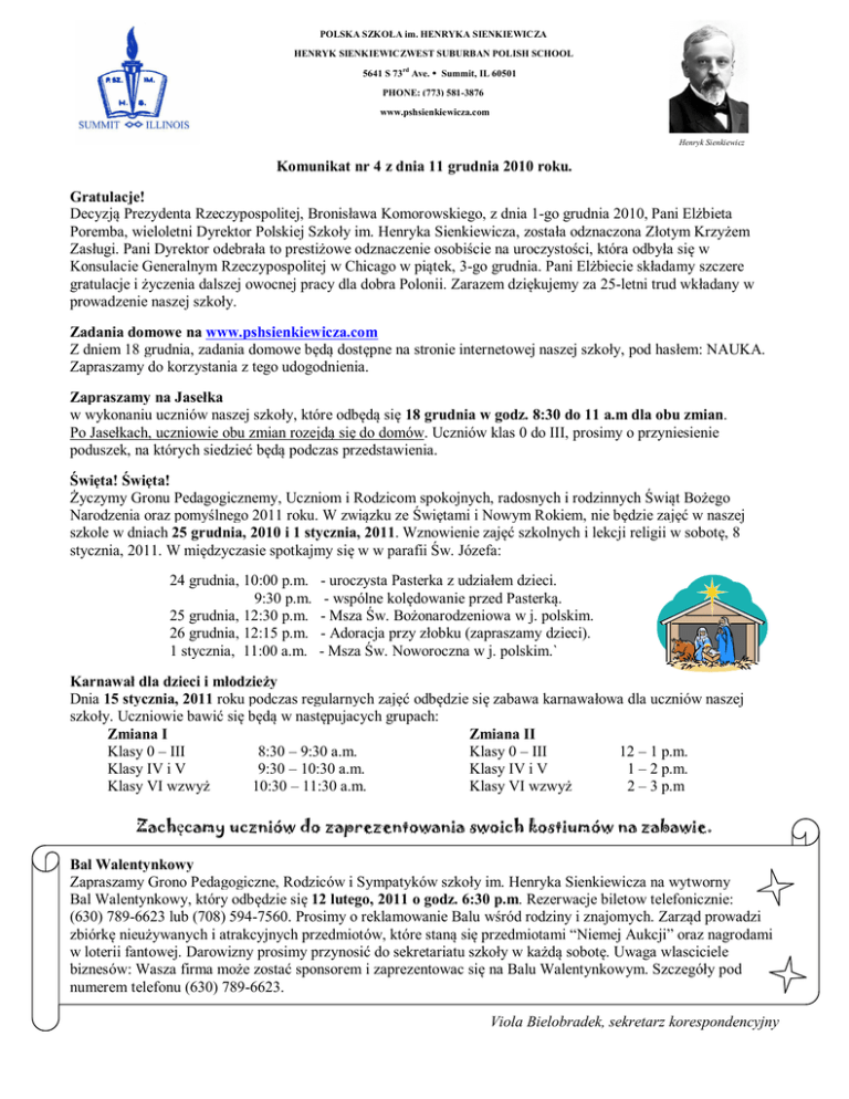 POLSKA SZKOŁA im. HENRYKA SIENKIEWICZA HENRYK SIENKIEWICZWEST SUBURBAN POLISH SCHOOL 5641 S 73rd Ave.  Summit, IL 60501 PHONE: (773) 581-3876 www.pshsienkiewicza.com Henryk Sienkiewicz Komunikat nr 4 z dnia 11 grudnia 2010 roku. Gratulacje! Decyzją Prezydenta Rzeczypospolitej, Bronisława Komorowskiego, z dnia 1-go grudnia 2010, Pani Elżbieta Poremba, wieloletni Dyrektor Polskiej Szkoły im. Henryka Sienkiewicza, została odznaczona Złotym Krzyżem Zasługi. Pani Dyrektor odebrała to prestiżowe odznaczenie osobiście na uroczystości, która odbyła się w Konsulacie Generalnym Rzeczypospolitej w Chicago w piątek, 3-go grudnia. Pani Elżbiecie składamy szczere gratulacje i życzenia dalszej owocnej pracy dla dobra Polonii. Zarazem dziękujemy za 25-letni trud wkładany w prowadzenie naszej szkoły. Zadania domowe na www.pshsienkiewicza.com Z dniem 18 grudnia, zadania domowe będą dostępne na stronie internetowej naszej szkoły, pod hasłem: NAUKA. Zapraszamy do korzystania z tego udogodnienia. Zapraszamy na Jasełka w wykonaniu uczniów naszej szkoły, które odbędą się 18 grudnia w godz. 8:30 do 11 a.m dla obu zmian. Po Jasełkach, uczniowie obu zmian rozejdą się do domów. Uczniów klas 0 do III, prosimy o przyniesienie poduszek, na których siedzieć będą podczas przedstawienia. Święta! Święta! Życzymy Gronu Pedagogicznemy, Uczniom i Rodzicom spokojnych, radosnych i rodzinnych Świąt Bożego Narodzenia oraz pomyślnego 2011 roku. W związku ze Świętami i Nowym Rokiem, nie będzie zajęć w naszej szkole w dniach 25 grudnia, 2010 i 1 stycznia, 2011. Wznowienie zajęć szkolnych i lekcji religii w sobotę, 8 stycznia, 2011. W międzyczasie spotkajmy się w w parafii Św. Józefa: 24 grudnia, 10:00 p.m. 9:30 p.m. 25 grudnia, 12:30 p.m. 26 grudnia, 12:15 p.m. 1 stycznia, 11:00 a.m. - uroczysta Pasterka z udziałem dzieci. - wspólne kolędowanie przed Pasterką. - Msza Św. Bożonarodzeniowa w j. polskim. - Adoracja przy złobku (zapraszamy dzieci). - Msza Św. Noworoczna w j. polskim.` Karnawał dla dzieci i młodzieży Dnia 15 stycznia, 2011 roku podczas regularnych zajęć odbędzie się zabawa karnawałowa dla uczniów naszej szkoły. Uczniowie bawić się będą w następujacych grupach: Zmiana I Zmiana II Klasy 0 – III 8:30 – 9:30 a.m. Klasy 0 – III 12 – 1 p.m. Klasy IV i V 9:30 – 10:30 a.m. Klasy IV i V 1 – 2 p.m. Klasy VI wzwyż 10:30 – 11:30 a.m. Klasy VI wzwyż 2 – 3 p.m Zachęcamy uczniów do zaprezentowania swoich kostiumów na zabawie. Bal Walentynkowy Zapraszamy Grono Pedagogiczne, Rodziców i Sympatyków szkoły im. Henryka Sienkiewicza na wytworny Bal Walentynkowy, który odbędzie się 12 lutego, 2011 o godz. 6:30 p.m. Rezerwacje biletow telefonicznie: (630) 789-6623 lub (708) 594-7560. Prosimy o reklamowanie Balu wśród rodziny i znajomych. Zarząd prowadzi zbiórkę nieużywanych i atrakcyjnych przedmiotów, które staną się przedmiotami “Niemej Aukcji” oraz nagrodami w loterii fantowej. Darowizny prosimy przynosić do sekretariatu szkoły w każdą sobotę. Uwaga wlasciciele biznesów: Wasza firma może zostać sponsorem i zaprezentowac się na Balu Walentynkowym. Szczegóły pod numerem telefonu (630) 789-6623. Viola Bielobradek, sekretarz korespondencyjny