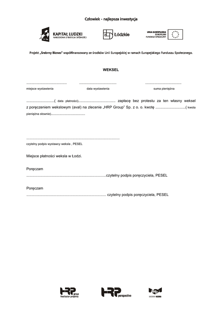 WEKSEL ....................................... .................................... ................................... data wystawienia suma pieniężna miejsce wystawienia ...........................( data płatności).................................... zapłacę bez protestu za ten własny weksel z poręczeniem wekslowym (aval) na zlecenie „HRP Group” Sp. z o. o. kwotę .............................( kwota pieniężna słownie)................................. .......................................................................................... czytelny podpis wystawcy weksla , PESEL Miejsce płatności weksla w Łodzi. Poręczam .............................................................................czytelny podpis poręczyciela, PESEL Poręczam ............................................................................. czytelny podpis poręczyciela, PESEL
