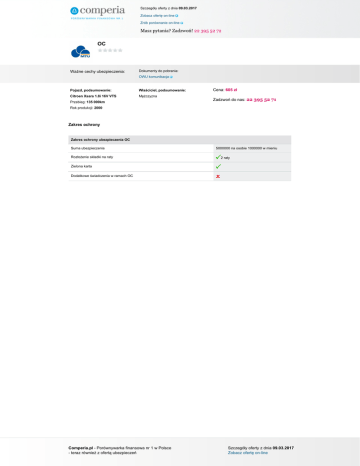 Szczegóły oferty z dnia 09.03.2017 Zobacz ofertę on-line Zrób porównanie on-line Masz pytania? Zadzwoń! 22 395 52 72 OC Ważne cechy ubezpieczenia: Dokumenty do pobrania: OWU komunikacja Pojazd, podsumowanie: Właściciel, podsumowanie: Citroen Xsara 1.8i 16V VTS Mężczyzna Przebieg: 135 000km Cena: 605 zł Zadzwoń do nas: 22 395 52 71 Rok produkcji: 2000 Zakres ochrony Zakres ochrony ubezpieczenia OC Suma ubezpieczenia Rozłożenie składki na raty 5000000 na osobie 1000000 w mieniu 2 raty Zielona karta Dodatkowe świadczenia w ramach OC Comperia.pl - Porównywarka finansowa nr 1 w Polsce - teraz również z ofertą ubezpieczeń Powered by TCPDF (www.tcpdf.org) Szczegóły oferty z dnia 09.03.2017 Zobacz ofertę on-line