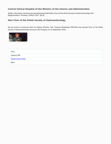Central Clinical Hospital of the Ministry of the Interior and Administration Źródło: http://www.cskmswia.pl/cse/media/news/14452,New-Chair-of-the-Polish-Society-of-Gastroenterology.html Wygenerowano: Thursday, 9 March 2017, 00:16 New Chair of the Polish Society of Gastroenterology We are proud to announce that our Deputy Director, Prof. Grażyna Rydzewska (MD,PhD) was elected Chair of the Polish Society of Gastroenterology during its XVII Congress on 23 September 2016. Print Generuj PDF Send to Your friend Back