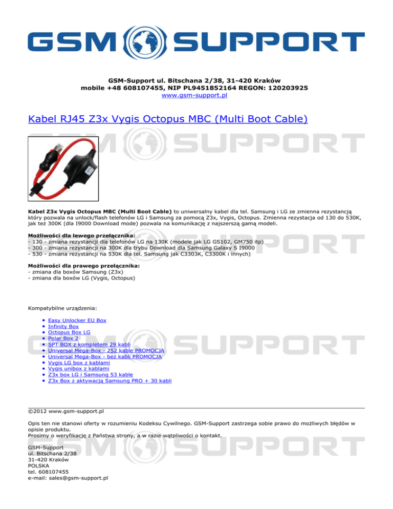 GSM-Support ul. Bitschana 2/38, 31-420 Kraków mobile +48 608107455, NIP PL9451852164 REGON: 120203925 www.gsm-support.pl Kabel RJ45 Z3x Vygis Octopus MBC (Multi Boot Cable) Kabel Z3x Vygis Octopus MBC (Multi Boot Cable) to uniwersalny kabel dla tel. Samsung i LG ze zmienna rezystancją który pozwala na unlock/flash telefonów LG i Samsung za pomocą Z3x, Vygis, Octopus. Zmienna rezystacja od 130 do 530K, jak też 300K (dla I9000 Download mode) pozwala na komunikację z najszerszą gamą modeli. Możliwości dla lewego przełącznika: - 130 - zmiana rezystancji dla telefonów LG na 130K (modele jak LG GS102, GM750 itp) - 300 - zmiana rezystancji na 300K dla trybu Download dla Samsung Galaxy S I9000 - 530 - zmiana rezystancji na 530K dla tel. Samsung jak C3303K, C3300K i innych) Możliwości dla prawego przełącznika: - zmiana dla boxów Samsung (Z3x) - zmiana dla boxów LG (Vygis, Octopus) Kompatybilne urządzenia: Easy Unlocker EU Box Infinity Box Octopus Box LG Polar Box 2 SPT BOX z kompletem 29 kabli Universal Mega-Box - 252 kable PROMOCJA Universal Mega-Box - bez kabli PROMOCJA Vygis LG box z kablami Vygis unibox z kablami Z3x box LG i Samsung 53 kable Z3x Box z aktywacją Samsung PRO + 30 kabli ©2012 www.gsm-support.pl Opis ten nie stanowi oferty w rozumieniu Kodeksu Cywilnego. GSM-Support zastrzega sobie prawo do możliwych błędów w opisie produktu. Prosimy o weryfikację z Państwa strony, a w razie wątpliwości o kontakt. GSM-Support ul. Bitschana 2/38 31-420 Kraków POLSKA tel. 608107455 e-mail: [email protected] Powered by TCPDF (www.tcpdf.org)