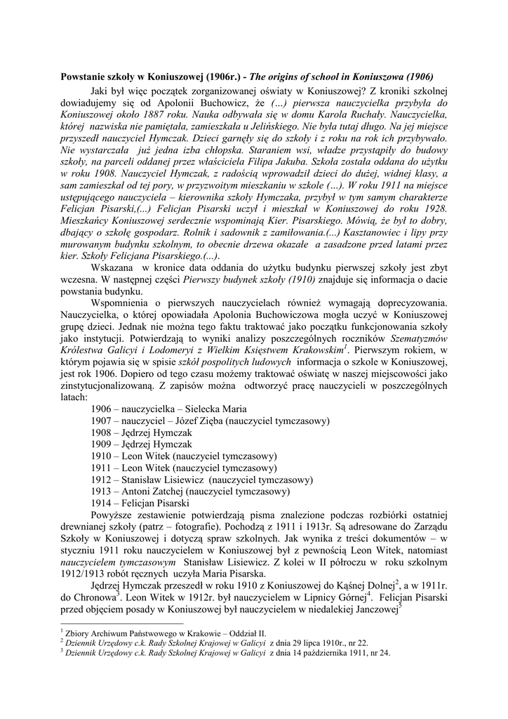 Powstanie szkoły w Koniuszowej (1906r.) - The origins of school in Koniuszowa (1906) Jaki był więc początek zorganizowanej oświaty w Koniuszowej? Z kroniki szkolnej dowiadujemy się od Apolonii Buchowicz, Ŝe (…) pierwsza nauczycielka przybyła do Koniuszowej około 1887 roku. Nauka odbywała się w domu Karola Ruchały. Nauczycielka, której nazwiska nie pamiętała, zamieszkała u Jelińskiego. Nie była tutaj długo. Na jej miejsce przyszedł nauczyciel Hymczak. Dzieci garnęły się do szkoły i z roku na rok ich przybywało. Nie wystarczała juŜ jedna izba chłopska. Staraniem wsi, władze przystąpiły do budowy szkoły, na parceli oddanej przez właściciela Filipa Jakuba. Szkoła została oddana do uŜytku w roku 1908. Nauczyciel Hymczak, z radością wprowadził dzieci do duŜej, widnej klasy, a sam zamieszkał od tej pory, w przyzwoitym mieszkaniu w szkole (…). W roku 1911 na miejsce ustępującego nauczyciela – kierownika szkoły Hymczaka, przybył w tym samym charakterze Felicjan Pisarski,(...) Felicjan Pisarski uczył i mieszkał w Koniuszowej do roku 1928. Mieszkańcy Koniuszowej serdecznie wspominają Kier. Pisarskiego. Mówią, Ŝe był to dobry, dbający o szkołę gospodarz. Rolnik i sadownik z zamiłowania.(...) Kasztanowiec i lipy przy murowanym budynku szkolnym, to obecnie drzewa okazałe a zasadzone przed latami przez kier. Szkoły Felicjana Pisarskiego.(...). Wskazana w kronice data oddania do uŜytku budynku pierwszej szkoły jest zbyt wczesna. W następnej części Pierwszy budynek szkoły (1910) znajduje się informacja o dacie powstania budynku. Wspomnienia o pierwszych nauczycielach równieŜ wymagają doprecyzowania. Nauczycielka, o której opowiadała Apolonia Buchowiczowa mogła uczyć w Koniuszowej grupę dzieci. Jednak nie moŜna tego faktu traktować jako początku funkcjonowania szkoły jako instytucji. Potwierdzają to wyniki analizy poszczególnych roczników Szematyzmów Królestwa Galicyi i Lodomeryi z Wielkim Księstwem Krakowskim1. Pierwszym rokiem, w którym pojawia się w spisie szkół pospolitych ludowych informacja o szkole w Koniuszowej, jest rok 1906. Dopiero od tego czasu moŜemy traktować oświatę w naszej miejscowości jako zinstytucjonalizowaną. Z zapisów moŜna odtworzyć pracę nauczycieli w poszczególnych latach: 1906 – nauczycielka – Sielecka Maria 1907 – nauczyciel – Józef Zięba (nauczyciel tymczasowy) 1908 – Jędrzej Hymczak 1909 – Jędrzej Hymczak 1910 – Leon Witek (nauczyciel tymczasowy) 1911 – Leon Witek (nauczyciel tymczasowy) 1912 – Stanisław Lisiewicz (nauczyciel tymczasowy) 1913 – Antoni Zatchej (nauczyciel tymczasowy) 1914 – Felicjan Pisarski PowyŜsze zestawienie potwierdzają pisma znalezione podczas rozbiórki ostatniej drewnianej szkoły (patrz – fotografie). Pochodzą z 1911 i 1913r. Są adresowane do Zarządu Szkoły w Koniuszowej i dotyczą spraw szkolnych. Jak wynika z treści dokumentów – w styczniu 1911 roku nauczycielem w Koniuszowej był z pewnością Leon Witek, natomiast nauczycielem tymczasowym Stanisław Lisiewicz. Z kolei w II półroczu w roku szkolnym 1912/1913 robót ręcznych uczyła Maria Pisarska. Jędrzej Hymczak przeszedł w roku 1910 z Koniuszowej do Kąśnej Dolnej2, a w 1911r. do Chronowa3. Leon Witek w 1912r. był nauczycielem w Lipnicy Górnej4. Felicjan Pisarski przed objęciem posady w Koniuszowej był nauczycielem w niedalekiej Janczowej5 1 Zbiory Archiwum Państwowego w Krakowie – Oddział II. Dziennik Urzędowy c.k. Rady Szkolnej Krajowej w Galicyi z dnia 29 lipca 1910r., nr 22. 3 Dziennik Urzędowy c.k. Rady Szkolnej Krajowej w Galicyi z dnia 14 października 1911, nr 24. 2 Za co wystawiano oceny w galicyjskiej szkole? Jak wyglądało świadectwo szkolne? W zbiorach regionaliów szkoły znajduje się „zawiadomienie szkolne” (świadectwo szkolne) z roku 1912 wydane przez Szkołę Ludową w Librantowej, o takiej samej strukturze organizacyjnej jak w Koniuszowej (patrz zdjęcie). Na odwrocie umieszczona była skala ocen: 1 2 3 4 5 4 5 zachowania się: Chwalebne Zadowalające Odpowiednie mniej odpowiednie Nieodpowiednie SKALA OCENY pilności: postępu: Wytrwała bardzo dobry Zadowalająca dobry Dostateczna dostateczny Niejednostajna mierny Mała niedostateczny porządku zewnętrz.: bardzo staranny Staranny mniej staranny Niestaranny Niedbały Dziennik Urzędowy c.k. Rady Szkolnej Krajowej w Galicyi z dnia 12 czerwca 1912, nr 12. Dziennik Urzędowy c.k. Rady Szkolnej Krajowej w Galicyi z dnia 21 maja 1910, nr 14. 2