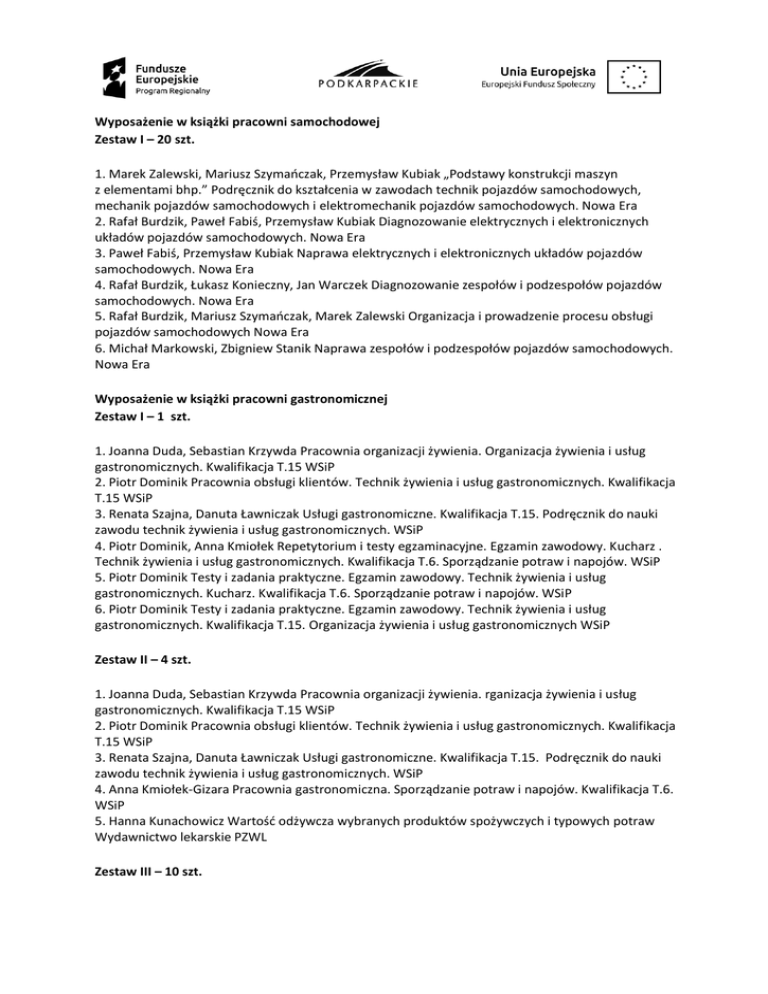 Wyposażenie w książki pracowni samochodowej Zestaw I – 20 szt. 1. Marek Zalewski, Mariusz Szymaoczak, Przemysław Kubiak „Podstawy konstrukcji maszyn z elementami bhp.” Podręcznik do kształcenia w zawodach technik pojazdów samochodowych, mechanik pojazdów samochodowych i elektromechanik pojazdów samochodowych. Nowa Era 2. Rafał Burdzik, Paweł Fabiś, Przemysław Kubiak Diagnozowanie elektrycznych i elektronicznych układów pojazdów samochodowych. Nowa Era 3. Paweł Fabiś, Przemysław Kubiak Naprawa elektrycznych i elektronicznych układów pojazdów samochodowych. Nowa Era 4. Rafał Burdzik, Łukasz Konieczny, Jan Warczek Diagnozowanie zespołów i podzespołów pojazdów samochodowych. Nowa Era 5. Rafał Burdzik, Mariusz Szymaoczak, Marek Zalewski Organizacja i prowadzenie procesu obsługi pojazdów samochodowych Nowa Era 6. Michał Markowski, Zbigniew Stanik Naprawa zespołów i podzespołów pojazdów samochodowych. Nowa Era Wyposażenie w książki pracowni gastronomicznej Zestaw I – 1 szt. 1. Joanna Duda, Sebastian Krzywda Pracownia organizacji żywienia. Organizacja żywienia i usług gastronomicznych. Kwalifikacja T.15 WSiP 2. Piotr Dominik Pracownia obsługi klientów. Technik żywienia i usług gastronomicznych. Kwalifikacja T.15 WSiP 3. Renata Szajna, Danuta Ławniczak Usługi gastronomiczne. Kwalifikacja T.15. Podręcznik do nauki zawodu technik żywienia i usług gastronomicznych. WSiP 4. Piotr Dominik, Anna Kmiołek Repetytorium i testy egzaminacyjne. Egzamin zawodowy. Kucharz . Technik żywienia i usług gastronomicznych. Kwalifikacja T.6. Sporządzanie potraw i napojów. WSiP 5. Piotr Dominik Testy i zadania praktyczne. Egzamin zawodowy. Technik żywienia i usług gastronomicznych. Kucharz. Kwalifikacja T.6. Sporządzanie potraw i napojów. WSiP 6. Piotr Dominik Testy i zadania praktyczne. Egzamin zawodowy. Technik żywienia i usług gastronomicznych. Kwalifikacja T.15. Organizacja żywienia i usług gastronomicznych WSiP Zestaw II – 4 szt. 1. Joanna Duda, Sebastian Krzywda Pracownia organizacji żywienia. rganizacja żywienia i usług gastronomicznych. Kwalifikacja T.15 WSiP 2. Piotr Dominik Pracownia obsługi klientów. Technik żywienia i usług gastronomicznych. Kwalifikacja T.15 WSiP 3. Renata Szajna, Danuta Ławniczak Usługi gastronomiczne. Kwalifikacja T.15. Podręcznik do nauki zawodu technik żywienia i usług gastronomicznych. WSiP 4. Anna Kmiołek-Gizara Pracownia gastronomiczna. Sporządzanie potraw i napojów. Kwalifikacja T.6. WSiP 5. Hanna Kunachowicz Wartośd odżywcza wybranych produktów spożywczych i typowych potraw Wydawnictwo lekarskie PZWL Zestaw III – 10 szt. 1. Joanna Duda, Sebastian Krzywda Pracownia organizacji żywienia. rganizacja żywienia i usług gastronomicznych. Kwalifikacja T.15 WSiP 2. Piotr Dominik Pracownia obsługi klientów. Technik żywienia i usług gastronomicznych. Kwalifikacja T.15 WSiP 3. Renata Szajna, Danuta Ławniczak Usługi gastronomiczne. Kwalifikacja T.15. Podręcznik do nauki zawodu technik żywienia i usług gastronomicznych. WSiP 4. Hanna Kunachowicz Wartośd odżywcza wybranych produktów spożywczych i typowych potraw Wydawnictwo lekarskie PZWL 5. Anna Kmiołek Usługi gastronomiczne. Podręcznik do zawodu technik żywienia i usług gastronomicznych. WSiP 6. Beata Dasiewicz Chemia wokół nas. Chemia w kuchni. Zamkor Zestaw IV – 5 szt. 1. Joanna Duda, Sebastian Krzywda Pracownia organizacji żywienia. Organizacja żywienia i usług gastronomicznych. Kwalifikacja T.15 WSiP 2. Piotr Dominik Pracownia obsługi klientów. Technik żywienia i usług gastronomicznych. Kwalifikacja T.15 WSiP 3. Renata Szajna, Danuta Ławniczak Usługi gastronomiczne. Kwalifikacja T.15. Podręcznik do nauki zawodu technik żywienia i usług gastronomicznych. WSiP 4. Hanna Kunachowicz Wartośd odżywcza wybranych produktów spożywczych i typowych potraw Wydawnictwo lekarskie PZWL 5. Sandeman Florens Dekorowanie stołu Delta W-Z 6. Rudolf Biller Ozdabianie potraw Delta W-Z Wyposażenie w książki pracowni informatycznej Zestaw I – 20 szt. 1. Tomasz Klekot, Krzysztof Pytel PRACOWNIA APLIKACJI INTERNETOWYCH. TWORZENIE APLIKACJI INTERNETOWYCH I BAZ DANYCH ORAZ ADMINISTROWANIE BAZAMI. KWALIFIKACJA E.14 WSiP 2. Tomasz Klekot, Krzysztof Pytel PRACOWNIA URZĄDZEO TECHNIKI KOMPUTEROWEJ. TECHNIK INFORMATYK. KWALIFIKACJA E.12 WSiP 3. Tomasz Klekot, Krzysztof Pytel REPETYTORIUM I TESTY EGZAMINACYJNE. EGZAMIN ZAWODOWY. TECHNIK INFORMATYK. KWALIFIKACJA E.12. SZKOŁY PONADGIMNAZJALNE WSiP 4. Krzysztof T. Czarkowski, Ilona Nowosad Kwalifikacja E.14. częśd 1. Tworzenie stron internetowych Nowa Era 5. Krzysztof T. Czarkowski, Ilona Nowosad Kwalifikacja E.14. częśd 2. Tworzenie baz danych i administrowanie bazami danych. Nowa Era 6. Krzysztof T. Czarkowski, Ilona Nowosad Kwalifikacja E.14. częśd 3. Tworzenie aplikacji internetowych Nowa Era