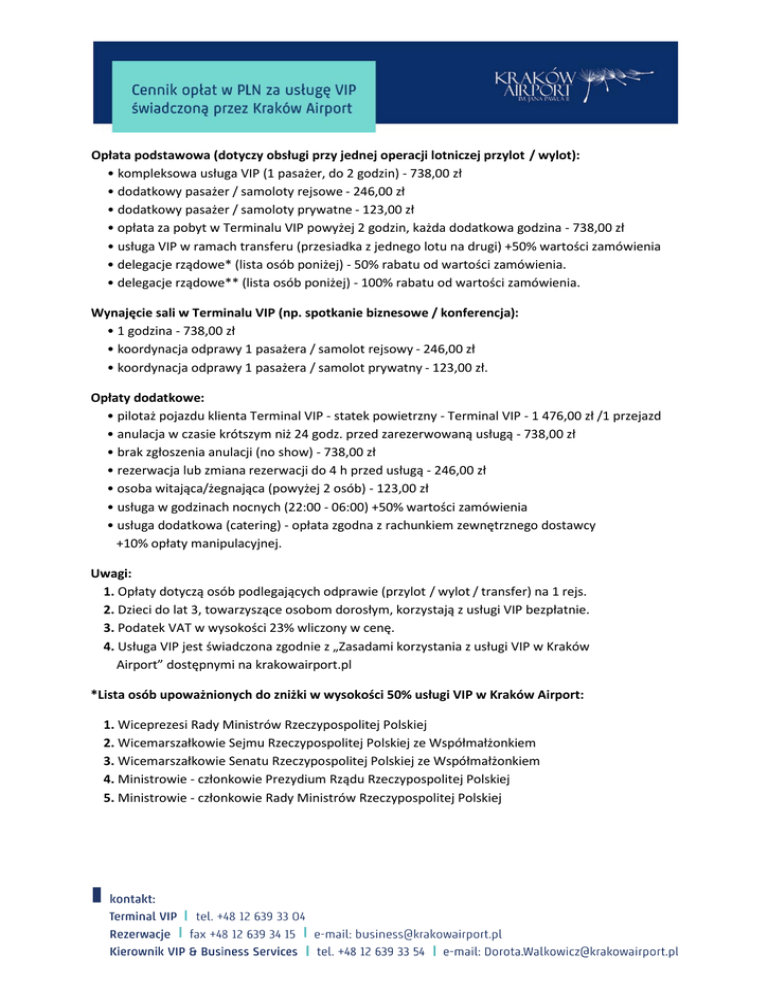Opłata podstawowa (dotyczy obsługi przy jednej operacji lotniczej przylot / wylot): • kompleksowa usługa VIP (1 pasażer, do 2 godzin) - 738,00 zł • dodatkowy pasażer / samoloty rejsowe - 246,00 zł • dodatkowy pasażer / samoloty prywatne - 123,00 zł • opłata za pobyt w Terminalu VIP powyżej 2 godzin, każda dodatkowa godzina - 738,00 zł • usługa VIP w ramach transferu (przesiadka z jednego lotu na drugi) +50% wartości zamówienia • delegacje rządowe* (lista osób poniżej) - 50% rabatu od wartości zamówienia. • delegacje rządowe** (lista osób poniżej) - 100% rabatu od wartości zamówienia. Wynajęcie sali w Terminalu VIP (np. spotkanie biznesowe / konferencja): • 1 godzina - 738,00 zł • koordynacja odprawy 1 pasażera / samolot rejsowy - 246,00 zł • koordynacja odprawy 1 pasażera / samolot prywatny - 123,00 zł. Opłaty dodatkowe: • pilotaż pojazdu klienta Terminal VIP - statek powietrzny - Terminal VIP - 1 476,00 zł /1 przejazd • anulacja w czasie krótszym niż 24 godz. przed zarezerwowaną usługą - 738,00 zł • brak zgłoszenia anulacji (no show) - 738,00 zł • rezerwacja lub zmiana rezerwacji do 4 h przed usługą - 246,00 zł • osoba witająca/żegnająca (powyżej 2 osób) - 123,00 zł • usługa w godzinach nocnych (22:00 - 06:00) +50% wartości zamówienia • usługa dodatkowa (catering) - opłata zgodna z rachunkiem zewnętrznego dostawcy +10% opłaty manipulacyjnej. Uwagi: 1. Opłaty dotyczą osób podlegających odprawie (przylot / wylot / transfer) na 1 rejs. 2. Dzieci do lat 3, towarzyszące osobom dorosłym, korzystają z usługi VIP bezpłatnie. 3. Podatek VAT w wysokości 23% wliczony w cenę. 4. Usługa VIP jest świadczona zgodnie z „Zasadami korzystania z usługi VIP w Kraków Airport” dostępnymi na krakowairport.pl *Lista osób upoważnionych do zniżki w wysokości 50% usługi VIP w Kraków Airport: 1. Wiceprezesi Rady Ministrów Rzeczypospolitej Polskiej 2. Wicemarszałkowie Sejmu Rzeczypospolitej Polskiej ze Współmałżonkiem 3. Wicemarszałkowie Senatu Rzeczypospolitej Polskiej ze Współmałżonkiem 4. Ministrowie - członkowie Prezydium Rządu Rzeczypospolitej Polskiej 5. Ministrowie - członkowie Rady Ministrów Rzeczypospolitej Polskiej **Lista osób upoważnionych do zniżki w wysokości 100% usługi VIP w Kraków Airport: 1. Prezydent Rzeczypospolitej Polskiej ze Współmałżonkiem 2. Marszałek Sejmu Rzeczypospolitej Polskiej ze Współmałżonkiem 3. Marszałek Senatu Rzeczypospolitej Polskiej ze Współmałżonkiem 4. Prezes Rady Ministrów Rzeczypospolitej Polskiej ze Współmałżonkiem 5. Byli Prezydenci Rzeczypospolitej Polskiej ze Współmałżonkiem.