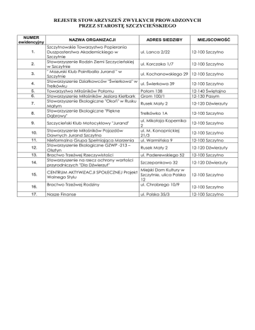 REJESTR STOWARZYSZEŃ ZWYŁKYCH PROWADZONYCH PRZEZ STAROSTĘ SZCZYCIEŃSKIEGO NUMER ewidencyjny 1. 2. 3. 4. 5. 6. 7. 8. 9. 10. 11. 12. 13. 14. 15. 16. 17. NAZWA ORGANIZACJI Szczytnowskie Towarzystwo Popierania Duszpasterstwa Akademickiego w Szczytnie Stowarzyszenie Rodzin Ziemi Szczycieńskiej w Szczytnie " Mazurski Klub Paintballa Jurand " w Szczytnie Stowarzyszenie Działkowców "Świerkowa" w Trelkówku Towarzystwo Miłośników Połomu Stowarzyszenie Miłośników Jeziora Kiełbark Stowarzyszenie Ekologiczne "Okoń" w Rusku Małym Stowarzyszenie Ekologiczne "Piękne Dąbrowy" Szczycieński Klub Motocyklowy "Jurand" Stowarzyszenie Miłośników Pojazdów Dawnych Jurand Szczytno Nieformalna Grupa Spełniająca Marzenia Stowarzyszenie Ekologiczne GZWP -213 – Olsztyn Bractwo Trzeźwej Rzeczywistości Stowarzyszenie na rzecz ochrony wartości przyrodniczych "Dla Dźwierzut" ADRES SIEDZIBY ul. Lanca 2/22 12-100 Szczytno ul. Korczaka 1/7 12-100 Szczytno ul. Kochanowskiego 29 12-100 Szczytno ul. Świerkowa 39 12-100 Szczytno Połom 138 Grom 100/1 12-140 Świętajno 12-130 Pasym Rusek Mały 2 12-120 Dźwierzuty Trelkówko 1A 12-100 Szczytno ul. Mikołaja Kopernika 2 ul. M. Konopnickiej 21/3 ul. Warmińska 9 12-100 Szczytno 12-100 Szczytno 12-100 Szczytno Rusek Mały 2 12-120 Dźwierzuty ul. Paderewskiego 52 12-100 Szczytno Szczepankowo 32 12-120 Dźwierzuty Miejski Dom Kultury w CENTRUM AKTYWIZACJI SPOŁECZNEJ Projekt Szczytnie, ulica Polska Wolnego Stylu 12 Bractwo Trzeźwej Rodziny ul. Chrobrego 10/9 Nasze Finanse MIEJSCOWOŚĆ ul. Polska 35/3 12-100 Szczytno 12-100 Szczytno 12-100 Szczytno
