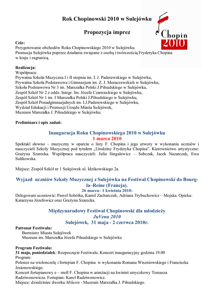 Rok Chopinowski 2010 w Sulejówku Propozycja imprez Cele: Przygotowanie obchodów Roku Chopinowskiego 2010 w Sulejówku. Promocja Sulejówka poprzez działania związane z osobą i twórczością Fryderyka Chopina w kraju i zagranicą. Realizacja: Współpraca: Prywatna Szkoła Muzyczna I i II stopnia im. I. J. Paderewskiego w Sulejówku, Prywatna Szkoła Podstawowa i Gimnazjum im. Z. J. Moraczewskich w Sulejówku, Szkoła Podstawowa Nr 3 im. Marszałka Polski J.Piłsudskiego w Sulejówku, Zespół Szkół Nr 2 z oddz. Integr. Im. Józefa Czarnieckiego w Sulejówku, Zespół Szkół Nr 1 im. I Marszałka Polski J.Piłsudskiego w Sulejówku, Zespół Szkół Ponadgimnazjalnych im. I.J.Paderewskiego w Sulejówku, Wydział Edukacji i Promocji Urzędu Miasta Sulejówek, Muzeum Marszałka J. Piłsudskiego w Sulejówku. Preliminarz i opis zadań: Inauguracja Roku Chopinowskiego 2010 w Sulejówku 1 marca 2010 Spektakl słowno – muzyczny w oparciu o listy F. Chopina i jego utwory w wykonaniu uczniów i nauczycieli Szkoły Muzycznej pod tytułem „Urodziny Fryderyka Chopina”. Kierownictwo artystyczne: GraŜyna Szarecka. Współpraca nauczycieli: Julia Singalewicz – Sobczak, Jacek Nazarczuk, Ewa Sulikowska. Miejsce: Zespół Szkół nr 1 Sulejówek ul. Idzikowskiego 2a. Wyjazd uczniów Szkoły Muzycznej z Sulejówka na Festiwal Chopinowski do Bourgla–Reine (Francja). 26 marca– 1 kwietnia 2010: Delegowani uczniowie: Paweł Sobótka, Kamil Zacharczuk, Adriana Trybuchowicz – Mojska. Opieka: Katarzyna Józefowicz oraz GraŜyna Szarecka. Międzynarodowy Festiwal Chopinowski dla młodzieŜy JuVena 2010 Sulejówek, 31 maja - 2 czerwca 2010r. Patronat Festiwalu: Burmistrz Miasta Sulejówek Muzeum im. Marszałka Józefa Piłsudskiego w Sulejówku Program Festiwalu: 31 maja, poniedziałek: Rozpoczęcie Festiwalu. Koncert inauguracyjny godzina 19.00 Program: Polonez na wiolonczelę i fortepian F. Chopina w wykonaniu Romana Wiszniowskiego i Franciszka Jesionowskiego. Koncert fortepianowy e – moll F. Chopina w aranŜacji na kwintet smyczkowy Tomasza Radziwonowicza. Fortepian: Karol Radziwonowicz. Miejsce: dziedziniec dworku Milusin - Muzeum Marszałka J. Piłsudskiego. 1 czerwca, wtorek: Międzynarodowy Konkurs Pianistyczny dla MłodzieŜy z udziałem współpracujących szkół muzycznych: Mińskiej Szkoły Artystycznej, Prywatnej Szkoły Muzycznej I i II stopnia w Wołominie, Społecznej Szkoły Muzycznej w Warszawie - Wesołej oraz miast partnerskich Sulejówka t.j. Bourg-la–Reine (Francja) oraz Viimsi (Estonia). Miejsce: Prywatna Szkoła Muzyczna I i II st. w Sulejówku ul. Zeromskiego 18. 2 czerwca, środa: Zakończenie Festiwalu. Program: Godzina 18.30 rozdanie nagród laureatom konkursu oraz koncert laureatów. Godzina 20.00 recital Przemysława Wojsława Chopin na jazzowo. Godzina 21.00 Spektakl multimedialny w oparciu o utwory F. Chopina. Jest to synteza muzyki, tańca i obrazu. Widowisko przewiduje udział pianisty, tancerzy i wizualizatora. Realizacja obrazu polega na miksowaniu barwnych substancji na powierzchni grafoskopu i modelowania strumienia światła za pomocą filtrów, grafik i soczewek. Wykonanie: Julia Singalewicz – Sobczak – fortepian, Tomasz Ebert – wizualizacja, Grupa taneczna Miejsce: dziedziniec dworku Milusin - Muzeum Marszałka J. Piłsudskiego. Kierownictwo artystyczne Festiwalu: Julia Singalewicz – Sobczak. REGULAMIN KONKURSU 1 czerwca 2010 I. Przeznaczenie: - Konkurs przeznaczony jest dla uczniów szkół muzycznych. Cele konkursu: - popularyzacja muzyki fortepianowej, w szczególności twórczości F. Chopina, - prezentacja osiągnięć i umiejętności uczniów, - promocja utalentowanych młodych artystów, - wymiana doświadczeń między pedagogami z róŜnych ośrodków, - uczczenie obchodów Roku Chopinowskiego 2010. Program konkursu 1. Konkurs odbędzie się w Prywatnej Szkole Muzycznej I i II stopnia im. I. J. Paderewskiego w Sulejówku. 2. Konkurs jest otwarty dla uczestników polskich i zagranicznych. 3. Konkurs przeznaczony jest dla uczniów szkół muzycznych I i II stopnia. 4. Konkurs będzie przeprowadzony w dwóch kategoriach wiekowych (o przydziale do danej kategorii wiekowej decydować będzie data urodzenia): grupa wiekowa I – do lat 13 (urodzeni w 1997r. i młodsi) grupa wiekowa II – do lat 16 (urodzeni w 1994 r. i młodsi) Grupa wiekowa I: - utwór barokowy J. S. Bacha - dowolnie wybrany utwór F. Chopina - etiuda lub utwór o charakterze wirtuozowskim Grupa wiekowa II: - preludium i fuga z Das Wohltemperierte Klavier J. S. Bacha lub dwa tańce kontrastujące pod względem charakteru i tempa z cyklu Suity Francuskie (BWV 812-817) - dowolnie wybrany utwór F. Chopina - preludium G – dur op. 28 II. 1. Konkurs jest jednoetapowy dla wszystkich grup. 2. Kolejność występów zostanie ustalona drogą losowania. 3. Przesłuchania uczestników odbywać się będą z udziałem publiczności. 4. Program konkursu naleŜy wykonać z pamięci. 5. Kolejność wykonywanych utworów jest dowolna. 6. Organizatorzy zastrzegają sobie prawo do utrwalania, wykorzystania, a takŜe rozpowszechniania nagrań fonograficznych, radiowych i telewizyjnych oraz fotografii wykonanych podczas Konkursu bez dodatkowego wynagrodzenia dla uczestników. III. 1. Występy uczestników Konkursu ocenia jury powołane przez organizatora. 2. Prezentacje konkursowe Jury ocenia w skali 1-25 punktów. 3. W Konkursie przewidziane są nagrody i wyróŜnienia. Laureatami zostaną zdobywcy trzech pierwszych miejsc w kaŜdej grupie wiekowej. Jury ma prawo do innego podziału nagród. Wszyscy wykonawcy otrzymają dyplomy uczestnictwa. 4. Przewidziana jest nagroda za najlepsze wykonanie utworu Fryderyka Chopina. IV. 1. Zgłoszenie do udziału w Konkursie w języku polskim lub angielskim wraz ze zdjęciem i kopią dokumentu stwierdzającego wiek kandydata naleŜy przesłać do dnia 31 kwietnia 2010r.. na adres: Prywatna Szkoła muzyczna I i II stopnia im. Ignacego Jana Paderewski