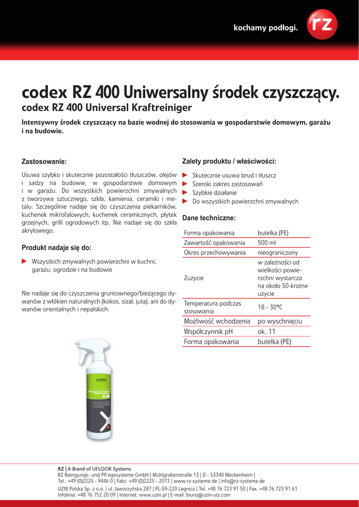 kochamy podłogi. codex RZ 400 Uniwersalny środek czyszczący. codex RZ 400 Universal Kraftreiniger Intensywny środek czyszczący na bazie wodnej do stosowania w gospodarstwie domowym, garażu i na budowie. Zastosowanie: Zalety produktu / właściwości: Usuwa szybko i skutecznie pozostałości tłuszczów, olejów i sadzy na budowie, w gospodarstwie domowym i w garażu. Do wszystkich powierzchni zmywalnych z tworzywa sztucznego, szkła, kamienia, ceramiki i metalu. Szczególnie nadaje się do czyszczenia piekarników, kuchenek mikrofalowych, kuchenek ceramicznych, płytek grzejnych, grilli ogrodowych itp. Nie nadaje się do szkła akrylowego. ► Skutecznie usuwa brud i tłuszcz ► Szeroki zakres zastosowań ► Szybkie działanie ► Do wszystkich powierzchni zmywalnych Produkt nadaje się do: ► Wszystkich zmywalnych powierzchni w kuchni, Dane techniczne: Forma opakowania Zawartość opakowania Okres przechowywania garażu, ogrodzie i na budowie Zużycie Nie nadaje się do czyszczenia gruntownego/bieżącego dywanów z włókien naturalnych (kokos, sizal, juta), ani do dywanów orientalnych i nepalskich. butelka (PE) 500 ml nieograniczony w zależności od wielkości powierzchni wystarcza na około 50-krotne użycie Temperatura podczas stosowania 18 - 30°C Możliwość wchodzenia Współczynnik pH Forma opakowania po wyschnięciu ok. 11 butelka (PE) RZ | A Brand of UFLOOR Systems RZ Reinigungs- und Pfl egesysteme GmbH | Mühlgrabenstraße 13 | D - 53340 Meckenheim | Tel.: +49 (0)2225 - 9446 0 | Faks: +49 (0)2225 - 2073 | www.rz-systeme.de | [email protected] UZIN Polska Sp. z o.o. | ul. Jaworzyńska 287 | PL-59-220 Legnica | Tel. +48 76 723 91 50 | Fax. +48 76 723 91 61 Infolinia: +48 76 752 20 09 | Internet: www.uzin.pl | E-mail: [email protected] kochamy podłogi. codex RZ 400 Uniwersalny środek czyszczący. codex RZ 400 Universal Kraftreiniger Przygotowanie: Ważne wskazówki: Przed zastosowaniem produktu Codex RZ 400 z powierzch- ► Oryginalne pojemniki można przechowywać w stabilni usunąć luźne zabrudzenia. Przed zastosowaniem na dunych warunkach bez ograniczenia czasu. żej powierzchni wypróbować na powierzchni testowej. Nie ► Bezwzględnie chronić przed mrozem lub silnie rozpylać na gorące powierzchnie. wahającymi się temperaturami. Rozpoczęte opakowania należy szczelnie zamykać. ► Najkorzystniejsze warunki stosowania to niska Sposób stosowania wilgotność powietrza (ok. 65%) oraz normalna temCzyszczenie konserwujące: peratura pokojowa (18 - 30°C). 1. Spryskać preparatem zabrudzenia i plamy. ► Nie rozpylać na gorące powierzchnie. 2. Pozostawić na chwilę, żeby preparat mógł oddziaływać. ► Nie stosować do szkła akrylowego. 3. Po odpowiednim czasie oddziaływania wytrzeć chłonną ► W razie wątpliwości należy zawsze wykonać próbę ścierką. czyszczenia w niewidocznym miejscu. BHP i ochrona środowiska: Produkt drażniący. Produkt niepalny. Podczas stosowania zasadniczo zaleca się używanie rękawic i kremów ochronnych do skóry. Bezwzględnie przestrzegać uwag dotyczących bezpieczeństwa zamieszczonych na butelce. Usuwanie odpadów: W postaci nierozcieńczonej nie wylewać do kanalizacji, zbiorników wodnych ani gruntu. Dokładnie opróżnione opakowania wypłukać niewielką ilością wody i usuwać zgodnie z miejscowymi/urzędowymi przepisami jak opakowania, które mogą być ponownie przetworzone w procesie recyclingu (DSD). Podane tutaj informacje bazują na naszym doświadczeniu i skrupulatnych badaniach. Finalna jakość wykonanej pracy zależy od fachowej oceny warunków panujących na budowie oraz od doboru przez Państwa odpowiednich produktów. W razie wątpliwości należy przed użyciem wykonać własne próby lub zasięgnąć porady technicznej. Należy ściśle stosować się do instrukcji stosowania zamieszczonej na pojemnikach. Wraz z ukazaniem się niniejszej karty technicznej produktu tracą ważność wszystkie poprzednie karty techniczne produktu. 06.2010 RZ | A Brand of UFLOOR Systems RZ Reinigungs- und Pfl egesysteme GmbH | Mühlgrabenstraße 13 | D - 53340 Meckenheim | Tel.: +49 (0)2225 - 9446 0 | Faks: +49 (0)2225 - 2073 | www.rz-systeme.de | [email protected] UZIN Polska Sp. z o.o. | ul. Jaworzyńska 287 | PL-59-220 Legnica | Tel. +48 76 723 91 50 | Fax. +48 76 723 91 61 Infolinia: +48 76 752 20 09 | Internet: www.uzin.pl | E-mail: [email protected]