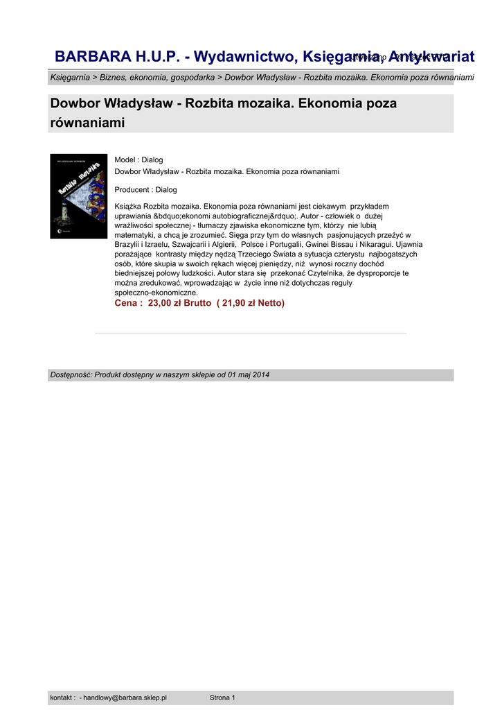 Utworzono Antykwariat : 09 marzec 2017 BARBARA H.U.P. - Wydawnictwo, Księgarnia, Księgarnia > Biznes, ekonomia, gospodarka > Dowbor Władysław - Rozbita mozaika. Ekonomia poza równaniami Dowbor Władysław - Rozbita mozaika. Ekonomia poza równaniami Model : Dialog Dowbor Władysław - Rozbita mozaika. Ekonomia poza równaniami Producent : Dialog Książka Rozbita mozaika. Ekonomia poza równaniami jest ciekawym przykładem uprawiania „ekonomi autobiograficznej”. Autor - człowiek o dużej wrażliwości społecznej - tłumaczy zjawiska ekonomiczne tym, którzy nie lubią matematyki, a chcą je zrozumieć. Sięga przy tym do własnych pasjonujących przeżyć w Brazylii i Izraelu, Szwajcarii i Algierii, Polsce i Portugalii, Gwinei Bissau i Nikaragui. Ujawnia porażające kontrasty między nędzą Trzeciego Świata a sytuacja czterystu najbogatszych osób, które skupia w swoich rękach więcej pieniędzy, niż wynosi roczny dochód biedniejszej połowy ludzkości. Autor stara się przekonać Czytelnika, że dysproporcje te można zredukować, wprowadzając w życie inne niż dotychczas reguły społeczno-ekonomiczne. Cena : 23,00 zł Brutto ( 21,90 zł Netto) Dostępność: Produkt dostępny w naszym sklepie od 01 maj 2014 kontakt : - [email protected] Strona 1