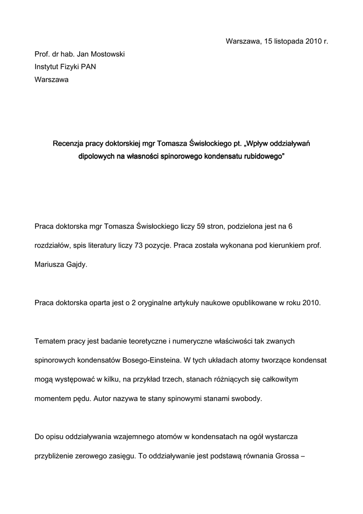 Warszawa, 15 listopada 2010 r. Prof. dr hab. Jan Mostowski Instytut Fizyki PAN Warszawa Recenzja pracy doktorskiej mgr Tomasza Świsłockiego pt. „Wpływ oddziaływań dipolowych na własności spinorowego kondensatu rubidowego” Praca doktorska mgr Tomasza Świsłockiego liczy 59 stron, podzielona jest na 6 rozdziałów, spis literatury liczy 73 pozycje. Praca została wykonana pod kierunkiem prof. Mariusza Gajdy. Praca doktorska oparta jest o 2 oryginalne artykuły naukowe opublikowane w roku 2010. Tematem pracy jest badanie teoretyczne i numeryczne właściwości tak zwanych spinorowych kondensatów Bosego-Einsteina. W tych układach atomy tworzące kondensat mogą występować w kilku, na przykład trzech, stanach różniących się całkowitym momentem pędu. Autor nazywa te stany spinowymi stanami swobody. Do opisu oddziaływania wzajemnego atomów w kondensatach na ogół wystarcza przybliżenie zerowego zasięgu. To oddziaływanie jest podstawą równania Grossa – Pitajevskiego, szeroko używanego w opisie kondensatów. Jednakże atomy mogą oddziaływać na siebie również siłami o dłuższym zasięgu, na przykład pochodzącymi od magnetycznych momentów dipolowych. Takie oddziaływanie może istnieć w kondensatach spinorowych, gdy poszczególne atomy mogą znajdować się w stanach o różnych rzutach momentu pędu. Taka sytuacja może istnieć tylko w pułapce dipolowej, która w przeciwieństwie do pułapki magnetycznej zezwala na istnienie kondensatów spinorowych. Autor słusznie zwrócił już na wstępie uwagę na to, że oddziaływanie magnetyczne atomów w kondensacie jest znacznie słabsze niż oddziaływanie kontaktowe. Nawet w przypadku kondensatów z atomów chromu, atomów z dużym momentem giromagnetycznym, oddziaływanie magnetyczne jest słabe. W przypadku kondensatów rubinowych jest ono jeszcze wielokrotnie słabsze. Autor stwierdził więc, nie bez racji, że oddziaływania magnetyczne mogą mieć znaczenie jedynie w warunkach rezonansu. Ta analiza, jak również metody wytwarzania kondensatów spinorowych oraz podstawowe równania opisujące kondensat są treścią rozdziału drugiego. Ten rozdział stanowi wstęp do opisu własnych rezultatów autora przedstawionych w dalszych rozdziałach. Rozdział 3 opisuje procesy termalizacji atomów w różnych stanach spinowych. Jako stan początkowy autor przyjął stan w którym obsadzony jest jedynie składnik z zerową liczbą magnetyczną M=0, składniki z M=+1 i M=-1 nie są obsadzone. W stanie równowagi obsadzenie wszystkich wymienionych stanów powinno być identyczne. W pracy badana jest dynamika przejścia do stanu równowagi. Autor stwierdził, że proces osiągania stanu równowagi jest istotnie zmodyfikowany przez oddziaływania dipolowe. Jest tak dlatego, że w wyniku silniejszych oddziaływań kontaktowych tworzą się domeny spinowe. Oddziaływanie spinów z różnych domen jest bardzo słabe (oddziaływania kontaktowe mają bardzo krótki zasięg), dominują więc oddziaływania dipolowe. Pokazane zostało, że oddziaływania dipolowe znacząco przyspieszają dochodzenie do stanu równowagi. Należy stwierdzić, że podana tu analiza jest pierwszym ilościowym podejściem do zagadnienia dynamiki stanów spinowych. Wyniki te zostały opublikowane w roku 2010. Ciekawe są też uwagi dotyczące powstawania struktur spinowych w obecności pola magnetycznego. Autor stwierdził, że oddziaływania dipolowe nią mają większego znaczenia w powstawaniu tych struktur. Można tylko żałować, że te zjawiska potraktowane są w pracy pobieżnie. Bardzo ciekawa analiza fizyczna podana jest w rozdziale 4 dotyczącym zjawiska Einsteina – de Haasa. Klasyczne zjawisko Einsteina-de Haasa polega na przekazywaniu momentu pędu pomiędzy spinowym i makroskopowym momentem pędu przy magnesowaniu układu. Analogiem tego zjawiska jest przekazywanie momentu pędu pomiędzy stanami wewnętrznymi atomów tworzących kondensat a makroskopowym momentem pędu kondensatu jako całości. Przekazywanie momentu pędu jest wynikiem oddziaływań dipolowych. Jak wspomniano, oddziaływania te są słabe, dlatego wydajny przekaz momentu pędu może nastąpić jedynie w warunkach rezonansu. Takie rezonanse powstają wtedy, gdy różnice energii poszczególnych stanów spinowych, zależnych od pola magnetycznego, są równe różnicy poziomów energetycznych stanów środka masy kondensatu w pułapce. A więc dobierając rezonansową wartość pola magnetycznego można uzyskać przekaz momentu pędu od wewnętrznych stopni swobody do ruchu środka masy. W ten sposób kondensat uzyskuje makroskopowy moment pędu. Ten mechanizm powstawania makroskopowego momentu pędu, czyli wirów, w kondensacie został dokładnie zbadany przez autora. Autor podał i przedyskutował dokładne warunki, w których wystąpią różne rodzaje wirów. Jest to moim zdaniem bardzo ważny wynik. Dotychczas nie był znany taki sposób przekazu momentu pędu pomiędzy wewnętrznymi stopniami swobody i ruchem środka masy. Nad przeprowadzeniem takich doświadczeń pracuje kilka grup doświadczalnych. Ostatni, piąty rozdział dotyczy kondensatów w sieci optycznej. Sieć optyczna stwarza cały szereg możliwości modyfikowania właściwości kondensatów. Wiele związanych z tym zjawisk zostało zbadanych w ostatnich latach, dotyczyły one kondensatów bez spinowych stopni swobody. Kondensaty spinorowe w sieci optycznej to zupełnie nowa dziedzina. Autor rozważał niewielkie układy atomów rubidu ze spinowymi stopniami swobody w sieci optycznej. Każdy z atomów znajdował się w osobnej studni potencjału i w stałym jednorodnym polu magnetycznym. Oddziaływanie dipolowe powodowało sprzężenie funkcji falowych poszczególnych atomów i możliwe przejścia pomiędzy stanami o różnych spinach. Dodatkowym parametrem jest głębokość poszczególnych studni potencjału, co przekłada się na łatwe lub trudne tunelowanie pomiędzy studniami. Autor p