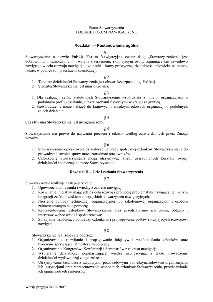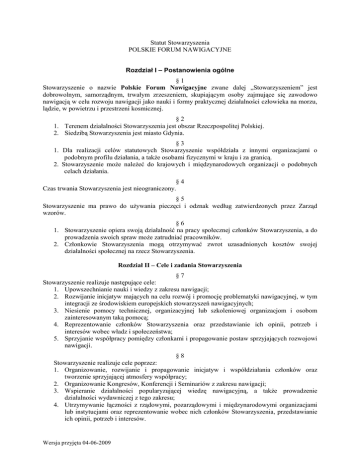 Statut Stowarzyszenia POLSKIE FORUM NAWIGACYJNE Rozdział I