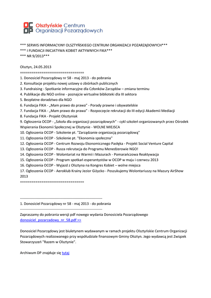 *** SERWIS INFORMACYJNY OLSZTYŃSKIEGO CENTRUM ORGANIZACJI POZARZĄDOWYCH*** *** I FUNDACJI INICJATYWA KOBIET AKTYWNYCH FIKA*** *** NR 9/2013*** Olsztyn, 24.05.2013 ================================= 1. Donosiciel Pozarządowy nr 58 - maj 2013 - do pobrania 2. Konsultacje projektu nowej ustawy o zbiórkach publicznych 3. Fundraising - Spotkanie informacyjne dla Członków Zarządów – zmiana terminu 4. Publikacje dla NGO online - poznajcie wirtualne biblioteki dla III sektora 5. Bezpłatne doradztwo dla NGO 6. Fundacja FIKA - „Mam prawo do prawa” - Porady prawne i obywatelskie 7. Fundacja FIKA - „Mam prawo do prawa” - Rozpoczęcie rekrutacji do III edycji Akademii Mediacji 8. Fundacja FIKA - Projekt Olsztyniak 9. Ogłoszenia OCOP - „Szkoła dla organizacji pozarządowych” - cykl szkoleń organizowanych przez Ośrodek Wspierania Ekonomii Społecznej w Olsztynie - WOLNE MIEJSCA 10. Ogłoszenia OCOP - Szkolenie pt. "Zarządzanie organizacją pozarządową" 11. Ogłoszenia OCOP - Szkolenie pt. "Ekonomia społeczna" 12. Ogłoszenia OCOP - Centrum Rozwoju Ekonomicznego Pasłęka - Projekt Social Venture Capital 13. Ogłoszenia OCOP - Rusza rekrutacja do Programu Menedżerowie NGO! 14. Ogłoszenia OCOP - Wolontariat na Warmii i Mazurach - Pomarańczowa Reaktywacja 15. Ogłoszenia OCOP - Program spotkań esperantystów w OCOP w maju i czerwcu 2013 16. Ogłoszenia OCOP - Wyjazd z Olsztyna na Kongres Kobiet – wolne miejsca 17. Ogłoszenia OCOP - Aeroklub Krainy Jezior Giżycko - Poszukujemy Wolontariuszy na Mazury AirShow 2013 ================================= --------------------------------------------------------------------1. Donosiciel Pozarządowy nr 58 - maj 2013 - do pobrania --------------------------------------------------------------------Zapraszamy do pobrania wersji pdf nowego wydania Donosiciela Pozarządowego donosiciel_pozarzadowy_nr_58.pdf >> Donosiciel Pozarządowy jest biuletynem wydawanym w ramach projektu Olsztyńskie Centrum Organizacji Pozarządowych realizowanego przy współudziale finansowym Gminy Olsztyn. Jego wydawcą jest Związek Stowarzyszeń "Razem w Olsztynie". Archiwum DP znajduje się tutaj -----------------------------------------------------------------2. Konsultacje projektu nowej ustawy o zbiórkach publicznych -----------------------------------------------------------------Ministerstwo Administracji i Cyfryzacji rozpoczyna otwarte konsultacje projektu nowej ustawy o zbiórkach publicznych, które potrwają od 15 maja do 5 czerwca 2013. Wszyscy zainteresowani zmianami mogą zgłaszać swoje uwagi za pomocą portalu mamzdanie.org.pl, nadsyłać je pocztą tradycyjną lub emailem. Zobacz więcej >> --------------------------------------------------------------------3. Fundraising - Spotkanie informacyjne dla Członków Zarządów – zmiana terminu --------------------------------------------------------------------Angażując się w budowanie społeczeństwa obywatelskiego w Polsce, Polskie Stowarzyszenie Fundraisingu promuje fundraising jako skuteczną i etyczną metodę tworzenia niezależności finansowej organizacji. W związku z tym zainicjowany został wyjątkowy projekt – „Polski Fundraising”. Spotkanie z przedstawicielami Zarządów na temat wprowadzania fundraisingu w Olsztynie odbędzie się 13 czerwca (czwartek), godz. 11:00 - 13:30 w Olsztyńskim Centrum Organizacji Pozarządowych, ul. Tarasa Szewczenki 1. Spotkanie poprowadzi prezes Polskiego Stowarzyszenia Fundraisingu - p. Jerzy Mika. Zgłoś się: www.polski.fundraising.org.pl/szkolenia/dla-zarzadu/formularz-zgloszeniowy/ Zobacz więcej >> --------------------------------------------------------------------4. Publikacje dla NGO online - poznajcie wirtualne biblioteki dla III sektora --------------------------------------------------------------------Na stronie konkursy-dla-ngo.blogspot.com opublikowany został katalog "wirtualnych bibliotek", które pozwalają na zdalny dostęp do wielu przydatnych publikacji dla NGO w jednym miejscu. --------------------------------------------------------------------5. Bezpłatne doradztwo dla NGO --------------------------------------------------------------------Olsztyńskie Centrum Organizacji Pozarządowych oferuje bezpłatną pomoc przy przygotowaniu ofert konkursowych. Organizacje zainteresowane ofertą OCOP proszone są o kontakt: [email protected] Tel. 503 680 500 Bezpłatne doradztwo uzyskać można również w zakresie m.in.: rozliczania ofert z realizacji zadań publicznych oraz pisania i rozliczania projektów. Osoby zajmujące się w organizacji sprawami księgowymi i finansowymi zapraszamy do skorzystania z bezpłatnego doradztwa w Olsztyńskim Centrum Organizacji Pozarządowych we wtorki g.17.00-19.00. Miejsce: Olsztyńskie Centrum Organizacji Pozarządowych, ul. Tarasa Szewczenki 1, 10-274 Olsztyn mapa >> Doradztwo jest organizowane przez Związek Stowarzyszeń „Razem w Olsztynie” w ramach projektu „Olsztyńskie Centrum Organizacji Pozarządowych" realizowanego przy współudziale finansowym Gminy Olsztyn oraz projektu "W kierunku profesjonalizacji" współfinansowanego przez Powiat Olsztyński. --------------------------------------------------------------------6. Fundacja FIKA - „Mam prawo do prawa” - Porady prawne i obywatelskie --------------------------------------------------------------------W ramach projektu "Mam prawo do prawa" realizowanego przez Fundację FIKA prowadzone są bezpłatne porady prawne i obywatelskie, spotkania z doradcami i ekspertami. W trakcie porad istnieje możliwość uzyskania pomocy przy sporządzaniu min. pism, odwołań, wniosków, powództw, itp. Prowadzone jest również doradztwo prawne dla przedstawicieli NGO. Zapraszamy do Punktu Konsultacyjnego Projektu przy ul. Tarasa Szewczenki 1, 10-274 Olsztyn mapa >> Dyżury ekspertów i doradców - środy 11.00-14.00 - piątki 11.00-14.00 Pytania dotyczące aspektów prawnych powstawania i funkcjonowania organizacji pozarządowych 