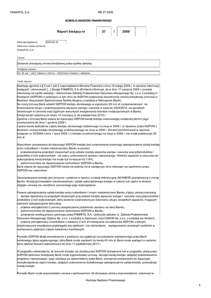 PAMAPOL S.A. RB 27 2009 KOMISJA NADZORU FINANSOWEGO Raport bieżący nr Data sporządzenia: 27 / 2009 2009-08-18 Skrócona nazwa emitenta PAMAPOL S.A. Temat Zawarcie znaczącej umowy kredytowej przez spółkę zależną Podstawa prawna Art. 56 ust. 1 pkt 2 Ustawy o ofercie - informacje bieżące i okresowe Treść raportu: Działając zgodnie z § 5 ust.1 pkt 3 rozporządzenia Ministra Finansów z dnia 19 lutego 2009 r. w sprawie informacji bieżących i okresowych […] Zarząd PAMAPOL S.A. (Emitent) informuje, że w dniu 17 sierpnia 2009 r. powziął informację od spółki zależnej – Warmińskie Zakłady Przetwórstwa Owocowo-Warzywnego Sp. z o.o. z siedzibą w Kwidzynie (WZPOW) o wpłynięciu w tym dniu do WZPOW podpisanej dwustronnie umowy kredytowej (Umowa) z Bankiem Gospodarki Żywnościowej Spółka Akcyjna z siedzibą w Warszawie (Bank). Na mocy Umowy Bank udzielił WZPOW kredytu obrotowego w wysokości 28 mln zł z przeznaczeniem na finansowanie skupu i przechowywania zapasów warzyw i owoców w sezonie 2009/2010, na zasadach określonych w Umowie oraz Ogólnych warunkach kredytowania klientów instytucjonalnych w Banku. Kredyt został udzielony na okres 14 miesięcy, tj. do października 2010 r. Zgodnie z Umową Bank stawia do dyspozycji WZPOW kwotę kredytu ustanawiając ostateczny termin jego uruchomienia do dnia 1 grudnia 2009 r. Łączna kwota zadłużenia z tytułu kredytu obrotowego udzielonego na skup w 2008 r. (o zawarciu przez WZPOW z Bankiem umowy kredytu obrotowego przeznaczonego na skup w 2008 r. Emitent poinformował w raporcie bieżącym nr 33/2008 z dnia 1 lipca 2008 r.) i kredytu uruchomionego na skup w 2009 r. nie może przekroczyć 28 mln zł. Warunkiem postawienia do dyspozycji WZPOW kredytu jest ustanowienie prawnego zabezpieczenia spłaty kredytu wraz z odsetkami i innymi należnościami Banku w postaci: - przewłaszczenia przyszłych skupionych przy udziale kredytu zapasów warzyw i owoców oraz półproduktów i produktów z nich wytworzonych - do czasu ustanowienia zastawu rejestrowego. Wartość zapasów w stosunku do wykorzystanej kwoty kredytu nie może być mniejsza niż 116%, - pełnomocnictwa do dysponowania rachunkami WZPOW w Banku. Bank stawia do dyspozycji WZPOW kredyt nie później niż w następnym dniu roboczym po spełnieniu przez WZPOW ww. warunków. Oprocentowanie kredytu jest zmienne i ustalone w oparciu o stopę referencyjną 3M WIBOR powiększoną o marżę Banku. Kredyt jest kredytem nieodnawialnym, spłata wykorzystanego kredytu w całości lub części w okresie objętym umową nie umożliwia ponownego jego wykorzystania. Prawne zabezpieczenie spłaty kredytu wraz z odsetkami i innymi należnościami Banku z tytułu umowy stanowią: - zastaw rejestrowy na przyszłych skupionych przy udziale kredytu zapasów warzyw i owoców oraz półproduktów i produktów z nich wytworzonych, który zostanie ustanowiony po dokonaniu skupu wszystkich zapasów, mających stanowić zabezpieczenie transakcji, - przelew wierzytelności z umowy ubezpieczenia przedmiotu zastawu na rzecz Banku, - pełnomocnictwo do dysponowania rachunkami WZPOW w Banku, - poręczenie według prawa cywilnego przez PAMAPOL S.A. i jednostki zależne, tj.: Zakłady Przetwórstwa Owocowo-Warzywnego Ziębice Sp. z o.o. z siedzibą w Ziębicach, oraz CENOS Sp. z o.o. z siedzibą we Wrześni, - przelew wierzytelności z kontraktów o wartości 2 mln zł miesięcznie od odbiorców WZPOW, z którymi dotychczasowa współpraca przebiegała bez zakłóceń i nie stwierdzono występowania znacznych opóźnień w realizowaniu płatności z tytułu należności handlowych. Ponadto WZPOW złożył oświadczenie o poddaniu się egzekucji na podstawie wystawionego przez Bank bankowego tytułu egzekucyjnego, który Bank może wystawić do kwoty 42 mln zł. Bank może wystąpić o nadanie temu tytułowi klauzuli wykonalności do dnia 11 października 2013 r. W przypadku stwierdzenia, że warunki kredytu nie zostały przez WZPOW dotrzymane lub w przypadku utraty przez WZPOW zdolności kredytowej Bank może wypowiedzieć umowę, obniżyć kwotę kredytu, zażądać przedstawienia programu naprawczego i jego realizacji po zatwierdzeniu przez Bank, wstrzymać postawienie do dyspozycji niewykorzystanej części kredytu, zażądać ustanowienia dodatkowego zabezpieczenia spłaty kredytu, podwyższyć marżę kredytu. Ponadto Bank może wypowiedzieć umowę z zachowaniem 30-dniowego okresu wypowiedzenia, natomiast w Komisja Nadzoru Finansowego 1 PAMAPOL S.A. RB 27 2009 Ponadto Bank może wypowiedzieć umowę z zachowaniem 30-dniowego okresu wypowiedzenia, natomiast w razie zagrożenia upadłością WZPOW z zachowaniem 7-dniowego okresu wypowiedzenia. WZPOW mogą wypowiedzieć umowę z zachowaniem 3 miesięcznego okresu wypowiedzenia Pozostałe warunki umowy nie odbiegają od warunków powszechnie stosowanych dla tego rodzaju umów. Jako kryterium uznania umowy za znaczącą przyjęto wartość 10% kapitałów własnych Emitenta (kapitały własne Emitenta na koniec I kwartału 2009 r. wyniosły 121.726 tys. zł). PAMAPOL SPÓŁKA AKCYJNA (pełna nazwa emitenta) PAMAPOL S.A. Spożywczy (spo) (skróc ona nazwa emitenta) 97-438 (sektor wg. klasyfikacji GPW w W-wie) Rusiec (kod pocztowy) (miejscowość) Wieluńska 2 2 (ulica) (numer) (telefon) (fax) (e-mail) (www) (NIP) (REGON) PODPISY OSÓB REPREZENTUJĄCYCH SPÓŁKĘ Data Imię i Nazwisko Stanowisko/Funkc ja Podpis 2009-08-18 Krzysztof Półgrabia Prezes Zarządu Krzysztof Półgrabia Komisja Nadzoru Finansowego 2