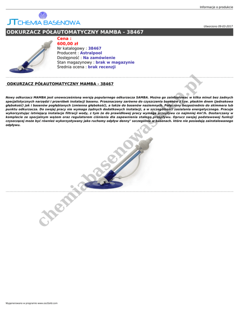 Informacje o produkcie Utworzono 09-03-2017 ODKURZACZ PÓŁAUTOMATYCZNY MAMBA - 38467 Cena : 600,00 zł Nr katalogowy : 38467 Producent : Astralpool Dostępność : Na zamówienie Stan magazynowy : brak w magazynie Średnia ocena : brak recenzji .p l ODKURZACZ PÓŁAUTOMATYCZNY MAMBA - 38467 ch em ia ba se no w as kl ep Nowy odkurzacz MAMBA jest unowocześnioną wersją popularnego odkurzacza SAMBA. Można go zaintsalowac w kilka minut bez żadnych specjalistycznych narzędzi i przeróbek instalacji basenu. Przeznaczony zarówno do czyszczenia basenów z tzw. płaskim dnem (jednakowa głębokość) jak i basenów pogłębianych (zmienna głębokość), a także do basenów naziemnych. Połączony bezpośrednio do skimmera lub punktu odkurzacza. Do swojej pracy nie wymaga żądnych dodatkowych instalacji, a w szczególności zasialania energetycznego. Pracuje wykorzystując istniejącą instalacje filtracji wody, z tym że do prawidłowej pracy wymaga przepływu co najmniej 4m3/h. Dostarczany w komplecie ze specjalnym wężem oraz regulatorem ciśnienia dla zapewnienia stałego przepływu. Oprucz swojej podstawowej funksji czyszczącej może być również wykorzystywany jako ruchomy odpływ denny" szczególnie w basenach. które nie posiadają zainstalowanego odpływu. Wygenerowano w programie www.oscGold.com