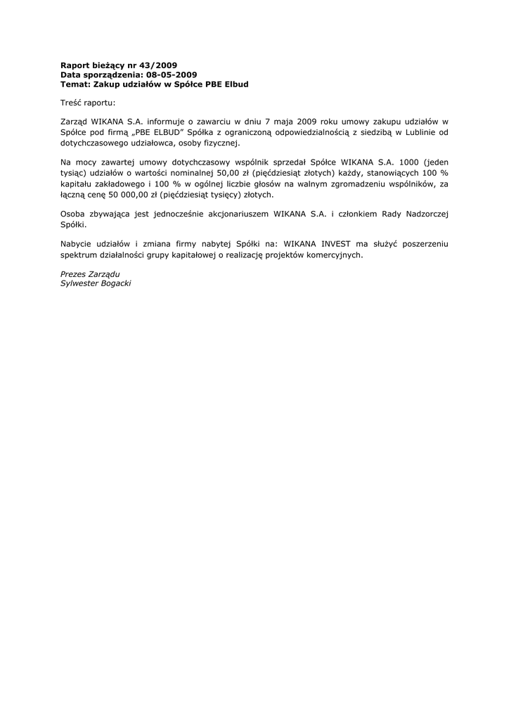 Raport bieŜący nr 43/2009 Data sporządzenia: 08-05-2009 Temat: Zakup udziałów w Spółce PBE Elbud Treść raportu: Zarząd WIKANA S.A. informuje o zawarciu w dniu 7 maja 2009 roku umowy zakupu udziałów w Spółce pod firmą „PBE ELBUD” Spółka z ograniczoną odpowiedzialnością z siedzibą w Lublinie od dotychczasowego udziałowca, osoby fizycznej. Na mocy zawartej umowy dotychczasowy wspólnik sprzedał Spółce WIKANA S.A. 1000 (jeden tysiąc) udziałów o wartości nominalnej 50,00 zł (pięćdziesiąt złotych) kaŜdy, stanowiących 100 % kapitału zakładowego i 100 % w ogólnej liczbie głosów na walnym zgromadzeniu wspólników, za łączną cenę 50 000,00 zł (pięćdziesiąt tysięcy) złotych. Osoba zbywająca jest jednocześnie akcjonariuszem WIKANA S.A. i członkiem Rady Nadzorczej Spółki. Nabycie udziałów i zmiana firmy nabytej Spółki na: WIKANA INVEST ma słuŜyć poszerzeniu spektrum działalności grupy kapitałowej o realizację projektów komercyjnych. Prezes Zarządu Sylwester Bogacki