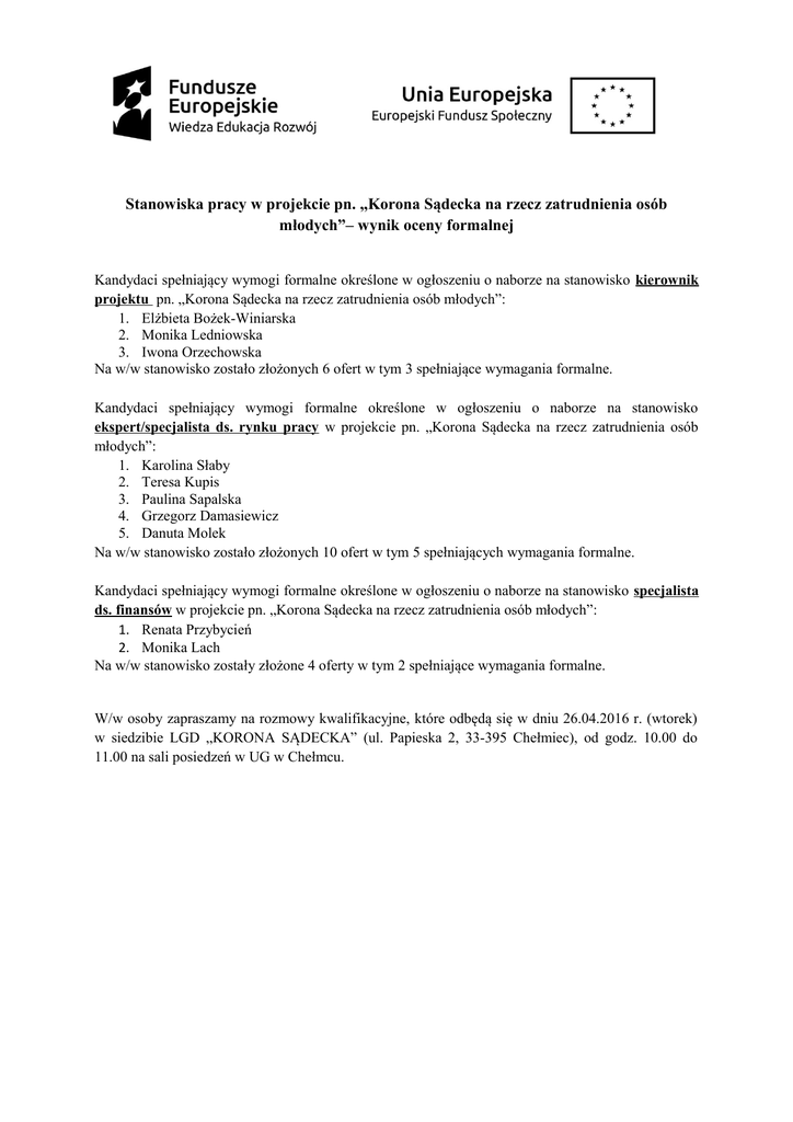 Stanowiska pracy w projekcie pn. „Korona Sądecka na rzecz zatrudnienia osób młodych”– wynik oceny formalnej Kandydaci spełniający wymogi formalne określone w ogłoszeniu o naborze na stanowisko kierownik projektu pn. „Korona Sądecka na rzecz zatrudnienia osób młodych”: 1. Elżbieta Bożek-Winiarska 2. Monika Ledniowska 3. Iwona Orzechowska Na w/w stanowisko zostało złożonych 6 ofert w tym 3 spełniające wymagania formalne. Kandydaci spełniający wymogi formalne określone w ogłoszeniu o naborze na stanowisko ekspert/specjalista ds. rynku pracy w projekcie pn. „Korona Sądecka na rzecz zatrudnienia osób młodych”: 1. Karolina Słaby 2. Teresa Kupis 3. Paulina Sapalska 4. Grzegorz Damasiewicz 5. Danuta Molek Na w/w stanowisko zostało złożonych 10 ofert w tym 5 spełniających wymagania formalne. Kandydaci spełniający wymogi formalne określone w ogłoszeniu o naborze na stanowisko specjalista ds. finansów w projekcie pn. „Korona Sądecka na rzecz zatrudnienia osób młodych”: 1. Renata Przybycień 2. Monika Lach Na w/w stanowisko zostały złożone 4 oferty w tym 2 spełniające wymagania formalne. W/w osoby zapraszamy na rozmowy kwalifikacyjne, które odbędą się w dniu 26.04.2016 r. (wtorek) w siedzibie LGD „KORONA SĄDECKA” (ul. Papieska 2, 33-395 Chełmiec), od godz. 10.00 do 11.00 na sali posiedzeń w UG w Chełmcu.