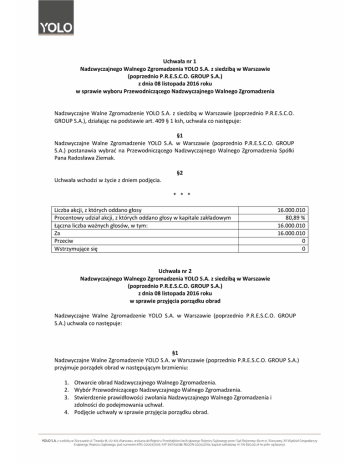 Uchwała nr 1 Nadzwyczajnego Walnego Zgromadzenia YOLO S.A. z siedzibą w Warszawie (poprzednio P.R.E.S.C.O. GROUP S.A.) z dnia 08 listopada 2016 roku w sprawie wyboru Przewodniczącego Nadzwyczajnego Walnego Zgromadzenia Nadzwyczajne Walne Zgromadzenie YOLO S.A. z siedzibą w Warszawie (poprzednio P.R.E.S.C.O. GROUP S.A.), działając na podstawie art. 409 § 1 ksh, uchwala co następuje: §1 Nadzwyczajne Walne Zgromadzenie YOLO S.A. w Warszawie (poprzednio P.R.E.S.C.O. GROUP S.A.) postanawia wybrać na Przewodniczącego Nadzwyczajnego Walnego Zgromadzenia Spółki Pana Radosława Ziemak. §2 Uchwała wchodzi w życie z dniem podjęcia. * * * Liczba akcji, z których oddano głosy Procentowy udział akcji, z których oddano głosy w kapitale zakładowym Łączna liczba ważnych głosów, w tym: Za Przeciw Wstrzymujące się 16.000.010 80,89 % 16.000.010 16.000.010 0 0 Uchwała nr 2 Nadzwyczajnego Walnego Zgromadzenia YOLO S.A. z siedzibą w Warszawie (poprzednio P.R.E.S.C.O. GROUP S.A.) z dnia 08 listopada 2016 roku w sprawie przyjęcia porządku obrad Nadzwyczajne Walne Zgromadzenie YOLO S.A. w Warszawie (poprzednio P.R.E.S.C.O. GROUP S.A.) uchwala co następuje: §1 Nadzwyczajne Walne Zgromadzenie YOLO S.A. w Warszawie (poprzednio P.R.E.S.C.O. GROUP S.A.) przyjmuje porządek obrad w następującym brzmieniu: 1. Otwarcie obrad Nadzwyczajnego Walnego Zgromadzenia. 2. Wybór Przewodniczącego Nadzwyczajnego Walnego Zgromadzenia. 3. Stwierdzenie prawidłowości zwołania Nadzwyczajnego Walnego Zgromadzenia i zdolności do podejmowania uchwał. 4. Podjęcie uchwały w sprawie przyjęcia porządku obrad. 5. Podjęcie uchwały w sprawie dopuszczenia mediów do relacjonowania przebiegu obrad Nadzwyczajnego Walnego Zgromadzenia. 6. Podjęcie uchwały w sprawie połączenia YOLO SPÓŁKA AKCYJNA z siedzibą w Warszawie (poprzednio P.R.E.S.C.O. GROUP S.A.) i Europejskiego Funduszu Poręczeniowego Sp. z o.o. 7. Podjęcie uchwały w sprawie połączenia YOLO SPÓŁKA AKCYJNA z siedzibą w Warszawie (poprzednio P.R.E.S.C.O. GROUP S.A.) i Debet Partner Sp. z o.o. 8. Wolne głosy i wnioski. 9. Zamknięcie obrad Nadzwyczajnego Walnego Zgromadzenia. §2 Uchwała wchodzi w życie z dniem podjęcia. * * * Liczba akcji, z których oddano głosy Procentowy udział akcji, z których oddano głosy w kapitale zakładowym Łączna liczba ważnych głosów, w tym: Za Przeciw Wstrzymujące się 16.000.010 80,89 % 16.000.010 16.000.010 0 0 Uchwała nr 3 Nadzwyczajnego Walnego Zgromadzenia YOLO S.A. z siedzibą w Warszawie (poprzednio P.R.E.S.C.O. GROUP S.A.) z dnia 08 listopada 2016 roku w sprawie dopuszczenia mediów do relacjonowania przebiegu obrad Nadzwyczajnego Walnego Zgromadzenia Nadzwyczajne Walne Zgromadzenie YOLO SPÓŁKA AKCYJNA z siedzibą w Warszawie (poprzednio P.R.E.S.C.O. GROUP S.A.), działając na podstawie § 17 ust. 3 Regulaminu Walnego Zgromadzenia, uchwala co następuje: §1 Nadzwyczajne Walne Zgromadzenie YOLO SPÓŁKA AKCYJNA z siedzibą w Warszawie (poprzednio P.R.E.S.C.O. GROUP S.A.) postanawia dopuścić media do relacjonowania przebiegu obrad Nadzwyczajnego Walnego Zgromadzenia. §2 Uchwała wchodzi w życie z dniem podjęcia. * * * Liczba akcji, z których oddano głosy Procentowy udział akcji, z których oddano głosy w kapitale zakładowym Łączna liczba ważnych głosów, w tym: Za Przeciw Wstrzymujące się 16.000.010 80,89 % 16.000.010 16.000.010 0 0 Uchwała nr 4 Nadzwyczajnego Walnego Zgromadzenia YOLO S.A. z siedzibą w Warszawie (poprzednio P.R.E.S.C.O. GROUP S.A.) z dnia 08 listopada 2016 roku w sprawie połączenia YOLO SPÓŁKA AKCYJNA z siedzibą w Warszawie (poprzednio P.R.E.S.C.O. GROUP S.A.) i Europejskiego Funduszu Poręczeniowego Sp. z o.o. §1 Nadzwyczajne Walne Zgromadzenie Akcjonariuszy YOLO SPÓŁKA AKCYJNA z siedzibą w Warszawie (poprzednio P.R.E.S.C.O. GROUP S.A.) działając na podstawie art. 506 Ustawy z dnia 15 września 2000 roku Kodeks spółek handlowych (Dz.U.2013.1030 z dnia 2013.09.06, ze zm.) (k.s.h.) postanawia o połączeniu, w trybie art. 492 § 1 pkt 1 k.s.h., spółki YOLO SPÓŁKA AKCYJNA z siedzibą w Warszawie (poprzednio P.R.E.S.C.O. GROUP S.A.), przy ul. Twardej 18, 00-105 Warszawa, wpisanej do Rejestru Przedsiębiorców Krajowego Rejestru Sądowego prowadzonego przez Sąd Rejonowy dla m. st. Warszawy w Warszawie, XII Wydział Gospodarczy KRS pod numerem 0000372319 („PG”, „Spółka Przejmująca”), jako spółki przejmującej, ze spółką Europejski Fundusz Poręczeniowy Sp. z o.o.z siedzibą w Warszawie, przy ul. Mokotowskiej 15A lok 17, 00-640 Warszawa, wpisanej do Rejestru Przedsiębiorców Krajowego rejestru Sądowego prowadzonego przez Sąd Rejonowy dla m.st. Warszawy w Warszawie, XII Wydział Gospodarczy Krajowego Rejestru Sądowego pod numerem KRS: 0000437412 („EFP”, „Spółka Przejmowana”), jako spółką przejmowaną, tj. poprzez przeniesienie na Spółkę Przejmującą całego majątku Spółki Przejmowanej. §2 Nadzwyczajne Walne Zgromadzenie Akcjonariuszy YOLO SPÓŁKA AKCYJNA z siedzibą w Warszawie (poprzednio P.R.E.S.C.O. GROUP S.A.) działając na podstawie art. 506 § 4 k.s.h. wyraża zgodę na plan połączenia uzgodniony pomiędzy Spółką Przejmującą, a Spółką Przejmowaną i podpisany w dniu 16 września 2016 roku, który zgodnie z art. 500 § 21 k.s.h. został udostępniony na stronie internetowej Spółki Przejmującej pod adresem http://presco.pl/lad-korporacyjny.phporaz opublikowany w Raporcie Bieżącym PG nr 25/2016 z dnia 16 września 2016 roku oraz na stronie internetowej Spółki Przejmowanej pod adresem http://funduszporeczeniowy.eu/do-pobrania/ („Plan Połączenia”), który stanowi Załącznik nr 1 do niniejszej Uchwały. §3 Ze względu, iż Spółka Przejmująca jest jedynym wspólnikiem Spółki Przejmowanej posiadającym wszystkie udziały w kapitale zakładowym EFP oraz dysponującym wszystkimi głosami na Zgromadzeniu Wspólników EFP, połączenie przez przejecie zostaje doko