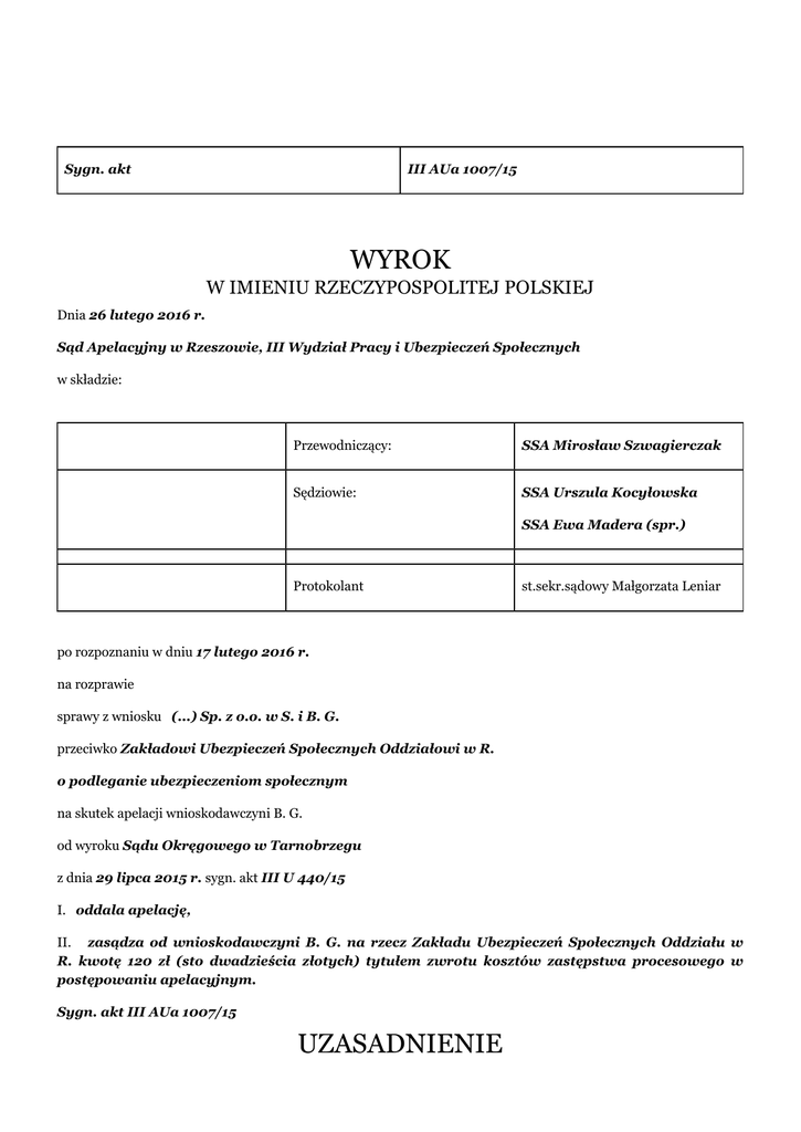 Sygn. akt III AUa 1007/15 WYROK W IMIENIU RZECZYPOSPOLITEJ POLSKIEJ Dnia 26 lutego 2016 r. Sąd Apelacyjny w Rzeszowie, III Wydział Pracy i Ubezpieczeń Społecznych w składzie: Przewodniczący: SSA Mirosław Szwagierczak Sędziowie: SSA Urszula Kocyłowska SSA Ewa Madera (spr.) Protokolant st.sekr.sądowy Małgorzata Leniar po rozpoznaniu w dniu 17 lutego 2016 r. na rozprawie sprawy z wniosku (...) Sp. z o.o. w S. i B. G. przeciwko Zakładowi Ubezpieczeń Społecznych Oddziałowi w R. o podleganie ubezpieczeniom społecznym na skutek apelacji wnioskodawczyni B. G. od wyroku Sądu Okręgowego w Tarnobrzegu z dnia 29 lipca 2015 r. sygn. akt III U 440/15 I. oddala apelację, II. zasądza od wnioskodawczyni B. G. na rzecz Zakładu Ubezpieczeń Społecznych Oddziału w R. kwotę 120 zł (sto dwadzieścia złotych) tytułem zwrotu kosztów zastępstwa procesowego w postępowaniu apelacyjnym. Sygn. akt III AUa 1007/15 UZASADNIENIE Decyzją z 17 grudnia 2014 r. Zakład Ubezpieczeń Społecznych Oddział w R. na podstawie art. 83 ust. l pkt. 1 i 3, art. 6 ust. 1 pkt. 4, art. 12 ust. 1, art. 13 pkt. 2, art. 18 ust. 1 i 3, art. 20 ust. 1, art. 36 ust. 1, 2, 4, 11 ustawy z 13.10.1998 r. o systemie ubezpieczeń społecznych oraz art. 81 ust. 1 i ust. 6 ustawy z 27.08.2004r., o świadczeniach opieki zdrowotnej finansowanych ze środków publicznych stwierdził, że B. G. jako zleceniobiorca u płatnika składek (...) Spółka z o.o. z siedzibą w S. podlega obowiązkowo ubezpieczeniom emerytalnemu, rentowym, wypadkowemu od 3.01.2011 r. do 31.12.2011 r., od 2.01.2012 r. do 31.12.2012r., od 2.01.2013 r. do 31.12.2013 r. oraz od 2.01.2014 r. Na uzasadnienie powyższego stanowiska organ rentowy wskazał wyniki przeprowadzonej kontroli okresowej u płatnika składek (...) Spółka z o.o. z siedzibą w S., z których wynika, że płatnik składek zawarł z B. G. umowy, nazwane przez strony umowami o dzieło: 3.01.2011r. na okres od 3.01.2011r. do 31.12.2011r., 2.01.2012r. obejmująca okres od 2.01.2012r. do 31.12.2012r., 2.01.2013r. na okres od 2.01.2013r. do 31.12.2013r., 2.01.2014r. na okres od 2.01.2014r. do 31.12.2014r. Przedmiot umowy określono jako zmontowanie złączek, zraszaczy i ostrzy tnących, żyłki budowlanej w ilościach ustalonych między stronami. Wykonanie dzieła następowało partiami w ilościach i terminach określonych załącznikiem nr 1 do umowy. Odbiór poszczególnych partii zmontowanych elementów następował w siedzibie (...) Sp. z o.o. w S. po zawiadomieniu przez wykonawcę o ich wykonaniu w całości. Wykonawca wykonywał zamówione dzieło z materiałów powierzonych przez zamawiającego. Przekazanie materiałów było każdorazowo udokumentowane zgodnie z umową, protokołem zdawczo – odbiorczym, podpisanym przez strony. Wykonawca po zakończeniu dzieła zobowiązany był rozliczyć się z otrzymanych materiałów i narzędzi oraz zwrócić te, których nie zużył do wykonania dzieła. Zamawiający zobowiązywał się do zapłaty wynagrodzenia za prawidłowe wykonanie dzieła wg. cennika stanowiącego załącznik nr 2 do umowy. Strony nie umówiły się z góry na określony rezultat, a podejmowane przez B. G. czynności w ramach wykonania powyższych umów pozbawione były cech indywidualności. Przed przystąpieniem do pracy B. G. została poinstruowana co do sposobu zmontowania poszczególnych elementów. Sam zaś proces montażu stanowił zespól prostych, zestandaryzowanych i powtarzalnych czynności. Powyższe, w ocenie organu rentowego, uzasadnia uznanie umów zawartych pomiędzy (...) Sp. z o.o. a B. G. za umowy zlecenia, a nie za umowy o dzieło, co z kolei skutkuje objęcie B. G. ubezpieczeniami emerytalnym, rentowymi i wypadkowym oraz naliczenie należnych składek – w okresach i wysokości jak w decyzji. Skarżąc powyższą decyzję odwołaniem B. G., reprezentowana przez profesjonalnego pełnomocnika, wniosła o uchylenie zaskarżonej decyzji i umorzenie postępowania lub uchylenie zaskarżonej decyzji i przekazanie sprawy do ponownego rozpoznania oraz zasądzenie kosztów postępowania. Zaskarżonej decyzji zarzuciła błędne ustalenia faktyczne polegające na przyjęciu, iż w zakwestionowanych umowach strony nie umówiły się z góry na określony rezultat, możliwy do jednoznacznego zweryfikowania po wykonaniu, gdy w rzeczywistości tak było, a wynagrodzenie przyjmującego zamówienie było bezpośrednio uzależnione od osiągnięcia założonego z góry rezultatu. Zarzuciła również naruszenie przepisów prawa materialnego tj. art. 627 kodeksu cywilnego poprzez dokonanie błędnej kwalifikacji prawnej umów zawartych między stronami jako umów zlecenia w sytuacji, gdy były to umowy o dzieło charakteryzujące się wszystkimi konstytutywnymi cechami określonymi dla tego stosunku prawnego. W uzasadnieniu odwołująca wskazała na błędne stanowisko organu rentowego stwierdzające, że umowy łączące strony nie miały na celu osiągnięcia z góry określonego rezultatu lecz strony umówiły się na wykonanie określonej pracy z należytą starannością. Przedmiotem umów było bowiem „dzieło w postaci zmontowania złączek, zraszaczy i ostrzy tnących oraz żyłki budowlanej w ilościach uzgodnionych między stronami”. Zaznaczyła, że w załączniku nr 1 do umów sprecyzowano konkretną liczbę poszczególnych produktów, które miały zostać wykonane przez przyjmującego zamówienie. W wyniku jego pracy, z wielu elementów powstawały konkretne produkty końcowe stanowiące elementy systemów nawadniania. Treścią umowy stron było więc osiągnięcie konkretnego rezultatu. Przedmiotem umowy był zatem konkretny, policzalny i weryfikowalny rezultat. Wynagrodzenie stanowiło iloczyn liczby produktów do wykonania oraz wynagrodzenia za jeden produkt. Podkreśliła, że zamawiającego nie interesował sposób, w jaki przyjmujący zamówienie wykonywał umowę. Przyjmujący wiedział jaką ilość produktu ma wykonać i jakie otrz