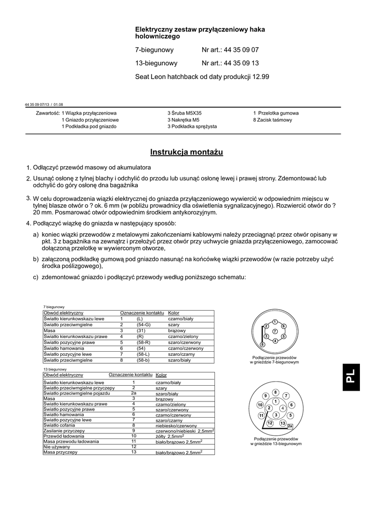 Elektryczny zestaw przyłączeniowy haka holowniczego 7-biegunowy 13-biegunowy Nr art.: 44 35 09 07 Nr art.: 44 35 09 13 Seat Leon hatchback od daty produkcji 12.99 44 35 09 07/13 / 01.08 Zawartość: 1 Wiązka przyłączeniowa 1 Gniazdo przyłączeniowe 1 Podkładka pod gniazdo 3 Śruba M5X35 3 Nakrętka M5 3 Podkładka spręŜysta 1 Przelotka gumowa 8 Zacisk taśmowy Instrukcja montaŜu 1. Odłączyć przewód masowy od akumulatora 2. Usunąć osłonę z tylnej blachy i odchylić do przodu lub usunąć osłonę lewej i prawej strony. Zdemontować lub odchylić do góry osłonę dna bagaŜnika 3. W celu doprowadzenia wiązki elektrycznej do gniazda przyłączeniowego wywiercić w odpowiednim miejscu w tylnej blasze otwór o ? ok. 6 mm (w pobliŜu prowadnicy dla oświetlenia sygnalizacyjnego). Rozwiercić otwór do ? 20 mm. Posmarować otwór odpowiednim środkiem antykorozyjnym. 4. Podłączyć wiązkę do gniazda w następujący sposób: a) koniec wiązki przewodów z metalowymi zakończeniami kablowymi naleŜy przeciągnąć przez otwór opisany w pkt. 3 z bagaŜnika na zewnątrz i przełoŜyć przez otwór przy uchwycie gniazda przyłączeniowego, zamocować dołączoną przelotkę w wywierconym otworze, b) załączoną podkładkę gumową pod gniazdo nasunąć na końcówkę wiązki przewodów (w razie potrzeby uŜyć środka poślizgowego), c) zdemontować gniazdo i podłączyć przewody według poniŜszego schematu: 7 biegunowy Obwód elektryczny Światło kierunkowskazu lewe Światło przeciwmgielne Masa Światło kierunkowskazu prawe Światło pozycyjne prawe Światło hamowania Światło pozycyjne lewe Światło przeciwmgielne Obwód elektryczny Kolor czarno/biały szary brązowy czarno/zielony szaro/czerwony czarno/czerwony szaro/czarny szaro/biały 1 2 7 3 4 8 6 5 Podłączenie przewodów w gnieździe 7-biegunowym Oznaczenie kontaktu Kolor Światło kierunkowskazu lewe Światło przeciwmgielne przyczepy Światło przeciwmgielne pojazdu Masa Światło kierunkowskazu prawe Światło pozycyjne prawe Światło hamowania Światło pozycyjne lewe Światło cofania Zasilanie przyczepy Przewód ładowania Masa przewodu ładowania Nie uŜywany Masa przyczepy 1 2 2a 3 4 5 6 7 8 9 10 11 12 13 czarno/biały szary szaro/biały brązowy czarno/zielony szaro/czerwony czarno/czerwony szaro/czarny niebiesko/czerwony czerwono/niebieski 2,5mm2 Ŝółty 2,5mm2 biało/brązowo 2,5mm2 biało/brązowo 2,5mm2 PL 13 biegunowy Oznaczenie kontaktu 1 (L) 2 (54-G) 3 (31) 4 (R) 5 (58-R) 6 (54) 7 (58-L) 8 (58-b) 8 9 10 11 2 12 1 3 7 4 13 6 5 2a Podłączenie przewodów w gnieździe 13-biegunowym 5. Gniazdo przyłączeniowe wraz z podkładką uszczelniającą zamontować przy pomocy dołączonych śrub i nakrętek na uchwycie gniazda: a) uwaŜać na prawidłowe zamocowanie podkładki, b) wiązkę elektryczną umocować w taki sposób aby nie powstały ostre załamania i nie była naraŜona na przetarcia. 6. Doprowadzić końcówkę wiązki przewodów z przewodem brązowym, czarno/zielonym, czarno-czerwonym i szaroczerwonym do prawej lampy pozycyjnej tylnej. a) Ściągnąć 6-biegunowe złącze pojazdu z lampy cofania i połączyć z pasującym odpowiednikiem z wiązki przewodów. Pozostałą obudowę wtykową wiązki przewodów nałoŜyć na lampę cofania. 7. Doprowadzić pozostałą końcówkę wiązki przewodów z 6-biegunowym złączem wtykowym do lewej lampy pozycyjnej tylnej. a) Ściągnąć 6-biegunowe złącze z lampy cofania i połączyć z pasującym odpowiednikiem z wiązki przewodów. Pozostałą obudowę wiązki przewodów nałoŜyć na lampę cofania. 8. Pozostałą końcówkę wiązki przewodów z 5-biegunowym złączem wtykowym przeprowadzić za osłoną lewej strony bagaŜnika. a) Znajdują się tam trzy złącza wtykowe. Odłączyć środkowe złącze (funkcja świateł przeciwmgielnych) i wetknąć do odpowiednich złączy z zestawu elektrycznego. b) Oba złącza wtykowe ponownie zatrzasnąć na kolumnę trzymającą. 9. Zasilanie przyczepy: Dotyczy tylko wersji 13-biegunowej. Obudowa 3-krotna (przewody brązowy, czerwono/niebieski, Ŝółty, biało/brązowy, biało/brązowy) przeznaczona jest do dodatkowych funkcji gniazda. Tę część wiązki przewodów naleŜy umieścić za osłoną. Celem poszerzenia funkcji gniazda przyłączeniowego naleŜy zamówić dodatkowe elementy: Funkcja ”stały plus i masa” nr art. 99 07 99 Funkcja ”stały plus, przewód ładowania i masa” nr art. 99 06 99 Wszystkie przewody zamocować dołączonymi zaciskami taśmowymi, zamontować wcześniej rozmontowane części. Podłączyć akumulator i sprawdzić wszystkie funkcje pojazdu z podłączoną przyczepą lub odpowiednim przyrządem testującym.
