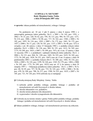 UCHWAŁA Nr XII/74/2007 Rady Miejskiej Gminy Nekla. z dnia 28 listopada 2007 roku w sprawie: inkasa podatku od nieruchomości, rolnego i leśnego Na podstawie art. 18 ust. 2 pkt 8 ustawy z dnia 8 marca 1990 r. o samorządzie gminnym (tekst jednolity: Dz.U. z 2001 r. Nr 142, poz. 1591; z 2002 r. Nr 23, poz. 220, Nr 62, poz. 558, Nr 113, poz. 984, Nr 153, poz. 1271, Nr 214, poz. 1806; z 2003 r. Nr 80, poz. 717, Nr 162, poz. 1568; z 2004 r. Nr 102, poz. 1055, Nr 116, poz. 1203; z 2005 r. Nr 172, poz. 1441, Nr 175, poz. 1457; z 2006 r. Nr 17, poz. 128; Nr 181, poz. 1337; z 2007 r. Nr 48, poz. 327) w związku z art. 6b ustawy z dnia 15 listopada 1984 r. o podatku rolnym (tekst jednolity: Dz.U. z 2006 r. Nr 136, poz. 969, Nr 191, poz. 1412, Nr 245, poz. 1775, Nr 249, poz. 1825; z 2007 r. Nr 109, poz. 747), art. 6 ust. 12 ustawy z dnia 12 stycznia 1991 r. o podatkach i opłatach lokalnych (tekst jednolity: Dz.U. z 2006 r., Nr 121, poz. 844, Nr 220, poz. 1601, Nr 225, poz. 1635, Nr 245, poz. 1775, Nr 249, poz. 1828, Nr 251, poz. 1847) oraz art. 6 ust. 8 ustawy z dnia 30 października 2002 r. o podatku leśnym (Dz.U. Nr 200, poz. 1682, Nr 216, poz. 1826; z 2005 r. Nr 143, poz. 1199, Nr 164, poz. 1365, Nr 179, poz. 1484; z 2006 r. Nr 245, poz. 1775, Nr 249, poz. 1825) oraz art. 47 § 4a ustawy z dnia 29 sierpnia 1997 r. – Ordynacja podatkowa (tekst jednolity: Dz.U. z 2005 r. Nr 8, poz. 60, Nr 85, poz. 727, Nr 86, poz. 733, Nr 143, poz. 1199; z 2006 r. Nr 66, poz. 470, Nr 104, poz. 708, Nr 217, poz. 1590, Nr 225, poz. 1635; z 2007 r. Nr 105, poz. 721, Nr 120, poz. 818) uchwala się co następuje: §1 Uchwałą niniejszą Rady Miejskiej Gminy Nekla 1) uchwala pobór podatku rolnego, podatku leśnego i podatku od nieruchomości od osób fizycznych w drodze inkasa; 2) określa inkasentów ww. podatków; 3) określa termin płatności dla inkasentów; 4) wyprowadza i określa wynagrodzenie dla inkasentów. §2 Uchwala się na terenie miasta i gminy Nekla pobór podatku rolnego, podatku leśnego i podatku od nieruchomości od osób fizycznych w drodze inkasa. §3 Inkaso podatków rolnego, leśnego i od nieruchomości powierza się sołtysom. §4 Pobrane w danym miesiącu podatki powinny być przez inkasenta wpłacone na rachunek Urzędu Miasta i Gminy w terminie 3 dni roboczych od dnia, w którym wpłata podatku przez podatnika zgodnie z przepisami prawa powinna nastąpić. §5 Ustala się wynagrodzenie za inkaso w wysokości 4,5 % od sumy zainkasowanych i terminowo przekazanych do Urzędu Miasta i Gminy Nekla pobranych podatków. §6 Traci moc uchwała Nr XXX/229/2005 Rady Miejskiej Gminy Nekla z dnia 24 listopada 2005 r. w sprawie poboru podatku rolnego, leśnego i od nieruchomości oraz określenia inkasentów i wynagradzania za inkaso. §7 Wykonanie uchwały powierza się Burmistrzowi Miasta i Gminy Nekla. §8 Uchwała wchodzi w życie po upływie 14 dni od dnia ogłoszenia w Dzienniku Urzędowym Województwa wielkopolskiego, nie wcześniej jednak niż z dniem 1 stycznia 2008 r. U ZASAD N I E N I E do UCHWAŁY Nr XII/74/2007 Rady Miejskiej Gminy Nekla z dnia 28 listopada 2007 roku w sprawie: inkasa podatku od nieruchomości , rolnego i leśnego Prezes Głównego Urzędu Statystycznego obwieszczeniem z dnia 26 lipca 2007r ustalił górne granice stawek kwotowych podatków i opłat lokalnych oraz średnią cenę skupu żyta za okres pierwszych trzech kwartałów 2007r na poziomie 58,29 zł za 1 kwintal i średnią cenę sprzedaży drewna za pierwsze trzy kwartały 2007r - 147,28 zł za 1 m3. Burmistrz Miasta i Gminy zaproponował przyjęcie za podstawę wymiaru podatku leśnego cenę opublikowaną przez Prezesa Głównego Urzędu Statystycznego. W takim przypadku nie ma konieczności podejmowania uchwały w sprawie wysokości stawki podatku leśnego na 2008 rok, a jedynie uchwały w sprawie poboru podatków oraz określenia inkasentów i wynagrodzenia. Stąd podjęcie uchwały jest uzasadnione.