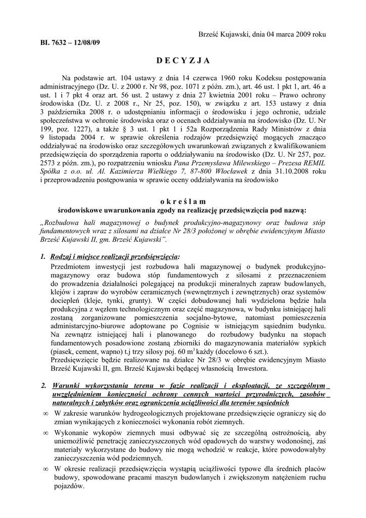 Brześć Kujawski, dnia 04 marca 2009 roku BI. 7632 – 12/08/09 DECYZJA Na podstawie art. 104 ustawy z dnia 14 czerwca 1960 roku Kodeksu postępowania administracyjnego (Dz. U. z 2000 r. Nr 98, poz. 1071 z późn. zm.), art. 46 ust. 1 pkt 1, art. 46 a ust. 1 i 7 pkt 4 oraz art. 56 ust. 2 ustawy z dnia 27 kwietnia 2001 roku – Prawo ochrony środowiska (Dz. U. z 2008 r., Nr 25, poz. 150), w związku z art. 153 ustawy z dnia 3 października 2008 r. o udostępnianiu informacji o środowisku i jego ochronie, udziale społeczeństwa w ochronie środowiska oraz o ocenach oddziaływania na środowisko (Dz. U. Nr 199, poz. 1227), a także § 3 ust. 1 pkt 1 i 52a Rozporządzenia Rady Ministrów z dnia 9 listopada 2004 r. w sprawie określenia rodzajów przedsięwzięć mogących znacząco oddziaływać na środowisko oraz szczegółowych uwarunkowań związanych z kwalifikowaniem przedsięwzięcia do sporządzenia raportu o oddziaływaniu na środowisko (Dz. U. Nr 257, poz. 2573 z późn. zm.), po rozpatrzeniu wniosku Pana Przemysława Milewskiego – Prezesa REMIL Spółka z o.o. ul. Al. Kazimierza Wielkiego 7, 87-800 Włocławek z dnia 31.10.2008 roku i przeprowadzeniu postępowania w sprawie oceny oddziaływania na środowisko określam środowiskowe uwarunkowania zgody na realizację przedsięwzięcia pod nazwą: „Rozbudowa hali magazynowej o budynek produkcyjno-magazynowy oraz budowa stóp fundamentowych wraz z silosami na działce Nr 28/3 położonej w obrębie ewidencyjnym Miasto Brześć Kujawski II, gm. Brześć Kujawski”. 1. Rodzaj i miejsce realizacji przedsięwzięcia: Przedmiotem inwestycji jest rozbudowa hali magazynowej o budynek produkcyjnomagazynowy oraz budowa stóp fundamentowych z silosami z przeznaczeniem do prowadzenia działalności polegającej na produkcji mineralnych zapraw budowlanych, klejów i zapraw do wyrobów ceramicznych (wewnętrznych i zewnętrznych) oraz systemów dociepleń (kleje, tynki, grunty). W części dobudowanej hali wydzielona będzie hala produkcyjna z węzłem technologicznym oraz część magazynowa, w budynku istniejącej hali zostaną zorganizowane pomieszczenia socjalno-bytowe, natomiast pomieszczenia administarcyjno-biurowe adoptowane po Cognisie w istniejącym sąsiednim budynku. Na zewnątrz istniejącej hali i planowanego do rozbudowy budynku na stopach fundamentowych posadowione zostaną zbiorniki do magazynowania materiałów sypkich (piasek, cement, wapno) t.j trzy silosy poj. 60 m3 każdy (docelowo 6 szt.). Przedsięwzięcie będzie realizowane na działce Nr 28/3 w obrębie ewidencyjnym Miasto Brześć Kujawski II, gm. Brześć Kujawski będącej własnością Inwestora. 2. Warunki wykorzystania terenu w fazie realizacji i eksploatacji, ze szczególnym uwzględnieniem konieczności ochrony cennych wartości przyrodniczych, zasobów naturalnych i zabytków oraz ograniczenia uciążliwości dla terenów sąsiednich • W zakresie warunków hydrogeologicznych projektowane przedsięwzięcie ograniczy się do zmian wynikających z konieczności wykonania robót ziemnych. • Wykonanie wykopów ziemnych musi odbywać się ze szczególną ostrożnością, aby uniemożliwić penetrację zanieczyszczonych wód opadowych do warstwy wodonośnej, zaś materiały wykorzystane do budowy nie mogą wchodzić w reakcje, które powodowałyby zanieczyszczenia wód podziemnych. • W okresie realizacji przedsięwzięcia wystąpią uciążliwości typowe dla średnich placów budowy, spowodowane pracami maszyn budowlanych i zwiększonym natężeniem ruchu pojazdów. • • • • • Organizować prace w sposób ograniczający emisję hałasu (przeanalizować np. lokalizację maszyn i urządzeń) Sprzęt używany przy robotach winien być sprawny tzn. bez jakichkolwiek wycieków paliwa, olejów i innych niebezpiecznych płynów eksploatacyjnych. Wyodrębnić miejsca tymczasowego magazynowania odpadów powstających w wyniku prowadzonej działalności i sukcesywnie usuwać je z terenu zakładu. Odpady gromadzić w miejscu i w pojemnikach odpowiednio zabezpieczonych, w sposób nie zagrażający środowisku. Uwzględnić zieleń ochronną w planie zagospodarowania terenu planowanego przedsięwzięcia. 3. Wymagania dotyczące ochrony środowiska konieczne do uwzględnienia w projekcie budowlanym • Planowane zamierzenie inwestycyjne należy zaprojektować w sposób określony przepisami prawa oraz zgodnie z zasadami wiedzy technicznej, zapewniając poszanowanie występujących w zasięgu oddziaływania inwestycji uzasadnionych interesów osób trzecich. • Uciążliwość przedsięwzięcia winna zamknąć się w granicach terenu, do którego inwestor ma tytuł prawny. • Projekt budowlany musi zapewniać ochronę wód podziemnych poprzez wykonanie szczelnego podłoża oraz szczelnej instalacji kanalizacyjnej. • Przyłącza kanalizacji winny być szczelne, uniemożliwiające przedostawanie się zanieczyszczeń do gruntu i wód podziemnych. • Ścieki bytowe będą odprowadzane do istniejącej miejskiej sieci kanalizacyjnej. • W zakładzie nie będą powstawały ścieki przemysłowe (technologiczne i porządkowe). • Źródłami zorganizowanej emisji zanieczyszczeń do powietrza na terenie zakładu w Brześciu Kujawskim będą wyłącznie: źródła ciepła spalające paliwo gazowe oraz procesy napełniania silosów materiałami sypkimi. • Instalacja będzie wyposażona w centralne odpylacze pakowaczki (system odpylania pulsacyjnego) oraz indywidualne odpylacze silosów. • Zakład będzie pracował tylko w porze dziennej. • Przed uruchomieniem instalacji, należy uzyskać wymagane prawem ochrony środowiska decyzje administracyjne (pozwolenia, zezwolenia). 4. Wymogi w zakresie przeciwdziałania skutkom awarii przemysłowych, w odniesieniu do przedsięwzięć zaliczanych do zakładów stwarzających zagrożenie wystąpienia poważnych awarii • nie formułuje się, należy stosować się do wymagań jednostek organizacyjnych upoważnionych 