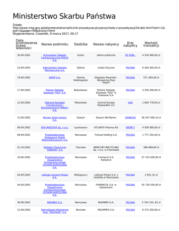 Ministerstwo Skarbu Państwa Źródło: http://www.msp.gov.pl/pl/przeksztalcenia/licznik-prywatyzacyjny/przychody-z-prywatyzacj/34,dok.html?sort=1& pid=2&page=59&drukuj=html Wygenerowano: Czwartek, 9 marca 2017, 00:17 Data przeniesienia prawa własności Nazwa podmiotu Wyszukiwanie spółekSiedziba (2403)Nazwa nabywcy 30.09.2002 Kutnowskie Zakłady Farmaceutyczne POLFA S.A. Kutno oferta publiczna Kraj nabywcy Wartość transakcji OF.PUBL. 4 334 460,00 zł Baza transakcjiZabrzańskie zbycia udziałów/akcji zawiera przekształceń własnościowych 23.09.2002 Zakłady Zabrzezestawienie osoba fizyczna POLSKA 6w260 405,00 zł spółkach SkarbuMechaniczne Państwa realizowanych w Ministerstwie Skarbu Państwa (wcześniej Ministerstwie S.A. Przekształceń Własnościowych) od roku 1990, w celu zapewnienia transparentności i jawności działań Ministra Skarbu Państwa w zakresie przekształceń własnościowych. 19.09.2002 DROP S.A. Ostrów Zbigniew Plewiński - POLSKA 571 465,00 zł 17.09.2002 Polskie Zakłady Bolesławiec Polskie Zakłady POLSKA 3 326 290,00 zł Wytwórnia Pasz W ramach zestawienia można uzyskaćWielkopolski informacje o spółkach, w których MSP zrealizował procesy "PIAST" przekształceń własnościowych (zbycie akcji/udziałów SP, umorzenie akcji/udziałów SP, komunalizacja, wniesienie na podwyższenie kapitału). Zbożowe "PZZ" S.A. Zbożowe "PZZ" w Zestawienie można sortować według danych zawartych w poszczególnych kolumnach. Krakowie S.A. Baza transakcji jest aktualizowana raz w miesiącu. Ostatnia aktualizacja: 30.11.2016 r. 12.09.2002 Fabryka Narzędzi Cirurgicznych i Dentystycznych "Mifam" S.A. Milanówek Central Europe Disposable LLC USA 1 604 776,00 zł 12.09.2002 Rexam Szkło Gostyń S.A. Gostyń Rexam AB Malmo SZWECJA 39 247 595,10 zł 09.09.2002 BYK-MAZOVIA Sp. z o.o. Łyszkowice ATLANTA Pharma AG NIEMCY 4 509 900,00 zł 09.09.2002 Przedsiębiorstwo Kolejowych Robót Elektryfikacyjnych S.A. Warszawa Forbud Holding S.A. POLSKA 1 777 255,00 zł 31.10.2002 Zakłady Chemiczne 'HAJDUKI" S.A. Chorzów MERCURY-RECYCLING Sp. z o.o. w Chorzowie POLSKA 266 989,00 zł 10.06.2002 Przedsiębiorstwo Zaopatrzenia Farmaceutycznego CEFARM-WARSZAWA S.A. Warszawa Farmacol S.A. Katowice POLSKA 37 153 500,00 zł 04.09.2002 Lafarge Cement Polska S.A. Małogoszcz Lafarge Polska S.A. z siedzibą w Warszawie POLSKA 2 921,10 zł 04.09.2002 Przedsiębiorstwo Zaopatrzenia Farmaceutycznego CEFARM-WARSZAWA S.A. Warszawa FARMACOL S.A. w Katowicach POLSKA 55 730 250,00 zł 30.08.2002 DROMEX S.A. Warszawa BUDIMEX S.A. POLSKA 3 742 232, 81 zł 12.08.2002 Dolnośląskie Wytwórnie Pasz "DOLPASZ" S.A. Wrocław ROLIMPEX S.A. POLSKA 6 372 250,00 zł 01.08.2002 Zakłady Przemysłu Owocowo-Warzywnego Dwikozy S.A. Dwikozy JAB-POL Sp. z o.o. POLSKA 283 810,32 zł 12.08.2002 Huta Szkła Wyszków S.A. Wyszków Polglass Polska S.A. POLSKA 170 690,00 zł 13.08.2002 Huta Oława S.A. Oława Zakłady Chemiczne i Tworzyw Sztucznych "BORYSZEW" S.A. POLSKA 1 315 931,58 zł 07.08.2002 Zakłady Przetwórcze Surowców Chemicznych i Mineralnych Piotrowice Sp. z o.o. Zawichost osoby fizyczne POLSKA 651 035,00 zł 01.08.2002 Elektrociepłownia "Toruń" S.A. Toruń Elektrociepłownie Wybrzeże S.A. POLSKA 43 560 000,00 zł 01.08.2002 Elektrociepłownia "Energotor-Toruń" S.A. Toruń Elektrociepłownie Wybrzeże S.A. POLSKA 3 168 000,00 zł 29.07.2002 Zakłady Zbożowo-Młynarskie PZZ w Chojnicach Sp. z o.o. Chojnice osoby fizyczne POLSKA 21 476,00 zł 15.07.2002 Fabryka Nici ARIADNA S.A. Łódź Zakłady Przemysłu Jedwabniczego "Wistil" S.A. POLSKA 1 547 408,00 zł 16.07.2002 POLAR S.A. Wrocław WHIRLPOOL EUROPE B.V. HOLANDIA 3 244 046,40 zł 08.07.2002 Rybnickie Przedsiębiorstwo Budowlano-Inżynieryjne S.A. Rybnik osoba fizyczna POLSKA 78 394,00 zł 13.06.2002 Przedsiębiorstwo Handlu Opałem i Materiałami Budowlanymi S.A. Kielce Polsko-Kanadyjskie Przedsiebiorstwo Produkcyjno-Handlowe PROGRESS INTERNATIONAL Sp. z o.o. POLSKA 177 272,58 zł 28.05.2002 Grupa Inwestycyjna OPOLE S.A. (Centrala Nasienna Handel-Usługi S.A.) Opole osoba fizyczna POLSKA 123 410,00 zł 19.06.2002 Agromet" Sp. z o.o. Ostrzeszów "Agromet" Sp. z o.o. w Ostrzeszowie POLSKA 71 300,00 zł 19.06.2002 Gdańskie Zakłady Teleelektroniczne "TELKOM-TELMOR" Sp. z o.o. Gdańsk "TELKOM-TELMOR" Sp. z o.o. w Gdańsku POLSKA 700,00 zł 11.06.2002 Rawskie Zakłady Mięsne "RAWA" S.A. Rawa Mazowiecka osoba fizyczna POLSKA 346 938,00 zł 14.06.2002 Zakłady Przemysłu Spożywczego OSTROWIN Sp. z o.o. Ostrów Wlkp "Ostrowin-Centwin" Sp. z o.o. w Ostrowie Wielkopolskim POLSKA 198 288,00 zł