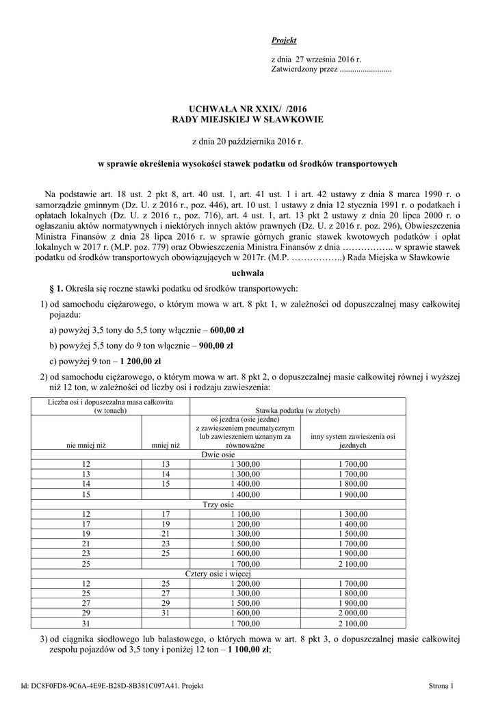 Projekt z dnia 27 września 2016 r. Zatwierdzony przez ......................... UCHWAŁA NR XXIX/ /2016 RADY MIEJSKIEJ W SŁAWKOWIE z dnia 20 października 2016 r. w sprawie określenia wysokości stawek podatku od środków transportowych Na podstawie art. 18 ust. 2 pkt 8, art. 40 ust. 1, art. 41 ust. 1 i art. 42 ustawy z dnia 8 marca 1990 r. o samorządzie gminnym (Dz. U. z 2016 r., poz. 446), art. 10 ust. 1 ustawy z dnia 12 stycznia 1991 r. o podatkach i opłatach lokalnych (Dz. U. z 2016 r., poz. 716), art. 4 ust. 1, art. 13 pkt 2 ustawy z dnia 20 lipca 2000 r. o ogłaszaniu aktów normatywnych i niektórych innych aktów prawnych (Dz. U. z 2016 r. poz. 296), Obwieszczenia Ministra Finansów z dnia 28 lipca 2016 r. w sprawie górnych granic stawek kwotowych podatków i opłat lokalnych w 2017 r. (M.P. poz. 779) oraz Obwieszczenia Ministra Finansów z dnia …………….. w sprawie stawek podatku od środków transportowych obowiązujących w 2017r. (M.P. ……………..) Rada Miejska w Sławkowie uchwala § 1. Określa się roczne stawki podatku od środków transportowych: 1) od samochodu ciężarowego, o którym mowa w art. 8 pkt 1, w zależności od dopuszczalnej masy całkowitej pojazdu: a) powyżej 3,5 tony do 5,5 tony włącznie – 600,00 zł b) powyżej 5,5 tony do 9 ton włącznie – 900,00 zł c) powyżej 9 ton – 1 200,00 zł 2) od samochodu ciężarowego, o którym mowa w art. 8 pkt 2, o dopuszczalnej masie całkowitej równej i wyższej niż 12 ton, w zależności od liczby osi i rodzaju zawieszenia: Liczba osi i dopuszczalna masa całkowita (w tonach) nie mniej niż mniej niż 12 13 14 15 13 14 15 12 17 19 21 23 25 17 19 21 23 25 12 25 27 29 31 25 27 29 31 Stawka podatku (w złotych) oś jezdna (osie jezdne) z zawieszeniem pneumatycznym lub zawieszeniem uznanym za inny system zawieszenia osi równoważne jezdnych Dwie osie 1 300,00 1 300,00 1 400,00 1 400,00 Trzy osie 1 100,00 1 200,00 1 300,00 1 500,00 1 600,00 1 700,00 Cztery osie i więcej 1 200,00 1 300,00 1 500,00 1 600,00 1 700,00 1 700,00 1 700,00 1 800,00 1 900,00 1 300,00 1 400,00 1 500,00 1 700,00 1 900,00 2 100,00 1 700,00 1 800,00 1 900,00 2 000,00 2 100,00 3) od ciągnika siodłowego lub balastowego, o których mowa w art. 8 pkt 3, o dopuszczalnej masie całkowitej zespołu pojazdów od 3,5 tony i poniżej 12 ton – 1 100,00 zł; Id: DC8F0FD8-9C6A-4E9E-B28D-8B381C097A41. Projekt Strona 1 4) od ciągnika siodłowego lub balastowego, o których mowa w art. 8 pkt 4, o dopuszczalnej masie całkowitej zespołu pojazdów równej lub wyższej niż 12 ton, w zależności od liczby osi, dopuszczalnej masy całkowitej zespołu pojazdów i rodzaju zawieszenia: Liczba osi i dopuszczalna masa całkowita zespołu pojazdów: ciągnik siodłowy + naczepa; ciągnik balastowy + przyczepa (w tonach) nie mniej niż mniej niż 12 18 25 31 18 25 31 12 40 40 Stawka podatku (w złotych) oś jezdna (osie jezdne) z zawieszeniem pneumatycznym lub zawieszeniem uznanym za inne systemy zawieszenia osi równoważne jezdnych Dwie osie 1 100,00 1 200,00 1 500,00 1 700,00 Trzy osie i więcej 1 500,00 2 000,00 1 500,00 1 600,00 2 000,00 2 200,00 2 100,00 2 600,00 5) od przyczepy lub naczepy, o których mowa w art. 8 pkt 5, które łącznie z pojazdem silnikowym posiadają dopuszczalną masę całkowitą od 7 ton i poniżej 12 ton, z wyjątkiem związanych wyłącznie z działalnością rolniczą prowadzoną przez podatnika podatku rolnego – 500,00 zł; 6) od przyczepy lub naczepy, o których mowa w art. 8 pkt 6, które łącznie z pojazdem silnikowym posiadają dopuszczalną masę całkowitą równą lub wyższą niż 12 ton, w zależności od liczby osi, dopuszczalnej masy całkowitej i rodzaju zawieszenia, z wyjątkiem związanych wyłącznie z działalnością rolniczą prowadzoną przez podatnika podatku rolnego: Liczba osi i dopuszczalna masa całkowita zespołu pojazdów: naczepa/przyczepa + pojazd silnikowy (w tonach) nie mniej niż mniej niż 12 18 25 18 25 12 28 33 38 28 33 38 12 38 38 Stawka podatku (w złotych) oś jezdna (osie jezdne) z zawieszeniem pneumatycznym lub zawieszeniem uznanym za inne systemy zawieszenia osi równoważne jezdnych Jedna oś 500,00 600,00 600,00 Dwie osie 600,00 900,00 1 000,00 1 300,00 Trzy osie i więcej 1 000,00 1 600,00 700,00 800,00 800,00 800,00 1 100,00 1 300,00 1 700,00 1 300,00 1 800,00 7) od autobusu, w zależności od liczby miejsc do siedzenia poza miejscem kierowcy: a) mniejszej niż 22 miejsca – 700,00 zł b) równej lub większej niż 22 miejsca – 1 500,00 zł § 2. Wykonanie uchwały powierza się Burmistrzowi Miasta Sławkowa. § 3. Uchyla się uchwałę Nr XV/96/2015 Rady Miejskiej w Sławkowie z dnia 22 października 2015 r. w sprawie określenia wysokosci stawek podatku od środków transportowych. § 4. Uchwała podlega ogłoszeniu w Dzienniku Urzędowym Województwa Śląskiego. Id: DC8F0FD8-9C6A-4E9E-B28D-8B381C097A41. Projekt Strona 2 § 5. Uchwała wchodzi w życie z dniem 1 stycznia 2017 roku. Przewodniczący Rady Miejskiej mgr Marta Rus Id: DC8F0FD8-9C6A-4E9E-B28D-8B381C097A41. Projekt Strona 3 UZASADNIENIE Art. 10 ustawy z dnia 12 stycznia 1991 r. o podatkach i opłatach lokalnych (Dz.U. z 2016 r. poz. 716) upoważnia i jednocześnie zobowiązuje rady gmin do ustalenia rocznych stawek podatku od środków transportowych. Upoważnienie znajdujące się w art. 10 powołanej ustawy wyznacza stawki maksymalne podatku uwzględniając kryteria takie jak: rodzaj środka transportowego, masa całkowita pojazdu, liczba osi, rodzaj zawieszenia czy liczba miejsc do siedzenia. Górne granice stawek podatków i opłat lokalnych ulegają corocznie zmianie na następny rok podatkowy i zostały ogłoszone w Obwieszczeniu Ministra Finansów z dnia 28 lipca 2016r. (M.P. poz. 779). W celu utrzymania korzystnych warunków do prowadzenia działalności gospodarczej w zakresie transportu drogowego stawki podatkowe na rok 2017 utrzymano na poziomie niższym od stawek maksymalnych oraz 