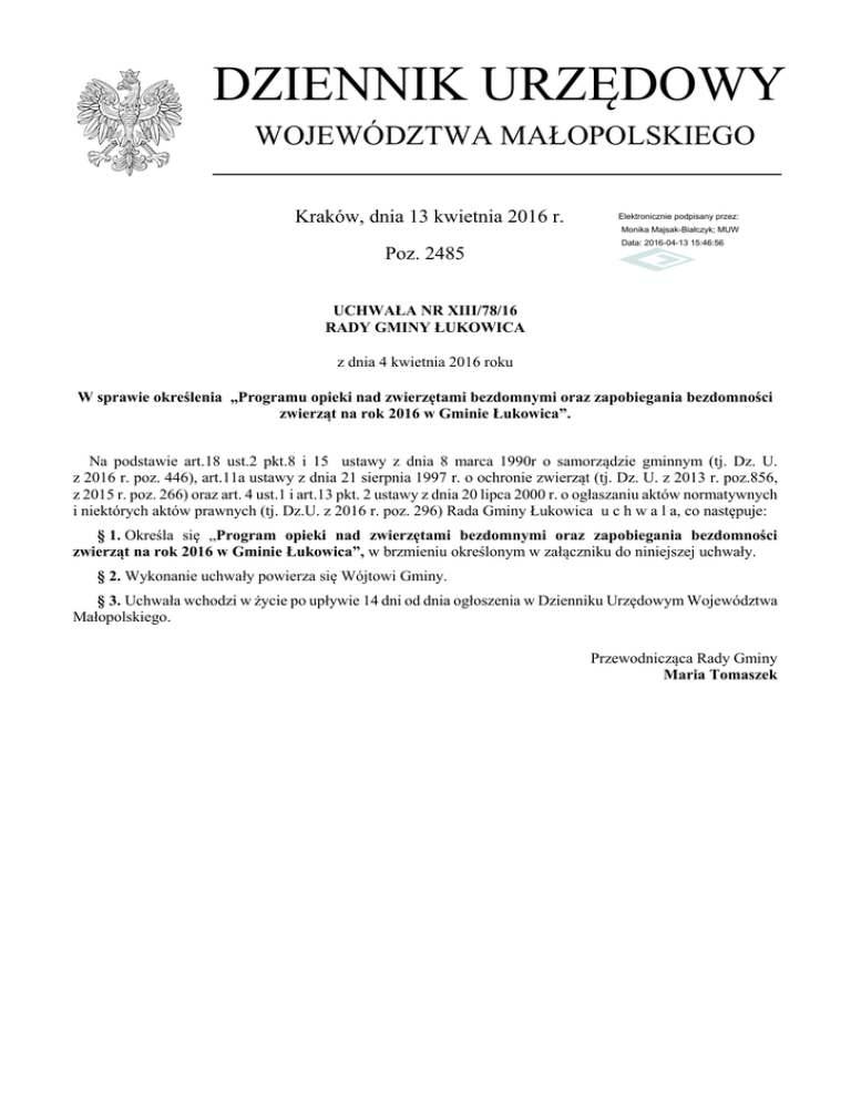 DZIENNIK URZĘDOWY WOJEWÓDZTWA MAŁOPOLSKIEGO Kraków, dnia 13 kwietnia 2016 r. Elektronicznie podpisany przez: Monika Majsak-Białczyk; MUW Poz. 2485 Data: 2016-04-13 15:46:56 UCHWAŁA NR XIII/78/16 RADY GMINY ŁUKOWICA z dnia 4 kwietnia 2016 roku W sprawie określenia „Programu opieki nad zwierzętami bezdomnymi oraz zapobiegania bezdomności zwierząt na rok 2016 w Gminie Łukowica”. Na podstawie art.18 ust.2 pkt.8 i 15 ustawy z dnia 8 marca 1990r o samorządzie gminnym (tj. Dz. U. z 2016 r. poz. 446), art.11a ustawy z dnia 21 sierpnia 1997 r. o ochronie zwierząt (tj. Dz. U. z 2013 r. poz.856, z 2015 r. poz. 266) oraz art. 4 ust.1 i art.13 pkt. 2 ustawy z dnia 20 lipca 2000 r. o ogłaszaniu aktów normatywnych i niektórych aktów prawnych (tj. Dz.U. z 2016 r. poz. 296) Rada Gminy Łukowica u c h w a l a, co następuje: § 1. Określa się „Program opieki nad zwierzętami bezdomnymi oraz zapobiegania bezdomności zwierząt na rok 2016 w Gminie Łukowica”, w brzmieniu określonym w załączniku do niniejszej uchwały. § 2. Wykonanie uchwały powierza się Wójtowi Gminy. § 3. Uchwała wchodzi w życie po upływie 14 dni od dnia ogłoszenia w Dzienniku Urzędowym Województwa Małopolskiego. Przewodnicząca Rady Gminy Maria Tomaszek Dziennik Urzędowy Województwa Małopolskiego –2– Poz. 2485 Załącznik do Uchwały Nr XIII/78/16 Rady Gminy Łukowica z dnia 4 kwietnia 2016 r. PROGRAM OPIEKI NAD ZWIERZĘTAMI BEZDOMNYMI ORAZ ZAPOBIEGANIA BEZDOMNOSCI ZWIERZĄT NA TERENIE GMINY ŁUKOWICA W 2016 r. Rozdział 1. Postanowienia ogólne § 1. 1. Program opieki nad zwierzętami bezdomnymi oraz zapobiegania bezdomności zwierząt na terenie Gminy Łukowica ma zastosowanie w stosunku do wszelkich bezdomnych zwierząt domowych i gospodarskich a w szczególności do psów i kotów przebywających w granicach administracyjnych Gminy Łukowica. 2. Celem Programu jest zapobieganie bezdomności zwierząt oraz opieka nad zwierzętami bezdomnymi. § 2. 1. Program zapobiegania bezdomności zwierząt na terenie Gminy Łukowica obejmuje: 1) odławianie bezdomnych zwierząt i umieszczanie ich w schronisku dla zwierząt, 2) opiekę nad wolno żyjącymi kotami, w tym ich dokarmianie, 3) obligatoryjna sterylizacja albo kastracja zwierząt bezdomnych z terenu Gminy Łukowica, 4) poszukiwanie właścicieli dla bezdomnych zwierząt, 5) usypianie ślepych miotów, 6) wskazanie gospodarstwa rolnego w celu zapewnienia miejsca dla zwierząt gospodarskich, 7) zapewnienie opieki weterynaryjnej w przypadkach zdarzeń drogowych z udziałem zwierząt. Rozdział 2. Odławianie bezdomnych zwierząt i umieszczanie ich w schronisku do zwierząt. § 3. Odławianie (wyławianie) bezdomnych zwierząt na terenie Gminy Łukowica będzie odbywało się z równoczesnym: 1. poszukiwaniem i ustalaniem właścicieli bezdomnych zwierząt, 2. znajdowaniem nowych właścicieli dla nowych zwierząt (adopcja) jeśli dotychczasowy właściciel jest nie do ustalenia, 3. znajdowaniem schronisk dla bezdomnych zwierząt i w oparciu o umowę przekazywanie zwierząt do schroniska, które nie zostały adoptowane. Rozdział 3. Opieka nad wolno żyjącymi kotami, w tym ich dokarmianie. § 4. 1. Opieka nad wolno żyjącymi kotami na terenie Gminy Łukowica realizowana jest w zakresie: 1) udzielania pomocy weterynaryjnej, 2) leczenie zwierząt chorych oraz potraconych w wypadkach komunikacyjnych, 3) sterylizacji, 4) usypiania ślepych miotów, 5) rejestracji karmicieli wolno żyjących kotów, 6) wydawania karmy zarejestrowanym karmicielom wolno żyjących kotów. 2. Dokarmianie wolno żyjących kotów bytujących na terenie Gminy Łukowica realizowane jest przy pomocy opiekunów społecznych, którzy zobowiążą się do opieki nad tymi zwierzętami. Dziennik Urzędowy Województwa Małopolskiego –3– Poz. 2485 3. Za opiekuna społecznego uważa się wyłącznie pełnoletniego mieszkańca Gminy Łukowica, który zobowiąże się do pełnienia opieki nad wskazanymi przez siebie wolno żyjącymi kotami, jak również utrzymania czystości i porządku w miejscu ich dokarmiania. 4. Udzielenie pomocy wolno żyjącym kotom odbywa się w miejscu ich bytowania, zaś leczenie i sterylizacja przeprowadzona jest przez lekarza weterynarii, z którym Gmina ma podpisana umowę. 5. Odławianie wolno żyjących kotów może odbywać się przy pomocy inspektorów organizacji społecznej, której statutowym celem działania jest ochrona zwierząt, jak również osób opiekujących się tymi zwierzętami na co dzień, które zobowiążą się do udzielania pomocy w ich odławianiu. 6. Po zakończeniu leczenia lub ich przeprowadzeniu sterylizacji wolno żyjące koty umieszczane są w miejscu, z którego zostały odłowione. Rozdział 4. Obligatoryjna sterylizacja albo kastracja zwierząt bezdomnych z terenu Gminy Łukowica. § 5. Obligatoryjna sterylizacja albo kastracja zwierząt bezdomnych z terenu Gminy Łukowica będzie wykonywana w ramach podpisanej umowy z lekarzem weterynarii. § 6. Określa się następujące zasady finansowania tych zabiegów: 1. Gmina Łukowica zawrze umowę z lekarzem weterynarii na dokonywanie zabiegów kastracji lub sterylizacji bezdomnych zwierząt. 2. Gmina Łukowica zapłaci lekarzowi weterynarii za czynności opisane w niniejszym rozdziale, zgodnie z warunkami określonymi w umowie. 3. Na warunkach określonych w umowie, Gmina Łukowica zapłaci 100% kosztów zabiegów lekarzowi weterynarii na podstawie wystawionego rachunku bądź faktury. Rozdział 5. Poszukiwanie właścicieli dla bezdomnych zwierząt. § 7. 1. Gmina Łukowica prowadzi poszukiwania właścicieli dla bezdomnych zwierząt gospodarskich i domowych w sposób stały, za pomocą dostępnych środków komunikacji. 2. W ramach poszukiwania właścicieli dla bezdomnych zwierząt domowych i gospodarskich Gmina współpracuje z mieszkańcami, organizacjami społecznymi działającymi na rzecz ochrony zwierząt oraz organizuje i prowadzi akcje edukacyjne. 3. W prz