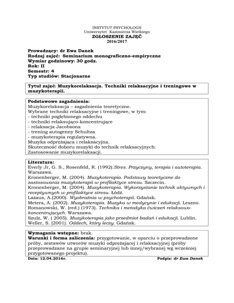 INSTYTUT PSYCHOLOGII Uniwersytet Kazimierza Wielkiego ZGŁOSZENIE ZAJĘĆ 2016/2017 Prowadzący: dr Ewa Danek Rodzaj zajęć: Seminarium monograficzno-empiryczne Wymiar godzinowy: 30 godz. Rok: II Semestr: 4 Typ studiów: Stacjonarne Tytuł zajęć: Muzykorelaksacja. Techniki relaksacyjne i treningowe w muzykoterapii. Podstawowe zagadnienia: Muzykorelaksacja – zagadnienia teoretyczne. Wybrane techniki relaksacyjne i treningowe, w tym: - techniki pogłębionego oddechu - techniki relaksująco-koncentrujące - relaksacja Jacobsona - trening autogenny Schultza - muzykoterapia regulatywna. Muzyka odprężająca i relaksacyjna. Skuteczność doboru muzyki do technik relaksacyjnych. Zastosowanie muzykorelaksacji. Literatura: Everly Jr, G. S., Rosenfeld, R. (1992).Stres. Przyczyny, terapia i autoterapia. Warszawa. Kronenberger, M. (2004). Muzykoterapia. Podstawy teoretyczne do zastosowania muzykoterapii w profilaktyce stresu. Szczecin. Kronenberger, M. (2004). Muzykoterapia. Wykorzystanie technik aktywnych i receptywnych w profilaktyce stresu. Łódź. Lazaus, A.(2000). Wyobraźnia w psychoterapii. Gdańsk. Metera, A. (2002). Muzykoterapia. Muzyka w medycynie i edukacji. Leszno. Romanowski, W. (red.) (1973). Technika i metodyka ćwiczeń relaksowokoncentrujących. Warszawa. Szulz, W. ( 2005). Muzykoterapia jako przedmiot badań i edukacji. Lublin. Weller, S. (2001). Oddech, który leczy. Gdańsk. Wymagania wstępne: brak. Warunki i forma zaliczenia: przygotowanie, w oparciu o przeprowadzone próby, zestawów utworów muzyki odprężającej i relaksacyjnej (próby przeprowadzane na grupie seminaryjnej lub innej/wybranej wg wcześniej przygotowanego projektu). Data: 12.04.2016r. Podpis: dr Ewa Danek