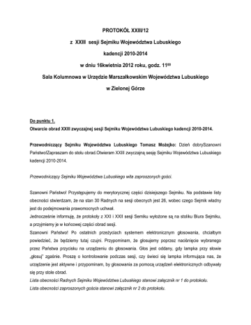 PROTOKÓŁ XXIII/12 z XXIII sesji Sejmiku Województwa Lubuskiego kadencji 2010-2014 w dniu 16kwietnia 2012 roku, godz. 1100 Sala Kolumnowa w Urzędzie Marszałkowskim Województwa Lubuskiego w Zielonej Górze Do punktu 1. Otwarcie obrad XXIII zwyczajnej sesji Sejmiku Województwa Lubuskiego kadencji 2010-2014. Przewodniczący Sejmiku Województwa Lubuskiego Tomasz Możejko: Dzień dobrySzanowni Państwo!Zapraszam do stołu obrad.Otwieram XXIII zwyczajną sesję Sejmiku Województwa Lubuskiego kadencji 2010-2014. Przewodniczący Sejmiku Województwa Lubuskiego wita zaproszonych gości. Szanowni Państwo! Przystępujemy do merytorycznej części dzisiejszego Sejmiku. Na podstawie listy obecności stwierdzam, że na stan 30 Radnych na sesji obecnych jest 26, wobec czego Sejmik władny jest do podejmowania prawomocnych uchwał. Jednocześnie informuję, że protokoły z XXI i XXII sesji Semiku wyłożone są na stoliku Biura Sejmiku, a przyjmiemy je w końcowej części obrad sesji. Szanowni Państwo! Po ostatnich przeżyciach systemem elektronicznym głosowania, chciałbym powiedzieć, że będziemy tutaj czujni. Przypominam, że głosujemy poprzez naciśnięcie wybranego przez Państwa przycisku na urządzeniu do głosowania. Głos jest oddany, gdy lampka przy słowie „głosuj” zgaśnie. Proszę o kontrolowanie podczas sesji, czy świeci się lampka informująca nas, że urządzenie jest aktywne i przypominam, by głosowania za pomocą urządzeń elektronicznych odbywały się przy stole obrad. Lista obecności Radnych Sejmiku Województwa Lubuskiego stanowi załącznik nr 1 do protokołu. Lista obecności zaproszonych gościa stanowi załącznik nr 2 do protokołu. Do punktu 2. Przystępujemy do uchwalenia porządku obrad XXIII sesji Sejmiku Województwa Lubuskiego. Przewodniczący Sejmiku Województwa Lubuskiego Tomasz Możejko: Przystępujemy do uchwalenia porządku obrad XXIII sesji Sejmiku Województwa Lubuskiego. Panie i Panowie Radni, projekt porządku obrad otrzymaliście Państwo wraz z zaproszeniem na sesję. Proponuję na wniosek Zarządu Województwa Lubuskiego, rozszerzenie porządku obrad o: - punkt 6a – Sprawozdanie z realizacji Lubuskiej Regionalnej Strategii Innowacji 2010-2015 za okres od 01.01.2011 r. do 31.12.2011 r. - punkt 6b – Informacja nt. Założeń Strategii Polski Zachodniej 2020. - punkt 21a – Podjęcie uchwały w sprawie wyrażenia zgody na przekazanie nieruchomości w formie darowizny na rzecz Miasta Gorzowa Wielkopolskiego – druk nr 215. Przy tej uchwale chcę przypomnieć, że będzie autopoprawka w § 3. - punkt 21b – Podjęcie uchwały w sprawie wyrażenia opinii o pozbawieniu niektórych odcinków dróg kategorii dróg krajowych – druk nr 216. - punkt 21c – Podjęcie uchwały w sprawie wyboru przedstawicieli do składu Rady Społecznej Wojewódzkiego Ośrodka Medycyny Pracy w Gorzowie Wielkopolskim – druk nr 218. - punkt 21d – Podjęcie uchwały w sprawie wyboru przedstawicieli do składu Rady Społecznej Samodzielnego Publicznego Zakładu Opieki Zdrowotnej Centrum Leczenia Dzieci i Młodzieży w Zaborze – druk nr 221. - punkt 21e – Podjęcie uchwały w sprawie wyboru przedstawicieli do składu Rady Społecznej Ośrodka dla Osób Uzależnionych Samodzielnego Publicznego Zakładu Opieki Zdrowotnej „Nowy Dworek” – druk nr 220. - punkt 21f – Podjęcie uchwały w sprawie wyboru przedstawicieli do składu Rady Społecznej Samodzielnej Publicznej Wojewódzkiej Stacji Pogotowia Ratunkowego w Gorzowie Wielkopolskim – druk nr 219. - punkt 23a – Podjęcie uchwały w sprawie zaciągnięcia kredytu długoterminowego – druk nr 217. - punkt 24a – Podjęcie uchwały w sprawie nadania „Odznaki Honorowej za Zasługi dla Województwa Lubuskiego” – druk nr 222. - punkt 26b – Przyjęcie protokołu z XXII sesji Sejmiku Województwa Lubuskiego. Projekty uchwał oraz pozostałe materiały dostępne są na stronie internetowej www.sejmik.lubuskie.pl Ponadto informuję, że na stronie internetowej www.sejmik.lubuskie.pl dostępna jest 3 wersja uchwał w sprawie: - dokonania zmian uchwały budżetowej Województwa Lubuskiego na 2012 – druk nr 213, - dokonania zmian Wieloletniej Prognozy Finansowej Województwa Lubuskiego na lata 2012-2024 – druk nr 214, oraz 2 wersja: - informacji o sytuacji finansowej jednostek ochrony zdrowia za okres 01.01.2012-31.01.2012, - sprawozdania rocznego z wykonania planu finansowego na 2011 rok Lubuskiego Szpitala Specjalistycznego Pulmonologiczno-Kardiologicznego Sp. z o.o. w Torzymiu. Czy są pytania, wątpliwości do przedstawionego porządku obrad? Nie widzę, wobec tego przystępujemy do głosowania. Jesteśmy gotowi. Wszystkie te uchwały musimy po kolei przegłosować. Proszę, żeby Radni zajęli swoje miejsce przy stołach. Poddaję pod głosowanie rozszerzenie porządku obrad dzisiejszej sesji o punkt 6a – Sprawozdanie z realizacji Lubuskiej Regionalnej Strategii Innowacji 2010-2015 za okres od 01.01.2011 r. do 31.12.2011 r. Kto z Państwa Radnych jest za, proszę podnieść rękę i nacisnąć przycisk zielony. Kto jest przeciw, proszę podnieść rękę i nacisnąć przycisk czerwony. Kto się wstrzymał, proszę podnieść rękę i nacisnąć przycisk niebieski. Za 22, wstrzymało się 0, przeciw 0. Przeliczę tylko optycznie, czy taka liczba Radnych jest tutaj. Niektórzy nie głosowali. Stwierdzam, że w wyniku głosowania porządek obrad dzisiejszej sesji został rozszerzony o punkt 6a. Poddaję pod głosowanie rozszerzenie porządku obrad dzisiejszej sesji o punkt 6b – Informacja nt. Założeń Strategii Polski Zachodniej 2020. Kto z Państwa Radnych jest za, proszę podnieść rękę i nacisnąć przycisk zielony. Kto jest przeciw, proszę podnieść rękę i nacisnąć przycisk czerwony. Kto się wstrzymał, proszę podnieść rękę i nacisnąć przycisk niebieski. Za 22, wstrzymało się 0, przeciw 1. Szanowni Państwo! Stwierdzam, że w wyniku głosowania porządek obrad