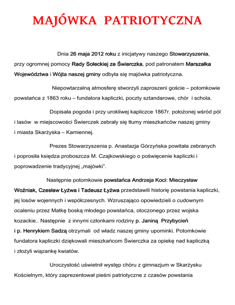MAJÓWKA PATRIOTYCZNA Dnia 26 maja 2012 roku z inicjatywy naszego Stowarzyszenia, Stowarzyszenia przy ogromnej pomocy Rady Sołeckiej ze Świerczka, Świerczka pod patronatem Marszałka Województwa i Wójta naszej gminy odbyła się majówka patriotyczna. Niepowtarzalną atmosferę stworzyli zaproszeni goście – potomkowie powstańca z 1863 roku – fundatora kapliczki, poczty sztandarowe, chór i schola. Dopisała pogoda i przy urokliwej kapliczce 1867r. położonej wśród pól i lasów w miejscowości Świerczek zebrały się tłumy mieszkańców naszej gminy i miasta Skarżyska – Kamiennej. Prezes Stowarzyszenia p. Anastazja Górzyńska powitała zebranych i poprosiła księdza proboszcza M. Czajkowskiego o poświęcenie kapliczki i poprowadzenie tradycyjnej „majówki”. Następnie potomkowie powstańca Andrzeja Koci: Mieczysław Woźniak, Czesław Łyżwa i Tadeusz Łyżwa przedstawili historię powstania kapliczki, jej losów wojennych i współczesnych. Wzruszająco opowiedzieli o cudownym ocaleniu przez Matkę boską młodego powstańca, otoczonego przez wojska kozackie.. Następnie z innymi członkami rodziny p. Janiną Przybycień i p. Henrykiem Sadzą otrzymali od władz naszej gminy upominki. Potomkowie fundatora kapliczki dziękowali mieszkańcom Świerczka za opiekę nad kapliczką i złożyli wiązankę kwiatów. Uroczystość uświetnił występ chóru z gimnazjum w Skarżysku Kościelnym, który zaprezentował pieśni patriotyczne z czasów powstania styczniowego, a młodzi recytatorzy wykonali m.in.. „Redutę Ordona”, „Gawędę o miłości ziemi ojczystej”, „Żołnierza polskiego”, „Skarby Polski”. Po części oficjalnej – wszyscy zebrani wzięli udział w biesiadzie przy ognisku. Przy akompaniamencie gitary śpiewano pieśni patriotyczne, snuto wspomnienia, degustowano grochówkę „powstańczą” i kiełbaski pieczone przy ognisku. Uczestnicy majówki byli zachwyceni imprezą, która na wiele dni pozostanie w ich pamięci.