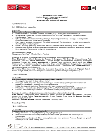 X Konferencja Nafta/Chemia Synteza dekady i scenariusze przyszłości 10 grudnia 2014 r., Warszawa, hotel Sheraton, ul. B.Prusa 2 Agenda konferencji: 8.30-9.00 Rejestracja uczestników 9.00-11.00 Polska nafta – dokonania i dylematy • Bilans i skala zmian w minionej dekadzie. Restrukturyzacja i inwestycje w sektorze naftowym • Wpływ polityki klimatycznej UE i innych regulacji unijnych na kształt i perspektywy sektora naftowego i chemicznego w Polsce • Sytuacja makroekonomiczna na rynku paliwowym. Najważniejsze tendencje i ich wpływ na efektywność działalności rafineryjnej. Spadki marży rafineryjnej. • Plany rozwoju w segmencie upstream. Gdzie i jak inwestować? Bezpieczeństwo i wysokie koszty czy mniej stabilności przy wyższym zysku? • Rynek – problemy dystrybucji. Szara strefa w handlu paliwami – skutki dla branży, środki zaradcze. • Logistyka ma znaczenie. Wpływ budowy terminalu naftowego w Gdańsku na strukturę dostaw ropy naftowej • Nowe wyzwania? Petrochemia, czyli profity ze współpracy Wystąpienie inauguracyjne: Włodzimierz Karpiński* – Minister Skarbu Państwa Dyskusja, do udziału w której zostali zaproszeni (wykaz osób w kolejności alfabetycznej): Piotr Chełmiński – Członek Zarządu ds. Rozwoju i Energetyki, PKN Orlen SA, Przewodniczący Rady Nadzorczej, Anwil SA; Marcin Moskalewicz – Prezes Zarządu, Przedsiębiorstwo Eksploatacji Rurociągów Naftowych Przyjaźń SA; Marek Mroczkowski – Członek Rady Nadzorczej, Grupa Azoty SA; Paweł Olechnowicz – Prezes Zarządu, Dyrektor Generalny, Grupa Lotos SA; Zbigniew Skrzypkiewicz – Wiceprezes Zarządu ds. Poszukiwań i Wydobycia, Polskie Górnictwo Naftowe i Gazownictwo SA; Janusz Wiśniewski – Wiceprezes, Krajowa Izba Gospodarcza Moderatorzy: Piotr Apanowicz – Publicysta, Miesięcznik Gospodarczy Nowy Przemysł; Wojciech Kuśpik – Prezes Zarządu PTWP, Wydawca Miesięcznika Gospodarczego Nowy Przemysł oraz portalu wnp.pl 11.00-11.30 Przerwa 11.30-12.45 Branża chemiczna w Polsce. Próba podsumowania. Wizje rozwoju • Chemia po konsolidacji. Co dalej z Grupą Azoty? • Inwestycje, rozwój, ekspansja. Czynniki wyznaczające kierunki rozwoju polskiej chemii. Surowce i ich dostępność, technologie i produkty, rynki zbytu i konkurencja • Polska chemia wciąż atrakcyjna? Zainteresowanie i plany zagranicznych inwestorów • Petrochemia – nowe otwarcie. Chemiczne plany Orlenu. W jakich obszarach możliwe współdziałanie? • Kompleks petrochemiczny w Gdańsku – znaczenie dla branży, potencjalne źródła finansowania Dyskusja, do udziału w której zostali zaproszeni (wykaz osób w kolejności alfabetycznej): Rafał Baniak* – Podsekretarz Stanu, Ministerstwo Skarbu Państwa RP; Robert Gwiazdowski – Prezydent, Centrum im. Adama Smitha; Paweł Jarczewski – Prezes Zarządu, Grupa Azoty SA; Dariusz Krawczyk – Prezes Zarządu, Ciech SA Moderator: Jarosław Dmowski – Partner, The Boston Consulting Group Prezentacje: BCG 12.45-13.15 Przerwa 13.15-14.45 Produkty, koszty, marże. Na co stawia chemia? • Potęga nawozowa i co dalej? Specjalizacja jedyną drogą rozwoju? • Wydłużanie łańcuchów produktowych jako sposób na poprawę zyskowności firm. Inwestycje i ich finansowanie • W poszukiwaniu wyższej marży. Nowe produkty i atrakcyjne nisze rynkowe w Polsce, w Europie i na rynkach światowych. RSM. Środki ochrony roślin. • • • • Efektywność produkcyjna i sprzedażowa. Współpraca z odbiorcami, nowa polityka sprzedaży, komplementarność oferty Konsolidacja światowego biznesu nawozowego (fuzja Yary i CF), a nasze szanse eksportowe Czynniki zewnętrzne wpływające na efektywność produkcji chemicznej – konsekwencje wejścia w życie umowy TTIP, trendy na rynku gazu, dostęp do surowców Rola aktywności badawczo-rozwojowej. B&R – potencjalny obszar współdziałania branży chemicznej i petrochemicznej Dyskusja, do udziału w której zostali zaproszeni (wykaz osób w kolejności alfabetycznej): Robert Jaworski – Członek Zarządu, Przedsiębiorstwo Spedycyjne Trade Trans Sp. z o.o.; Adam Leszkiewicz – Prezes Zarządu, Grupa Azoty Zakłady Azotowe Kędzierzyn SA; Jerzy Majchrzak – Dyrektor, Departament Innowacji i Przemysłu, Ministerstwo Gospodarki RP; Cezary Możeński – Dyrektor, Instytut Nawozów Sztucznych; Jacek Podgórski – Prezes Zarządu, Anwil SA; Zenon Pokojski – Wiceprezes Zarządu, Grupa Azoty Zakłady Azotowe Puławy SA; Robert Stankiewicz – Prezes Zarządu, Dow Polska; Witold Szczypiński – Wiceprezes Zarządu, Grupa Azoty SA; Tomasz Zieliński – Prezes Zarządu, Polska Izba Przemysłu Chemicznego Prezentacja: Optymalizacja procesów technologicznych w oparciu o dedykowane rozwiązania Autodesk dla branż Nafta / Chemia. Sławomir Gabryjeluk – Territory Sales Manager Poland – Plant & Utility Solutions, Autodesk Polska 14.45-15.00 Przerwa 15.00-16.00 Chemia i petrochemia – droga do niezależności • Niestabilna sytuacja międzynarodowa a dostępność surowców. Jak przygotować się na ewentualne problemy z dostawami? • Jak firmy chemiczne i rafinerie w Polsce są przygotowane do działania w sytuacji ograniczeń czy nierytmiczności dostaw? Wykorzystanie doświadczeń z sytuacji kryzysowych • Możliwe działania zmniejszające ryzyko (własne złoża zagraniczne, udziały w gazociągach i współpraca z dostawcą, budowa własnej infrastruktury, wzajemna asekuracja wewnątrz branży) Dyskusja, do udziału w której zostali zaproszeni (wykaz osób w kolejności alfabetycznej): Dirk Elvermann – Prezes, BASF Polska; Maciej Gierej – Ekspert, były Prezes Zarządu, Nafta Polska SA; Robert Gwiazdowski* – Prezydent, Centrum im. Adama Smitha; Krzysztof Jałosiński – Wiceprezes Zarządu, Grupa Azoty; Cezary Możeński – Dyrektor, Instytut Nawozów Sztucznych; Tomasz Zieliński – Prezes Zarządu, Polska Izba Przemysłu Chemicznego Moderatorzy: Piotr Apanowicz – Publicysta, Miesięc