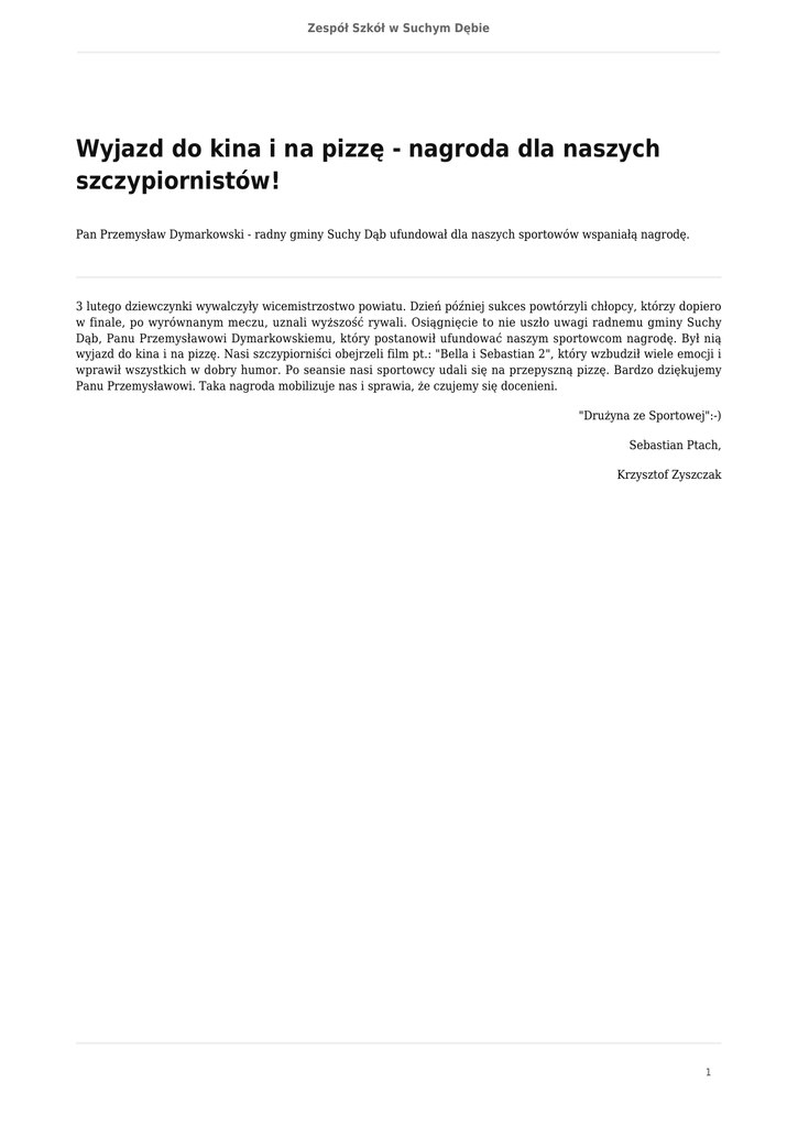 Zespół Szkół w Suchym Dębie Wyjazd do kina i na pizzę - nagroda dla naszych szczypiornistów! Pan Przemysław Dymarkowski - radny gminy Suchy Dąb ufundował dla naszych sportowów wspaniałą nagrodę. 3 lutego dziewczynki wywalczyły wicemistrzostwo powiatu. Dzień później sukces powtórzyli chłopcy, którzy dopiero w finale, po wyrównanym meczu, uznali wyższość rywali. Osiągnięcie to nie uszło uwagi radnemu gminy Suchy Dąb, Panu Przemysławowi Dymarkowskiemu, który postanowił ufundować naszym sportowcom nagrodę. Był nią wyjazd do kina i na pizzę. Nasi szczypiorniści obejrzeli film pt.: "Bella i Sebastian 2", który wzbudził wiele emocji i wprawił wszystkich w dobry humor. Po seansie nasi sportowcy udali się na przepyszną pizzę. Bardzo dziękujemy Panu Przemysławowi. Taka nagroda mobilizuje nas i sprawia, że czujemy się docenieni. "Drużyna ze Sportowej":-) Sebastian Ptach, Krzysztof Zyszczak 1