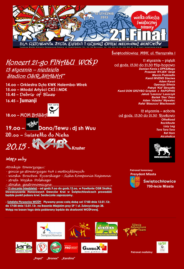 Świętochłowice MDK ul. Harcerska 1 Koncert 21-go FINAŁU WOŚP 13 stycznia – niedziela Stadion OSiR„SKAŁKA” 14.oo – Orkiestra Dęta KWK Halemba-Wirek 15.oo – Młodzi Artyści CKŚ i MDK 15.45 – Debris of Blues 16.45 – Jumanji 18.oo – MOM 19.oo – 11 stycznia – piątek od godz. 15.30 do 21.30 Hip-hopowo Damian Kania z DPK&Mago Przemek ‘RYJEK’ Strąk Marcin Podsiadło Kamil INVENS Staciwa Adam Karaś Operacja Silesia Patryk ‘Kid’ Skrzydło Kamil DON GRZYBO Grzybek z RAPOPHIS Jakub ‘Leszczu’ Laszczyk Bartek ‘Des’ Desu Adam ‘Adaśko’ Wywalec Rafał ‘Błaszczu’ Błachowski 12 stycznia – sobota od godz. 15.30 do 21.30 Rockowo BASSA OtheRoad RockRoute Lazy Leg Tora Tora Tora Ret Horn Alcoholica Dono/Tewu i dj sh Wuu 20.oo – Światełko do Nieba 20.15 - Krusher Wstęp wolny Atrakcje towarzyszące: - goście ze stowarzyszeń 4x4 i motocyklowych - wioska Bractwa Rycerskiego – Śląska Kompania Najemna - strefa Wojska Polskiego - stoiska gastronomiczne _ -- 1133 ssttyyc czznniia a ((nniieed dzziie ella a)) -- o od dg go od dzz..99..o oo od do og go od dzz..1122..o oo o,, w w PPa aw wiillo onniie eO OSSiiRR SSkka ałłkka a,, SStto ow wa arrzzyysszze enniie e H Ho onno orro ow wyyc chh D Da aw wc có ów w KKrrw wii w w ŚŚw wiię ętto oc chhłło ow wiic ca ac chh p prro ow wa ad dzziić ć b bę ęd dzziie ep puunnkktt p po ob bo orruu kkrrw wii.. SSe errd de ec czznniie e zza ap prra asszza am myy.. Patronat honorowy: Prezydent Miasta 700-lecie Miasta -- SSzztta affe etta a PPłłyyw wa ac ckka aW WO OŚŚPP!! PPłłyyw wa am myy p prrzze ezz c ca ałłą ąd do ob bę ęo od d 1177::0000 d dnniia a 1122..0011..1133rr.. d do o 1177::0000 d dnniia a 1133..0011..1133rr.. nna a BBa asse enniie eM Miie ejjsskkiim mp prrzzyy SSPP 11 uull.. ZZuub brrzzyyc ckkiie eg go o 3388.. W Wssttę ęp p nna ab ba asse enn tte eg go od dnniia ap po ob biie erra annyy b bę ęd dzziie ed do o sskka arrb bo onnkkii W WO OŚŚPPo ow we ejj.. Patronat medialny: „Pepsi” „Bronex” „Karolina”