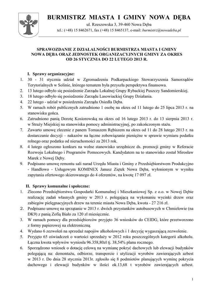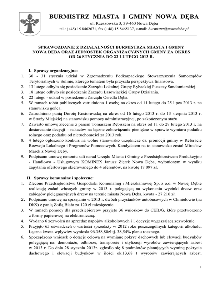 BURMISTRZ MIASTA I GMINY NOWA DĘBA ul. Rzeszowska 3, 39-460 Nowa Dęba tel.: (+48) 15 8462671, fax (+48) 15 8465137, e-mail: [email protected] SPRAWOZDANIE Z DZIAŁALNOŚCI BURMISTRZA MIASTA I GMINY NOWA DĘBA ORAZ JEDNOSTEK ORGANIZACYJNYCH GMINY ZA OKRES OD 26 STYCZNIA DO 22 LUTEGO 2013 R. 1. 2. 3. 4. 5. 6. 7. 8. 9. 1. 2. 3. 4. 5. 6. I. Sprawy organizacyjne: 30 - 31 stycznia udział w Zgromadzeniu Podkarpackiego Stowarzyszenia Samorządów Terytorialnych w Solinie, którego tematem była przyszła perspektywa finansowa. 13 lutego odbyło się posiedzenie Zarządu Lokalnej Grupy Rybackiej Puszczy Sandomierskiej. 18 lutego odbyło się posiedzenie Zarządu Lasowiackiej Grupy Działania. 22 lutego - udział w posiedzeniu Zarządu Osiedla Dęba. W ramach robót publicznych zatrudniono 1 osobę na okres od 11 lutego do 25 lipca 2013 r. na stanowisku gońca. Zatrudniono panią Dorotę Kosiorowską na okres od 16 lutego 2013 r. do 13 sierpnia 2013 r. w StraŜy Miejskiej na stanowisku pomocy administracyjnej, po zakończonym staŜu. Zawarto umowę zlecenie z panem Tomaszem Rębiszem na okres od 11 do 28 lutego 2013 r. na dostarczanie decyzji – nakazów na łączne zobowiązanie pienięŜne w sprawie wymiaru podatku rolnego oraz podatku od nieruchomości za 2013 rok. 4 lutego ogłoszono konkurs na wolne stanowisko urzędnicze ds. promocji gminy w Referacie Rozwoju Lokalnego i Programów Pomocowych. Kandydatem na to stanowisko został Mirosław Marek z Nowej Dęby. Podpisano umowę remontu sali narad Urzędu Miasta i Gminy z Przedsiębiorstwem Produkcyjno - Handlowo - Usługowym KOMINEX Janusz Ziętek Nowa Dęba, wyłonionym w wyniku zapytania ofertowego skierowanego do 4 oferentów, na kwotę 17 097 zł. II. Sprawy komunalne i społeczne: Zlecono Przedsiębiorstwu Gospodarki Komunalnej i Mieszkaniowej Sp. z o.o. w Nowej Dębie realizację zadań własnych gminy w 2013 r. polegającą na wykonaniu wycinki drzew oraz zabiegów pielęgnacyjnych drzew na terenie miasta Nowa Dęba, kwota - 27 216 zł. Podpisano umowę na sprzątanie w 2013 r. dwóch przystanków autobusowych w Chmielowie (na DK9) z panią Zofią Biało za 120 zł miesięcznie. W ramach pomocy dla przedsiębiorców przyjęto 36 wniosków do CEIDG, które przetworzono z formy papierowej na elektroniczną. Wydano 6 zezwoleń na sprzedaŜ napojów alkoholowych i 1 decyzję wygaszającą zezwolenie. Przyjęto 65 oświadczeń o wartości sprzedaŜy w 2012 roku poszczególnych kategorii alkoholu. Łączna kwota wpływów wyniosła 96.358,80zł tj. 38,54% planu rocznego. Sporządzono wniosek o dotację celową na wymianę pokryć dachowych lub elewacji budynków polegającą na: demontaŜu, odbiorze, transporcie i utylizacji wyrobów zawierających azbest w 2013 r. Do dnia 28 stycznia 2013r. zgłosiło się 8 podmiotów planujących wyminę pokrycia dachowego i elewacji budynków w ilości ok.13,68 t wyrobów zawierających azbest. 1 BURMISTRZ MIASTA I GMINY NOWA DĘBA ul. Rzeszowska 3, 39-460 Nowa Dęba tel.: (+48) 15 8462671, fax (+48) 15 8465137, e-mail: [email protected] 7. Szacunkowy koszt zadania to 19 992,09 zł. Wniosek o dotację z NFOŚiGW oraz WFOŚiGW w Rzeszowie dotyczy kwoty 16 993,27 zł. Sporządzono 55 tytułów wykonawczych dotyczących zwrotu wypłaconych świadczeń z funduszu alimentacyjnego. III. Sprawy finansowe: 1. Sporządzono 6144 decyzji wymiarowych w zakresie podatku: leśnego, rolnego, od nieruchomości oraz łącznego zobowiązania podatkowego ogółem na kwotę 2.563.763 zł. 2. Przyjęto 75 wniosków od rolników w sprawie zwrotu podatku akcyzowego zawartego w cenie oleju napędowego wykorzystywanego do produkcji rolnej. 3. Sporządzono i przekazano do Regionalnej Izby Obrachunkowej w Rzeszowie roczne sprawozdania budŜetowe z wykonania budŜetu za 2012 rok. IV. Sprawy inwestycyjne: 1. W drodze zapytania o cenę wybrano wykonawcę odcinka sieci kanalizacji sanitarnej przy ul. Łagockiego w Nowej Dębie - Zakład Wod. – Kan. C.O. Andrzej Lipiec Kielce, kwota 49 200 zł. 2. W drodze zapytania o cenę wybrano wykonawcę „Budowy chodnika w Osiedlu Poręby Dębskie ul. Sucharskiego i ul. Hubala – I etap roboty - Zakład Usługowo – Produkcyjny „FRASTAN” Nowa Dęba, kwota 50 000 zł (200 mb chodnika). V. Sprawy z zakresu rozwoju lokalnego i współpracy:. 1. Podpisano umowę na wykonanie dokumentacji techniczno – wykonawczej dla zadania „Budowa placu zabaw Nad Zalewem w Nowej Dębie” – z firmą BBF - Architektoniczna Pracownia Projektowa Kraków - kwota 3 690 zł. 2. Prowadzone są postępowania przetargowe na: 1) zakup wyposaŜenia Samorządowego Ośrodka Kultury w Nowej Dębie, 2) termomodernizację budynku Centrum Kultury Lasowiackiej w Cyganach, 3) przebudowę ul. Leśnej w Nowej Dębie wraz z kanalizacją deszczową, 4) prowadzenie nadzoru inwestorskiego przy termomodernizacji budynku Centrum Kultury Lasowiackiej w Cyganach, 5) budowę kanalizacji deszczowej w ulicy Broniewskiego w Nowej Dębie. VI. Sprawy z zakresu gospodarki nieruchomościami i melioracji: 1. 7 lutego odbyło się Walne Zgromadzenie Gminnej Spółki Wodnej. Delegaci wybrali Zarząd Gminnej Spółki na lata 2013-2017 w składzie: Ryszard Wilk - przewodniczący, Józef Grdeń – zastępca przewodniczącego, Albin Baracz – członek oraz Komisję Rewizyjną i uchwalili plan działalności na 2013 rok. Uchwalono takŜe składkę w wysokości 30 zł od 1 ha (było 22 zł). 2. 7 lutego zawarto 5 aktów notarialnych na sprzedaŜ lokali mieszkalnych. 3. 22 lutego odbyło się spotkanie w terenie z pracownikami Starostwa Powiatowego w Tarnobrzegu w sprawie zwrotu byłemu właścicielowi działki połoŜonej Nad Zalewem w Nowej Dębie. 2 BURMISTRZ MIASTA I GMINY NOWA DĘBA ul. Rzeszowska 3, 39-460 Nowa Dęba tel.: (+48) 15 8462671, fax (+48) 15 8465137, e-mail: [email protected] VII. Sprawy obywatelskie, obrona cywilna i zarządzanie kryzysowe: 1. Opracowano „Plan organizacji i funkcjonowania Zastępczych Miejsc Szpitalnych n