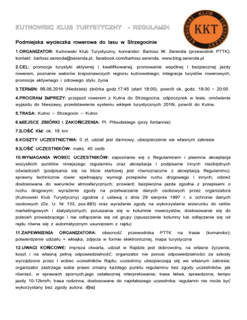 KUTNOWSKI KLUB TURYSTYCZNY - REGULAMIN Podmiejska wycieczka rowerowa do lasu w Strzegocinie 1.ORGANIZATOR: Kutnowski Klub Turystyczny, komandor: Bartosz W. Serenda (przewodnik PTTK); kontakt: [email protected], facebook.com/bartosz.serenda, www.blog.serenda.pl 2.CEL: promocja turystyki aktywnej i kwalifikowanej, promowanie wspólnej i bezpiecznej jazdy rowerem, poznanie walorów krajoznawczych regionu kutnowskiego; integracja turystów rowerowych, promocja aktywnego i zdrowego stylu życia 3.TERMIN: 05.06.2016 (Niedziela) zbiórka godz.17:45 (start 18:00), powrót ok. godz. 19:30 – 20:00 4.PROGRAM IMPREZY: przejazd rowerem z Kutna do Strzegocina, odpoczynek w lesie, omówienie wyjazdu do Nieszawy, przedstawienie systemu wklejek turystycznych 2016r, powrót do Kutna. 5.TRASA: Kutno – Strzegocin – Kutno 6.MIEJSCE ZBIÓRKI i ZAKOŃCZENIA: Pl. Piłsudskiego (przy fontannie) 7.ILOŚĆ KM: ok. 18 km 8.KOSZTY UCZESTNICTWA: 0 zł, udział jest darmowy; ubezpieczenie we własnym zakresie 9.ILOŚĆ UCZESTNIKÓW: maks. 45 osób 10.WYMAGANIA WOBEC UCZESTNIKÓW: zapoznanie się z Regulaminem i pisemna akceptacja wszystkich punktów niniejszego regulaminu oraz akceptacja i podpisanie innych niezbędnych oświadczeń (podpisania się na liście startowej jest równoznaczne z akceptacją Regulaminu); sprawny technicznie rower spełniający wymogi przepisów ruchu drogowego i innych; odzież dostosowana do warunków atmosferycznych; prowiant; bezpieczna jazda zgodna z przepisami o ruchu drogowym; wyrażenie zgody na przetwarzanie danych osobowych przez organizatora (Kutnowski Klub Turystyczny) zgodnie z ustawą z dnia 29 sierpnia 1997 r. o ochronie danych osobowych (Dz. U. Nr 133, poz.883) oraz wyrażenie zgody na wykorzystanie wizerunku do celów marketingowych i statystycznych; poruszania się w kolumnie rowerzystów, dostosowanie się do poleceń prowadzącego i nie odłączanie się od grupy (opuszczenie kolumny lub odłączenie się od rajdu równa się z automatycznym usunięciem z rajdu) 11.ZAPEWNIENIA ORGANIZATORA: obecność przewodnika PTTK na trasie (komandor); potwierdzenie udziału + wklejka, zdjęcia w formie elektronicznej, mapa turystyczna 12.UWAGI KOŃCOWE: impreza otwarta, udział w Rajdzie jest dobrowolny, na własne życzenie, koszt i na własną pełną odpowiedzialność; organizator nie ponosi odpowiedzialności za szkody wyrządzone przez i wobec uczestników Rajdu; uczestnicy ubezpieczają się we własnym zakresie; organizator zastrzega sobie prawo zmiany każdego punktu regulaminu bez zgody uczestników, jak również, w sprawach spornych,jego ostatecznej interpretowania; trasa łatwa, sprawdzona, tempo jazdy 10-12km/h; trasa rodzinna, dostosowane do najsłabszego uczestnika; regulamin nie może być wykorzystany bez zgody autora. /(bs)