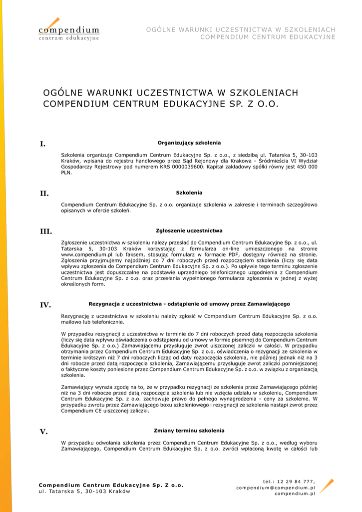 O G Ó LN E WAR UNK I U CZ ES T N ICT WA W SZ KO L E N IA C H CO M P EN D IUM C E N T RUM ED UK A CYJ N E OGÓLNE WARUNKI UCZESTNICTWA W SZKOLENIACH COMPENDIUM CENTRUM EDUKACYJNE SP. Z O.O. I. Organizujący szkolenia Szkolenia organizuje Compendium Centrum Edukacyjne Sp. z o.o., z siedzibą ul. Tatarska 5, 30-103 Kraków, wpisana do rejestru handlowego przez Sąd Rejonowy dla Krakowa - Śródmieścia VI Wydział Gospodarczy Rejestrowy pod numerem KRS 0000039600. Kapitał zakładowy spółki równy jest 450 000 PLN. II. Szkolenia Compendium Centrum Edukacyjne Sp. z o.o. organizuje szkolenia w zakresie i terminach szczegółowo opisanych w ofercie szkoleń. III. Zgłoszenie uczestnictwa Zgłoszenie uczestnictwa w szkoleniu należy przesłać do Compendium Centrum Edukacyjne Sp. z o.o., ul. Tatarska 5, 30-103 Kraków korzystając z formularza on-line umieszczonego na stronie www.compendium.pl lub faksem, stosując formularz w formacie PDF, dostępny również na stronie. Zgłoszenia przyjmujemy najpóźniej do 7 dni roboczych przed rozpoczęciem szkolenia (liczy się data wpływu zgłoszenia do Compendium Centrum Edukacyjne Sp. z o.o.). Po upływie tego terminu zgłoszenie uczestnictwa jest dopuszczalne na podstawie uprzedniego telefonicznego uzgodnienia z Compendium Centrum Edukacyjne Sp. z o.o. oraz przesłania wypełnionego formularza zgłoszenia w jednej z wyżej określonych form. IV. Rezygnacja z uczestnictwa - odstąpienie od umowy przez Zamawiającego Rezygnację z uczestnictwa w szkoleniu należy zgłosić w Compendium Centrum Edukacyjne Sp. z o.o. mailowo lub telefonicznie. W przypadku rezygnacji z uczestnictwa w terminie do 7 dni roboczych przed datą rozpoczęcia szkolenia (liczy się data wpływu oświadczenia o odstąpieniu od umowy w formie pisemnej do Compendium Centrum Edukacyjne Sp. z o.o.) Zamawiającemu przysługuje zwrot uiszczonej zaliczki w całości. W przypadku otrzymania przez Compendium Centrum Edukacyjne Sp. z o.o. oświadczenia o rezygnacji ze szkolenia w terminie krótszym niż 7 dni roboczych licząc od daty rozpoczęcia szkolenia, nie później jednak niż na 3 dni robocze przed datą rozpoczęcia szkolenia, Zamawiającemu przysługuje zwrot zaliczki pomniejszonej o faktyczne koszty poniesione przez Compendium Centrum Edukacyjne Sp. z o.o. w związku z organizacją szkolenia. Zamawiający wyraża zgodę na to, że w przypadku rezygnacji ze szkolenia przez Zamawiającego później niż na 3 dni robocze przed datą rozpoczęcia szkolenia lub nie wzięcia udziału w szkoleniu, Compendium Centrum Edukacyjne Sp. z o.o. zachowuje prawo do pełnego wynagrodzenia - ceny za szkolenie. W przypadku zwrotu przez Zamawiającego boxu szkoleniowego i rezygnacji ze szkolenia nastąpi zwrot przez Compendium CE uiszczonej zaliczki. V. Zmiany terminu szkolenia W przypadku odwołania szkolenia przez Compendium Centrum Edukacyjne Sp. z o.o., według wyboru Zamawiającego, Compendium Centrum Edukacyjne Sp. z o.o. zwróci wpłaconą kwotę w całości lub Compendium Centrum Edukacyjne Sp. Z o.o. u l . Ta t a r s k a 5 , 3 0 - 1 0 3 K r a k ó w te l.: 12 29 84 777 , compe ndiu m@compen diu m.pl compendium.pl O G Ó LN E WAR UNK I U CZ ES T N ICT WA W SZ KO L E N IA C H CO M P EN D IUM C E N T RUM ED UK A CYJ N E przeprowadzi szkolenie w innym wskazanym przez siebie terminie. Compendium Centrum Edukacyjne Sp. z o.o. zastrzega sobie prawo do zmiany cen i programu szkolenia o czym poinformuje Zamawiającego przynajmniej na 3 dni naprzód przed terminem szkolenia. Zamawiający w takim wypadku może zrezygnować ze szkolenia uzyskując zwrot wpłaconej zaliczki bez obowiązku pokrycia kosztów szkolenia. Zgłaszający ma prawo zmieniać osoby delegowane na szkolenie do chwili jego rozpoczęcia. VI. Ceny szkoleń i warunki płatności Ceny szkoleń obejmują: koszt szkolenia, komplet materiałów szkoleniowych, certyfikat, koszt posiłków (przerwy na kawę, lunch). Nie obejmują kosztów zakwaterowania. W przypadku szkoleń z tabletami CTAB ich koszt jest zawarty w cenie szkolenia. Ceny szkoleń podane są w złotych polskich. W przypadku cen podanych w USD lub EURO przeliczane są one na PLN wg kursu średniego ogłoszonego przez Prezesa NBP, obowiązującego w ostatnim dniu roboczym poprzedzającym dzień wystawienia faktury. Zamawiający, w związku z przystąpieniem przez Compendium Centrum Edukacyjne Sp. z o.o. do świadczenia usług w terminie do 10 dni od zawarcia umowy, a najpóźniej do 7 dni roboczych przed datą rozpoczęcia szkolenia uiszcza zaliczkę na poczet szkolenia w wysokości 40% ceny szkolenia. Pozostałą część wynagrodzenia tj. 60 % ceny szkolenia w terminie 7 dni po odbyciu szkolenia. Brak uiszczenia zaliczki w wymaganym terminie stanowi domniemaną rezygnację ze szkolenia i upoważnia Compendium Centrum Edukacyjne Sp. z o.o. do nieświadczenia usług dla Zamawiającego. W przypadku szkoleń w wersji Distance Learning wysyłka zestawów z materiałami (tj. kamerą internetową, słuchawkami i mikrofonem oraz materiałami szkoleniowymi w formie tradycyjnej lub CTAB) nastąpi po uiszczeniu 40% zaliczki na poczet szkolenia w Compendium CE. 40% zaliczka nie podlega zwrotowi w przypadku rezygnacji lub nie wzięcia udziału w szkoleniu przez Zamawiającego. W takim przypadku Zamawiający ma prawo rezerwacji innego terminu Distance Learning danego szkolenia w ramach uiszczonej zaliczki. VII. Rabaty Dla grup i stałych partnerów proponujemy atrakcyjne zniżki. Udzielane rabaty nie sumują się oraz nie można ich łączyć z innymi promocjami. Rabat nie może być zamieniony na gotówkę. W przypadku szkoleń wewnętrznych dla firm obowiązywać będą indywidualne ustalenia. Ceny szkoleń z tabletami CTAB nie podlegają rabatom, w przypadku szkoleń dedykowanych dla firm obowiązywać będą indywidualne ustalenia. VIII. Ochrona danych osobowych Zgodnie z Ustawą o ochronie danych osobowych z dnia 29 sierpnia 1997 roku (Dz. U. 133 z dnia 29 października 1997 roku 
