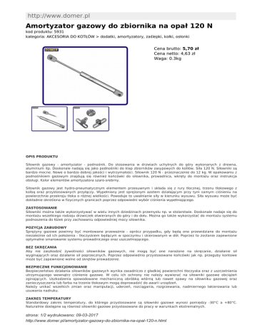 http://www.domer.pl Amortyzator gazowy do zbiornika na opał 120 N kod produktu: 5931 kategoria: AKCESORIA DO KOTŁÓW > dodatki, amortyzatory, zaślepki, kołki, osłonki Cena brutto: 5,70 zł Cena netto: 4,63 zł Waga: 0.3kg OPIS PRODUKTU Siłownik gazowy - amortyzator - podnośnik. Do stosowania w drzwiach uchylnych do góry wykonanych z drewna, aluminium itp. Doskonale nadają się jako podnośniki do klap zbiorników zasypowych do kotłów. Siła 120 N. Siłowniki są bardzo mocne. Nowe o bardzo dobrej jakości i wytrzymałości. Siłownik 120 N - przeznaczenie do 12 kg. W opakowaniu z podnośnikiem gazowym znajdują się również końcówki do siłownika, prowadnica, wkręty do montażu oraz instrukcja obsługi. Kolor elementów amortyzatora szaro-srebrny. Siłownik gazowy jest hydro-pneumatycznym elementem przesuwnym i składa się z rury tłocznej, trzonu tłokowego z kolbą oraz przystosowanych przyłączy. Wypełniony jest sprężonym azotem działającym przy tym samym ciśnieniu na powierzchnie przekroju tłoka o różnej wielkości. Powoduje to uwalnianie siły w kierunku wysuwu. Siła wysuwu może być dokładnie określona w fizycznych granicach poprzez odpowiedni wybór ciśnienia wypełniającego. ZASTOSOWANIE Siłowniki można także wykorzystywać w wielu innych dziedzinach przemysłu np. w stolarstwie. Doskonale nadaje się do montażu wszelkiego rodzaju drzwiczek otwieranych do góry i do dołu. Można go także wykorzystać do montażu systemu podnoszenia do łóżek przy zachowaniu odpowiedniej mocy siłownika. POZYCJA ZABUDOWY Sprężyny gazowe powinny być montowane przeważnie - oprócz przypadku, gdy będą one przewidziane do montażu niezależnie od ich położenia - tłoczyskiem będącym w spoczynku i skierowanym w dół. Poprzez to zostanie zapewnione optymalne smarowanie systemu prowadniczego oraz uszczelniającego. BEZ SKRĘCANIA Aby nie zaszkodzić żywotności siłowników gazowych, nie mogą być one narażone na skręcanie, działanie sił wyginających oraz działanie sił poprzecznych. Poprzez odpowiednio przystosowane końcówki jak np. przeguby kontowe może być zapewnione wolne od skrętów prowadzenie. BEZPIECZNE FUNKCJONOWANIE Bezpieczeństwo działania siłowników gazowych wynika zasadniczo z gładkiej powierzchni tłoczyska oraz z uszczelnienia utrzymującego wewnątrz ciśnienie gazowe. W celu ich ochrony nie należy wywierać na siłowniki gazowe obciążeń zginających. Uszkodzenia spowodowane mechaniczną obróbką wtórną lub nawet spawy na siłowniku gazowej oraz zanieczyszczenia lub farba na trzonie tłokowym mogą doprowadzić do awarii urządzeń. Należy unikać wszelkich zmian oraz manipulacji, uderzeń, rozciągania, rozgrzewania, nadmiernego lakierowania lub usuwania nadruku. ZAKRES TEMPERATURY Standardowy zakres temperatury, do którego przystosowane są siłowniki gazowe wynosi pomiędzy -30°C a +80°C. Naturalnie dostępne są również siłowniki gazowe przystosowane do pracy w warunkach ekstremalnych. strona: 1/2 wydrukowano: 09-03-2017 http://www.domer.pl/amortyzator-gazowy-do-zbiornika-na-opal-120-n.html ŻYWOTNOŚĆ I KONSERWACJA Siłowniki gazowe nie muszą być konserwowane. Nie wymagają one takiej konserwacji jak smarowanie olejami czy też smarami. Przystosowane są zawsze do danych wymagań i działają przez wiele lat bez zakłóceń. USUWANIE W przypadku, gdy siłowniki gazowe są już bezużyteczne, należy się ich pozbyć mając na względzie ochronę środowiska naturalnego. Dlatego zostały one specjalnie nawiercone, aby uwolnić sprężony azot oraz zawarty w nich olej. WYMIARY SIŁOWNIKA - w pozycji otwartej: 27 cm - w pozycji zamkniętej: 18,5 cm - średnica tłoczka: 1,5 cm - skok tłoczka: 9 cm strona: 2/2 wydrukowano: 09-03-2017 http://www.domer.pl/amortyzator-gazowy-do-zbiornika-na-opal-120-n.html