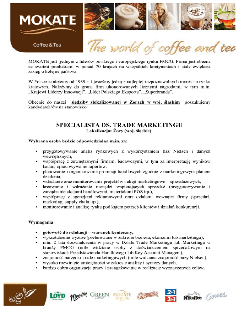 ! MOKATE jest jednym z liderów polskiego i europejskiego rynku FMCG. Firma jest obecna ze swoimi produktami w ponad 70 krajach na wszystkich kontynentach i stale zwiększa zasięg o kolejne państwa.! W Polsce istniejemy od 1989 r. i jesteśmy jedną z najlepiej rozpoznawalnych marek na rynku krajowym. Należymy do grona firm uhonorowanych licznymi nagrodami, w tym m.in. „Krajowi Liderzy Innowacji”, „Lider Polskiego Eksportu”, „Superbrands”. Obecnie do naszej siedziby zlokalizowanej w Żorach w woj. śląskim kandydatek/ów na stanowisko: poszukujemy SPECJALISTA DS. TRADE MARKETINGU Lokalizacja: Żory (woj. śląskie) Wybrana osoba będzie odpowiedzialna m.in. za: • • • • • • • przygotowywanie analiz rynkowych z wykorzystaniem baz Nielsen i danych wewnętrznych, współpracę z zewnętrznymi firmami badawczymi, w tym za interpretację wyników badań, opracowywanie raportów, planowanie i organizowanie promocji handlowych zgodnie z marketingowym planem działania, wdrażanie oraz monitorowanie projektów i akcji marketingowo – sprzedażowych, kreowanie i wdrażanie narzędzi wspierających sprzedaż (przygotowywanie i zarządzanie akcjami handlowymi, materiałami POS itp.), współpracę z agencjami reklamowymi oraz działami wewnątrz firmy (sprzedaż, marketing, supply chain itp.), monitorowanie i analizę rynku pod kątem potrzeb klientów i działań konkurencji. Wymagania: • • • • • • ! gotowość do relokacji – warunek konieczny, wykształcenie wyższe (preferowane w zakresie biznesu, ekonomii lub marketingu), min. 2 lata doświadczenia w pracy w Dziale Trade Marketingu lub Marketingu w branży FMCG (mile widziane osoby z doświadczeniem sprzedażowym na stanowiskach Przedstawiciela Handlowego lub Key Account Managera), znajomość narzędzi trade marketingowych (mile widziana znajomość bazy Nielsen), wysoko rozwinięte umiejętności w zakresie analizy i syntezy danych, bardzo dobra organizacja pracy i zaangażowanie w realizację wyznaczonych celów, ! • • • • dobra znajomość języka angielskiego, umiejętność łączenia różnych działań w celu osiągnięcia spójnego podejścia do zagadnień i wyników, umiejętność pracy w zespole, bardzo dobrą znajomość obsługi komputera ze szczególnym uwzględnieniem MS Excel oraz Power Point. Osoby zainteresowane uprzejmie prosimy o przesyłanie CV [email protected] podając w tytule maila nazwę stanowiska. na adres e-mail: Uprzejmie informujemy, że skontaktujemy się wyłącznie z wybranymi osobami. Prosimy o dopisanie następującej w CV klauzuli „Wyrażam zgodę na przetwarzanie moich danych osobowych dla potrzeb niezbędnych dla realizacji procesu rekrutacji (zgodnie z ustawą z dn. 29.08.97 roku o Ochronie Danych Osobowych Dz. Ust Nr 133 poz. 883)”. ! !