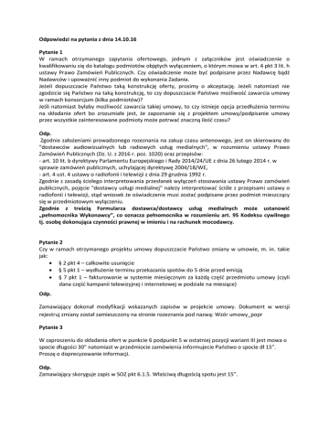 Odpowiedzi na pytania z dnia 14.10.16 Pytanie 1 W ramach otrzymanego zapytania ofertowego, jednym z załączników jest oświadczenie o kwalifikowaniu się do katalogu podmiotów objętych wyłączeniem, o którym mowa w art. 4 pkt 3 lit. h ustawy Prawo Zamówień Publicznych. Czy oświadczenie może być podpisane przez Nadawcę bądź Nadawców i upoważnić inny podmiot do wykonania Zadania. Jeżeli dopuszczacie Państwo taką konstrukcję oferty, prosimy o akceptację. Jeżeli natomiast nie zgodzicie się Państwo na taką konstrukcję, to czy dopuszczacie Państwo możliwość zawarcia umowy w ramach konsorcjum (kilka podmiotów)? Jeśli natomiast byłaby możliwość zawarcia takiej umowy, to czy istnieje opcja przedłużenia terminu na składanie ofert bo zrozumiałe jest, że zapoznanie się z projektem umowy/podpisanie umowy przez wszystkie zainteresowane podmioty może potrwać znaczną ilość czasu? Odp. Zgodnie założeniami prowadzonego rozeznania na zakup czasu antenowego, jest on skierowany do "dostawców audiowizualnych lub radiowych usług medialnych", w rozumieniu ustawy Prawo Zamówień Publicznych (Dz. U. z 2016 r. poz. 1020) oraz przepisów: - art. 10 lit. b dyrektywy Parlamentu Europejskiego i Rady 2014/24/UE z dnia 26 lutego 2014 r. w sprawie zamówień publicznych, uchylającej dyrektywę 2004/18/WE, - art. 4 ust. 4 ustawy o radiofonii i telewizji z dnia 29 grudnia 1992 r. Zgodnie z zasadą ścisłego interpretowania przesłanek wyłączeń stosowania ustawy Prawo zamówień publicznych, pojęcie "dostawcy usługi medialnej" należy interpretować ściśle z przepisami ustawy o radiofonii i telewizji, stąd wniosek że oświadczenie musi zostać podpisane przez podmiot mieszczący się w przedmiotowym wyłączeniu. Zgodnie z treścią Formularza dostawca/dostawcy usług medialnych może ustanowić „pełnomocnika Wykonawcy”, co oznacza pełnomocnika w rozumieniu art. 95 Kodeksu cywilnego tj. osobę dokonująca czynności prawnej w imieniu i na rachunek mocodawcy. Pytanie 2 Czy w ramach otrzymanego projektu umowy dopuszczacie Państwo zmiany w umowie, m. in. takie jak: § 2 pkt 4 – całkowite usunięcie § 5 pkt 1 – wydłużenie terminu przekazania spotów do 5 dnie przed emisją § 7 pkt 1 – fakturowanie w systemie miesięcznym za każdą część przedmiotu umowy (czyli dana część kampanii telewizyjnej i internetowej w podziale na miesiące) Odp. Zamawiający dokonał modyfikacji wskazanych zapisów w projekcie umowy. Dokument w wersji rejestruj zmiany został zamieszczony na stronie rozeznania pod nazwą: Wzór umowy_popr Pytanie 3 W zaproszeniu do składania ofert w punkcie 6 podpunkt 5 w ostatniej pozycji wariant III jest mowa o spocie długości 30” natomiast w przedmiocie zamówienia informujecie Państwo o spocie dł 15”. Proszę o doprecyzowanie informacji. Odp. Zamawiający skoryguje zapis w SOZ pkt 6.1.5. Właściwą długością spotu jest 15”.