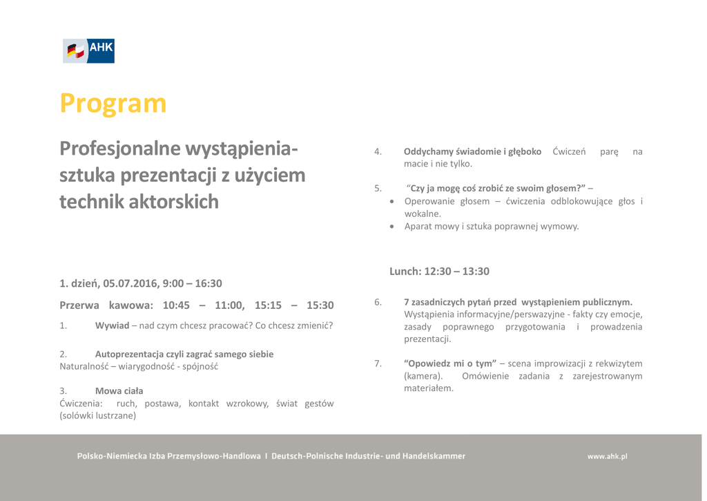 Program Profesjonalne wystąpieniasztuka prezentacji z użyciem technik aktorskich 4. Oddychamy świadomie i głęboko macie i nie tylko. 5. “Czy ja mogę coś zrobić ze swoim głosem?” – Operowanie głosem – ćwiczenia odblokowujące głos i wokalne. Aparat mowy i sztuka poprawnej wymowy. Ćwiczeń parę na Lunch: 12:30 – 13:30 1. dzień, 05.07.2016, 9:00 – 16:30 Przerwa kawowa: 10:45 – 11:00, 15:15 – 15:30 1. 6. 7 zasadniczych pytań przed wystąpieniem publicznym. Wystąpienia informacyjne/perswazyjne - fakty czy emocje, zasady poprawnego przygotowania i prowadzenia prezentacji. 7. “Opowiedz mi o tym” – scena improwizacji z rekwizytem (kamera). Omówienie zadania z zarejestrowanym materiałem. Wywiad – nad czym chcesz pracować? Co chcesz zmienić? 2. Autoprezentacja czyli zagrać samego siebie Naturalność – wiarygodność - spójność 3. Mowa ciała Ćwiczenia: ruch, postawa, kontakt wzrokowy, świat gestów (solówki lustrzane) 2. dzień, 06.07.2016, 9:00 – 16:30 Przerwa kawowa: 10:45 – 11:00, 15:15 – 15:30 Trener Aleksander Wysocki 1. Stres – przekleństwo czy błogosławieństwo? Ćwiczenia oddechowe i relaksacyjne. Moc słowa – dialog wewnętrzny. Nie strasz siebie myślami! Wizualizacja, autoafirmacje, uważność i słów parę o medytacji. Relaksacja Jacobsona i trening autogenny Schultza. 2. Wystąpienie na dowolnie wybrany temat (ok. 6 min.) Omówienie wystąpień Lunch: 12:30 – 13:30 3. Wiarygodność czyli jak zdobyć zaufanie słuchaczy? 4. Sekrety żywego słowa. Intencja - akcent - pauza - pointowanie myśli - tempo intonacja - ekspresja - dramaturgia. 5. Ćwiczeń retorycznych ciąg dalszy. 6. Podsumowanie Absolwent PWST im. Ludwika Solskiego w Krakowie, wydział aktorski, mgr sztuki. Aktor scen wrocławskich: Teatru Współczesnego, Polskiego, Pantomimy, Teatru Studio w Warszawie i Transformtheater w Berlinie. Praca w filmach, teatrach TV, serialach telewizyjnych, nagrania radiowe, nagrania do gier komputerowych, praca w dubbingu. Doświadczenia pedagogiczne i szkoleniowe zdobywał ucząc na wydziale aktorskim wrocławskiej PWST, prowadząc warsztaty teatralne oraz kursy retoryki. Współpracował, jako wykładowca, z Wyższą Szkołą Komunikowania i Mediów Społecznych im. J. Giedroycia w Warszawie. Prowadzi zajęcia w Szkole Trenerów na Akademii Leona Koźmińskiego w Warszawie. Od 2004 roku prowadzi szkolenia z zakresu: Trening autoprezentacji. Sztuka prezentacji i wystąpień publicznych – techniki aktorskie. Komunikacja interpersonalna – obsługa klienta. Prowadził lub współprowadził projekty szkoleniowe m. in. dla: AHK - Polsko-Niemiecka Izba Przemysłowo-Handlowa, AXA, Grupa Żywiec, Compensa, Telekomunikacja Polska, Oriflame, Poczta Polska, PKO BP, Orlen, Grupa LUX MED, ACME Partners, Mitsubishi - Polska, Ministerstwo Spraw Zagranicznych ( Polski Instytut Dyplomacji)