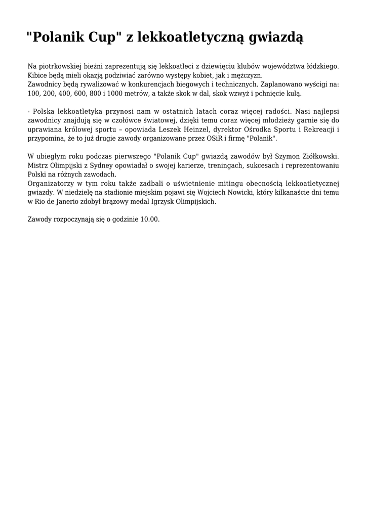 "Polanik Cup" z lekkoatletyczną gwiazdą Na piotrkowskiej bieżni zaprezentują się lekkoatleci z dziewięciu klubów województwa łódzkiego. Kibice będą mieli okazją podziwiać zarówno występy kobiet, jak i mężczyzn. Zawodnicy będą rywalizować w konkurencjach biegowych i technicznych. Zaplanowano wyścigi na: 100, 200, 400, 600, 800 i 1000 metrów, a także skok w dal, skok wzwyż i pchnięcie kulą. - Polska lekkoatletyka przynosi nam w ostatnich latach coraz więcej radości. Nasi najlepsi zawodnicy znajdują się w czołówce światowej, dzięki temu coraz więcej młodzieży garnie się do uprawiana królowej sportu – opowiada Leszek Heinzel, dyrektor Ośrodka Sportu i Rekreacji i przypomina, że to już drugie zawody organizowane przez OSiR i firmę "Polanik". W ubiegłym roku podczas pierwszego "Polanik Cup" gwiazdą zawodów był Szymon Ziółkowski. Mistrz Olimpijski z Sydney opowiadał o swojej karierze, treningach, sukcesach i reprezentowaniu Polski na różnych zawodach. Organizatorzy w tym roku także zadbali o uświetnienie mitingu obecnością lekkoatletycznej gwiazdy. W niedzielę na stadionie miejskim pojawi się Wojciech Nowicki, który kilkanaście dni temu w Rio de Janerio zdobył brązowy medal Igrzysk Olimpijskich. Zawody rozpoczynają się o godzinie 10.00.