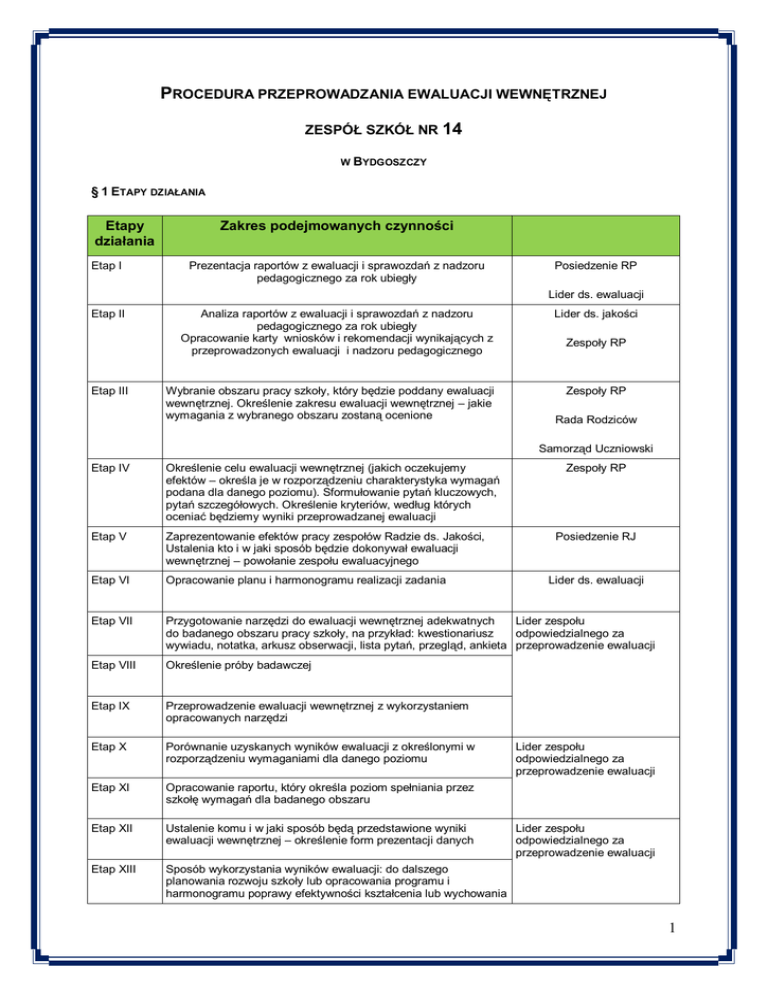 PROCEDURA PRZEPROWADZANIA EWALUACJI WEWNĘTRZNEJ ZESPÓŁ SZKÓŁ NR 14 W BYDGOSZCZY § 1 ETAPY DZIAŁANIA Etapy działania Etap I Zakres podejmowanych czynności Prezentacja raportów z ewaluacji i sprawozdań z nadzoru pedagogicznego za rok ubiegły Posiedzenie RP Lider ds. ewaluacji Etap II Etap III Analiza raportów z ewaluacji i sprawozdań z nadzoru pedagogicznego za rok ubiegły Opracowanie karty wniosków i rekomendacji wynikających z przeprowadzonych ewaluacji i nadzoru pedagogicznego Wybranie obszaru pracy szkoły, który będzie poddany ewaluacji wewnętrznej. Określenie zakresu ewaluacji wewnętrznej – jakie wymagania z wybranego obszaru zostaną ocenione Lider ds. jakości Zespoły RP Zespoły RP Rada Rodziców Samorząd Uczniowski Etap IV Określenie celu ewaluacji wewnętrznej (jakich oczekujemy efektów – określa je w rozporządzeniu charakterystyka wymagań podana dla danego poziomu). Sformułowanie pytań kluczowych, pytań szczegółowych. Określenie kryteriów, według których oceniać będziemy wyniki przeprowadzanej ewaluacji Zespoły RP Etap V Zaprezentowanie efektów pracy zespołów Radzie ds. Jakości, Ustalenia kto i w jaki sposób będzie dokonywał ewaluacji wewnętrznej – powołanie zespołu ewaluacyjnego Etap VI Opracowanie planu i harmonogramu realizacji zadania Etap VII Przygotowanie narzędzi do ewaluacji wewnętrznej adekwatnych Lider zespołu do badanego obszaru pracy szkoły, na przykład: kwestionariusz odpowiedzialnego za wywiadu, notatka, arkusz obserwacji, lista pytań, przegląd, ankieta przeprowadzenie ewaluacji Etap VIII Określenie próby badawczej Etap IX Przeprowadzenie ewaluacji wewnętrznej z wykorzystaniem opracowanych narzędzi Etap X Porównanie uzyskanych wyników ewaluacji z określonymi w rozporządzeniu wymaganiami dla danego poziomu Etap XI Opracowanie raportu, który określa poziom spełniania przez szkołę wymagań dla badanego obszaru Etap XII Ustalenie komu i w jaki sposób będą przedstawione wyniki ewaluacji wewnętrznej – określenie form prezentacji danych Etap XIII Sposób wykorzystania wyników ewaluacji: do dalszego planowania rozwoju szkoły lub opracowania programu i harmonogramu poprawy efektywności kształcenia lub wychowania Posiedzenie RJ Lider ds. ewaluacji Lider zespołu odpowiedzialnego za przeprowadzenie ewaluacji Lider zespołu odpowiedzialnego za przeprowadzenie ewaluacji 1 § 2 Procedura tworzenia zespołu ds. ewaluacji 1. Po przeprowadzonych wcześniej diagnozach, wynikach nadzoru pedagogicznego oraz zebranych informacjach od uczniów, rodziców, organu prowadzącego, organu nadzorującego, środowiska lokalnego itp. nauczyciele na radzie pedagogicznej zgłaszają problemy i obszary, które ich zdaniem są istotne oraz wymagają zmiany. Wybierają w ten sposób przedmiot ewaluacji sumującej na dany rok szkolny (sierpień). 2. Dyrektor wyznacza z grona pedagogicznego Lidera (koordynatora) ds. ewaluacji wewnętrznej, czyli osobę kompetentną, dobrze przygotowaną merytorycznie. 3. Następnie Lider organizuje (proponuje skład) zespół/zespoły nauczycieli, które będą mogły zająć się wskazanymi przedmiotami ewaluacji. Zespoły nie powinny być duże (od 2 do 5 osób). 4. Członków zespołów powołuje i zatwierdza dyrektor (wrzesień/październik). 5. Pracami koordynuje Lider (koordynator) ds. ewaluacji wewnętrznej, który przedstawia dyrektorowi do zatwierdzenia projekt ewaluacji wewnętrznej (październik). 6. Projekt ten wraz z planem i harmonogramem opracowuje zespół, natomiast narzędziami badawczymi do ewaluacji mogą zająć się samodzielnie nauczyciele, którzy są do tego przygotowani merytorycznie. 2