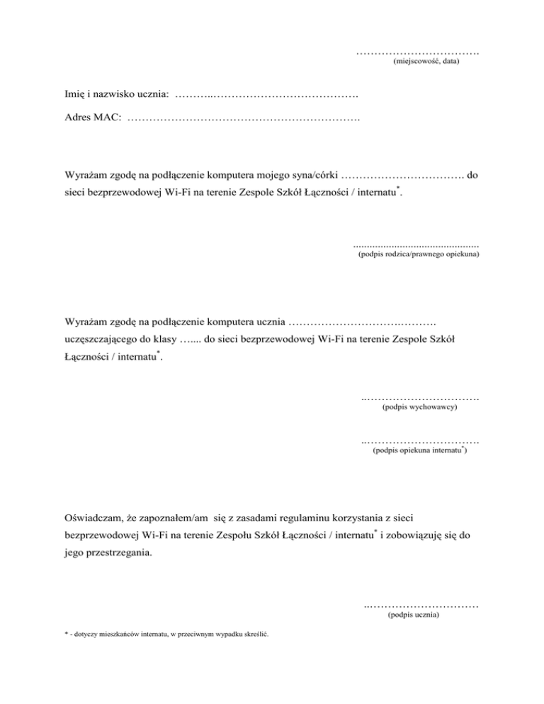 ……………………………. (miejscowość, data) Imię i nazwisko ucznia: ………..…………………………………. Adres MAC: ………………………………………………………. WyraŜam zgodę na podłączenie komputera mojego syna/córki ……………………………. do sieci bezprzewodowej Wi-Fi na terenie Zespole Szkół Łączności / internatu*. .............................................. (podpis rodzica/prawnego opiekuna) WyraŜam zgodę na podłączenie komputera ucznia ………………………….………. uczęszczającego do klasy ….... do sieci bezprzewodowej Wi-Fi na terenie Zespole Szkół Łączności / internatu*. ..…………………………. (podpis wychowawcy) ..…………………………. (podpis opiekuna internatu*) Oświadczam, Ŝe zapoznałem/am się z zasadami regulaminu korzystania z sieci bezprzewodowej Wi-Fi na terenie Zespołu Szkół Łączności / internatu* i zobowiązuję się do jego przestrzegania. ..………………………… (podpis ucznia) * - dotyczy mieszkańców internatu, w przeciwnym wypadku skreślić.