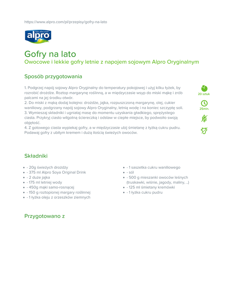 https://www.alpro.com/pl/przepisy/gofry-na-lato Gofry na lato Owocowe i lekkie gofry letnie z napojem sojowym Alpro Oryginalnym Sposób przygotowania 1. Podgrzej napój sojowy Alpro Oryginalny do temperatury pokojowej i użyj kilku łyżek, by rozrobić drożdże. Roztop margarynę roślinną, a w międzyczasie wsyp do miski mąkę i zrób palcami na jej środku otwór. 2. Do miski z mąką dodaj kolejno: drożdże, jajka, rozpuszczoną margarynę, olej, cukier waniliowy, podgrzany napój sojowy Alpro Oryginalny, letnią wodę i na koniec szczyptę soli. 3. Wymieszaj składniki i ugniataj masę do momentu uzyskania gładkiego, sprężystego ciasta. Przykryj ciasto wilgotną ściereczką i odstaw w ciepłe miejsce, by podwoiło swoją objętość. 4. Z gotowego ciasta wypiekaj gofry, a w międzyczasie ubij śmietanę z łyżką cukru pudru. Podawaj gofry z ubitym kremem i dużą ilością świeżych owoców. Składniki - 20g świeżych drożdży - 375 ml Alpro Soya Original Drink - 2 duże jajka - 175 ml letniej wody - 450g mąki samo-rosnącej - 150 g roztopionej margary roślinnej - 1 łyżka oleju z orzeszków ziemnych Przygotowano z - 1 saszetka cukru waniliowego - sól - 500 g mieszanki owoców leśnych (truskawki, wiśnie, jagody, maliny, ..) - 125 ml śmietany kremówki - 1 łyżka cukru pudru 20 sztuk 25min. Alpro Soya Oryginalny